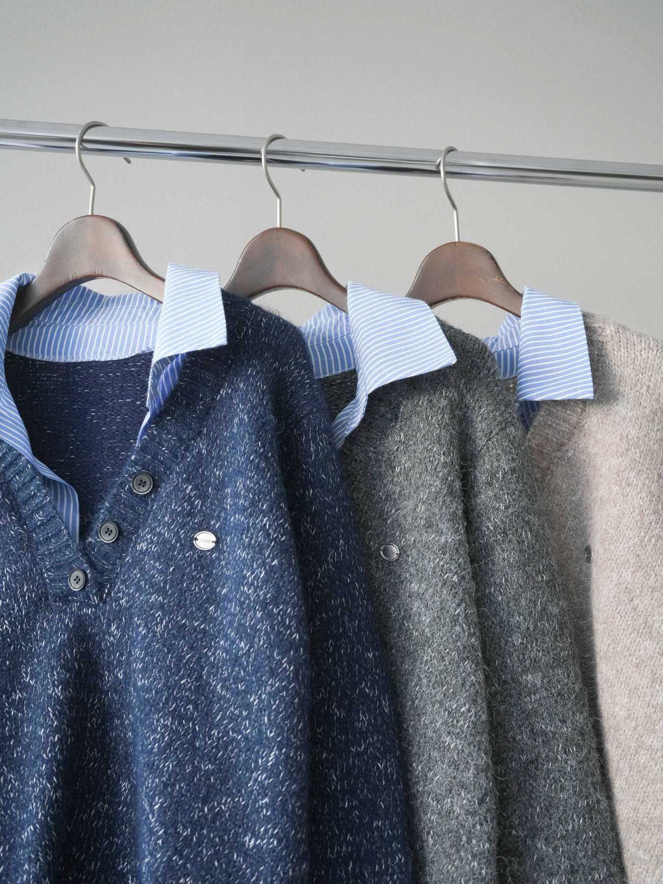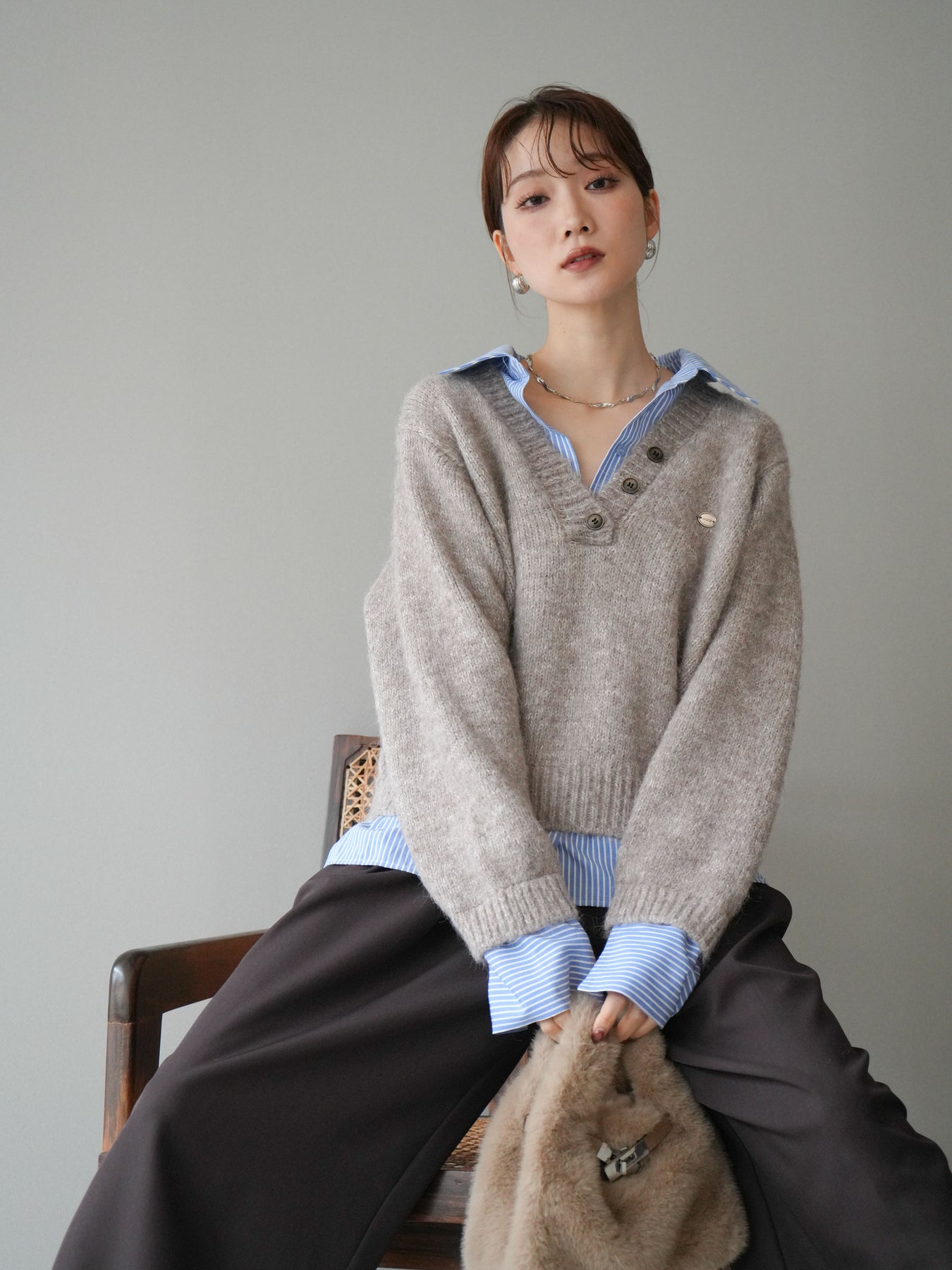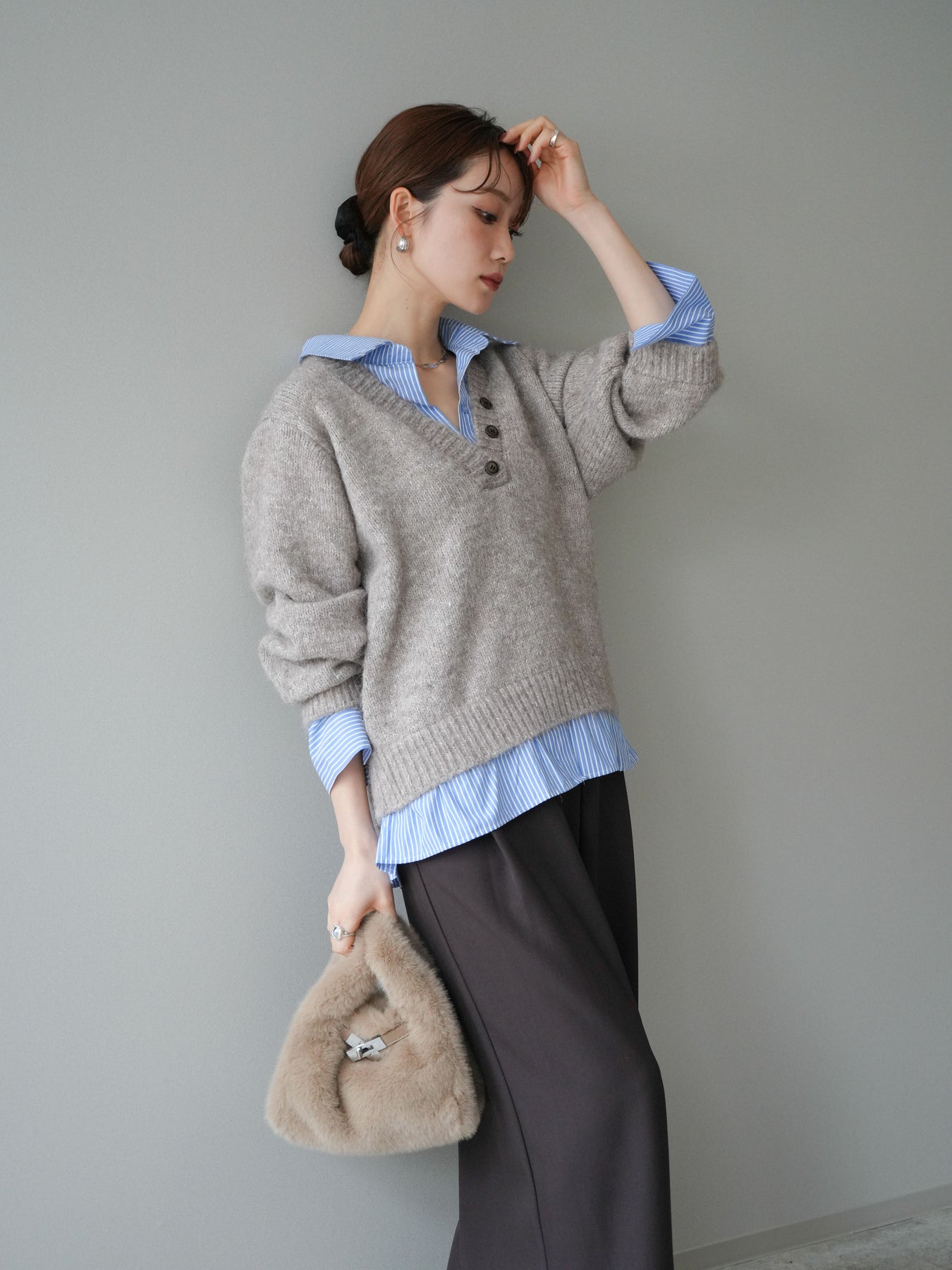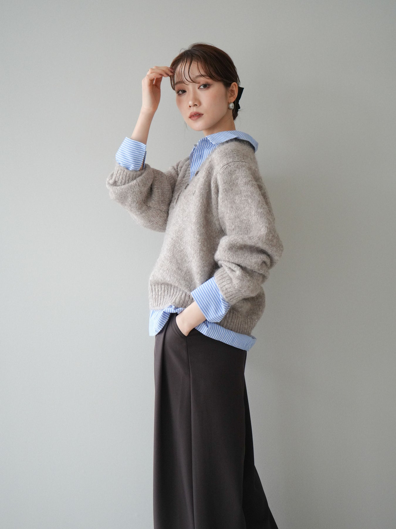 ◆ [予約]ストライプシャツドッキングMIXヤーンニットプルオーバー