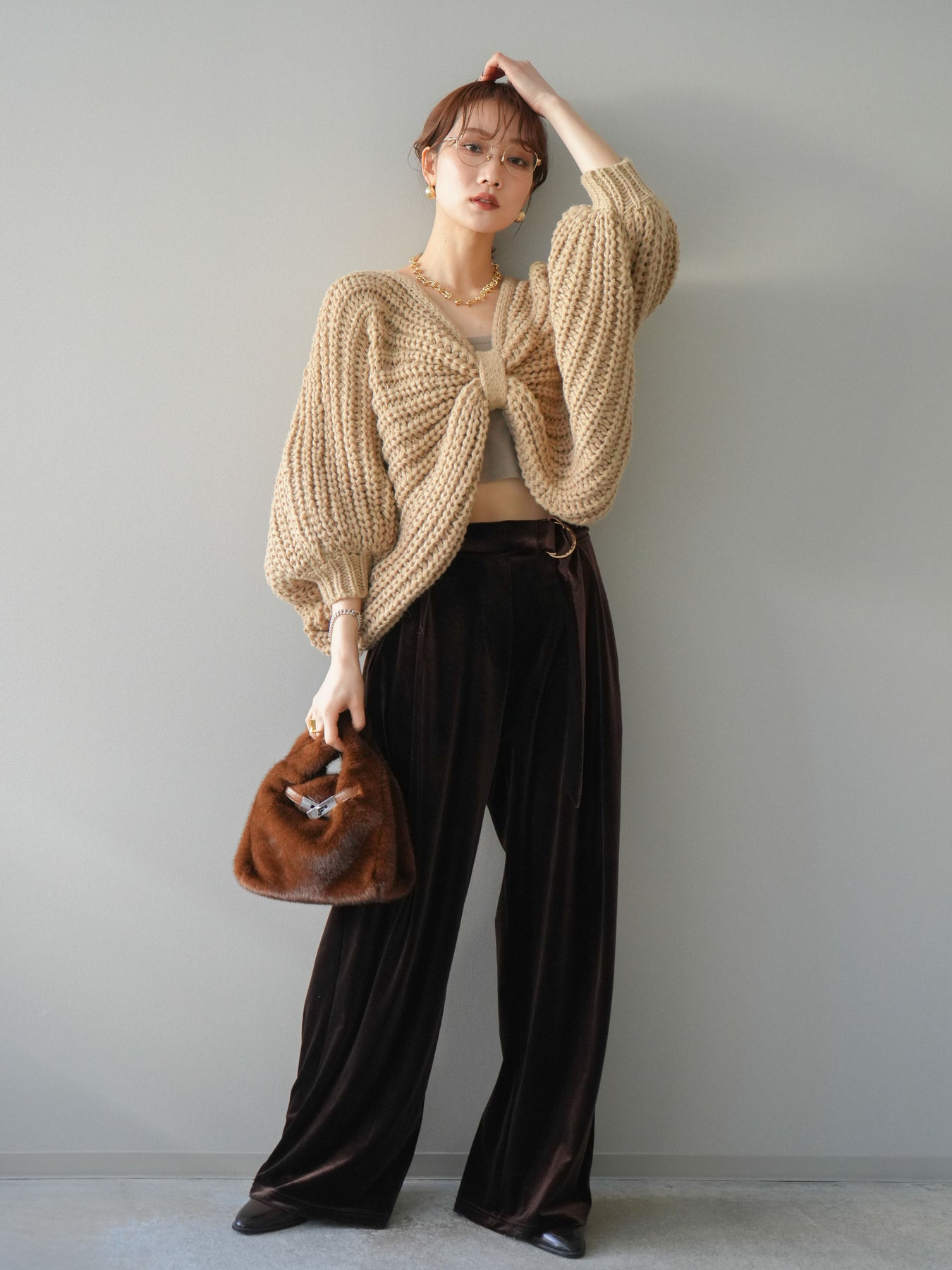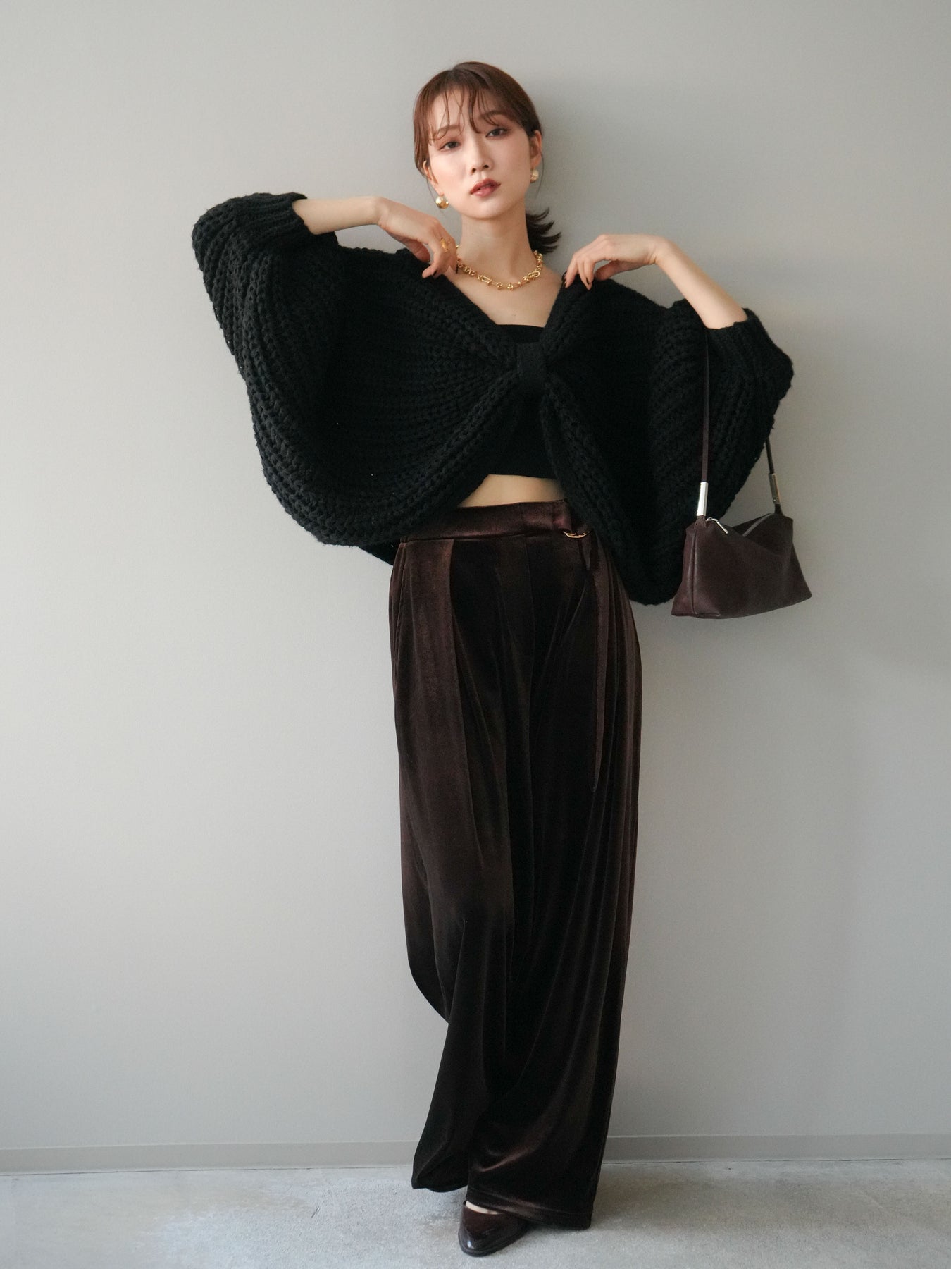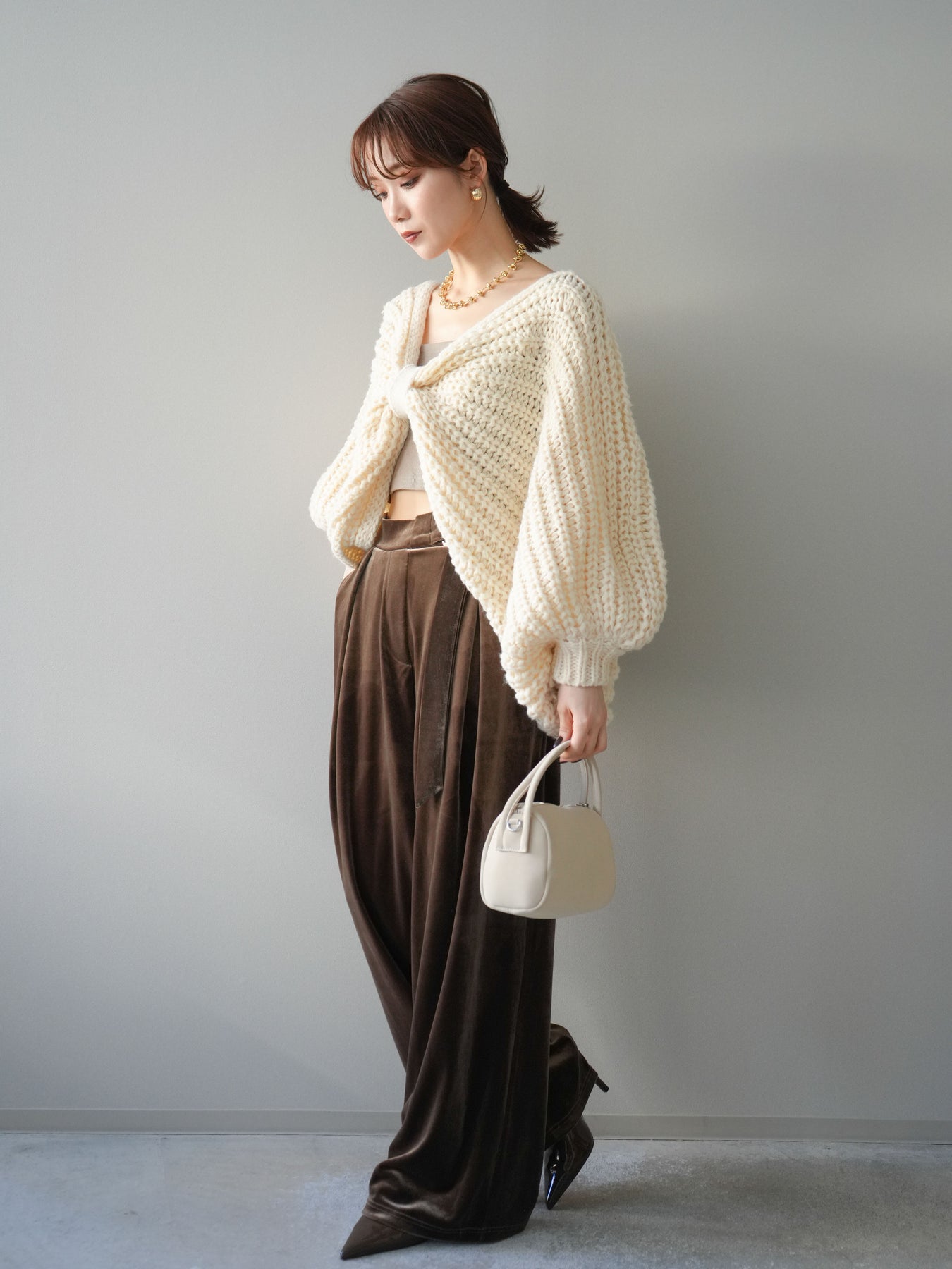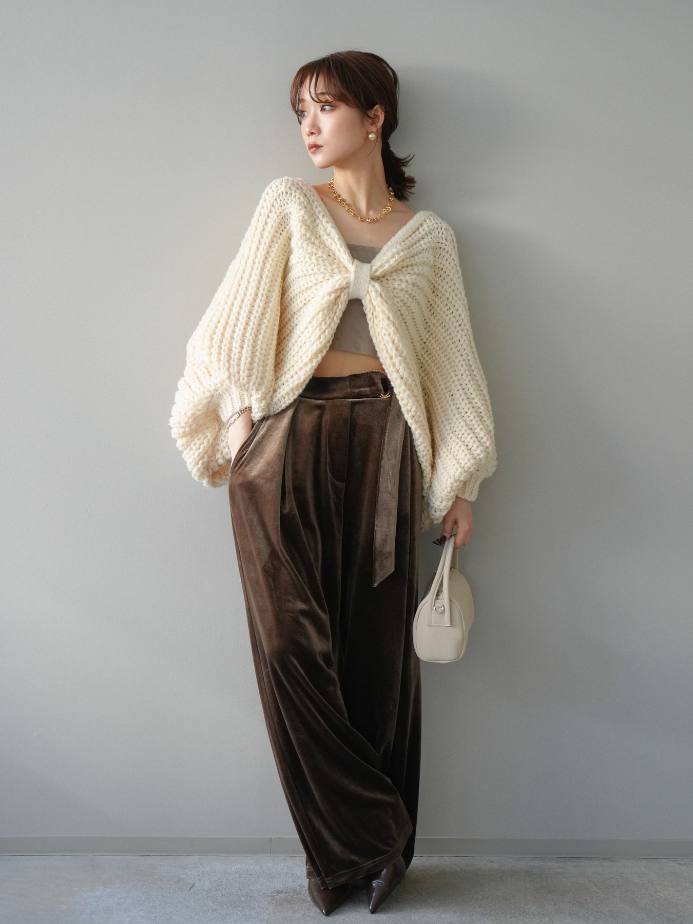 [SET]ローゲージ畦編みドルマンニットボレロ+ベロアベルトスリムパンツ(2set)