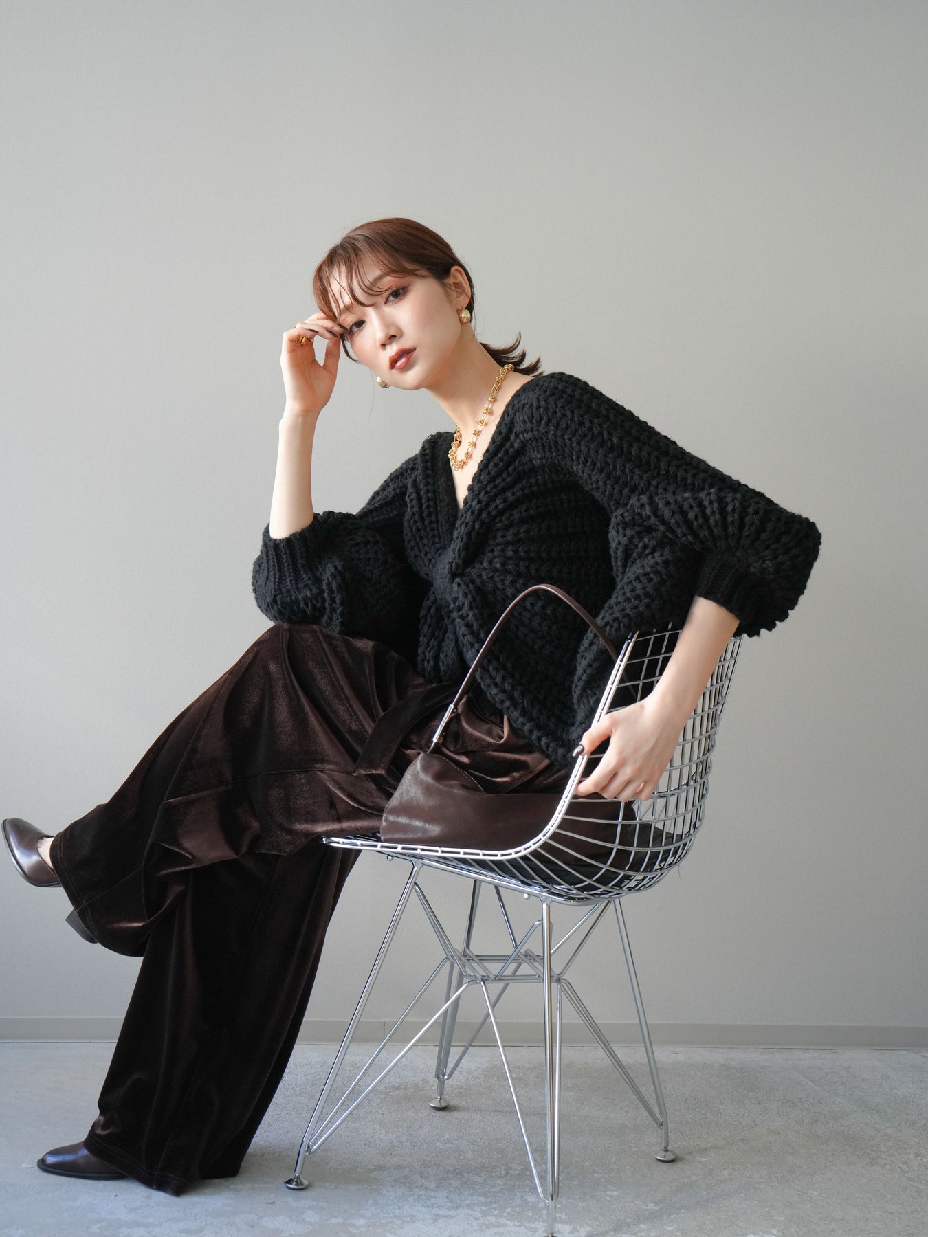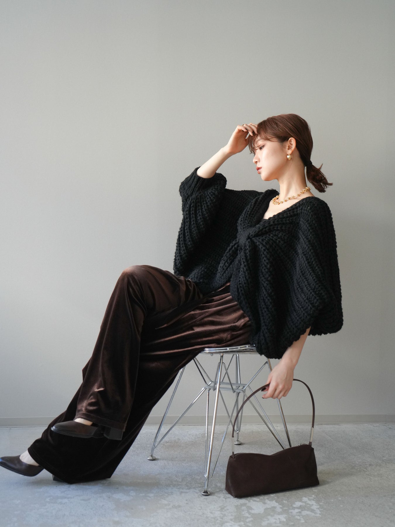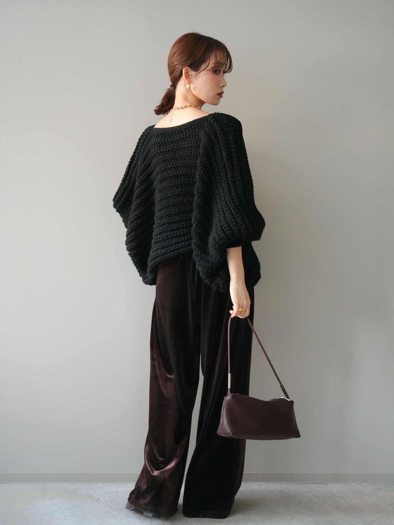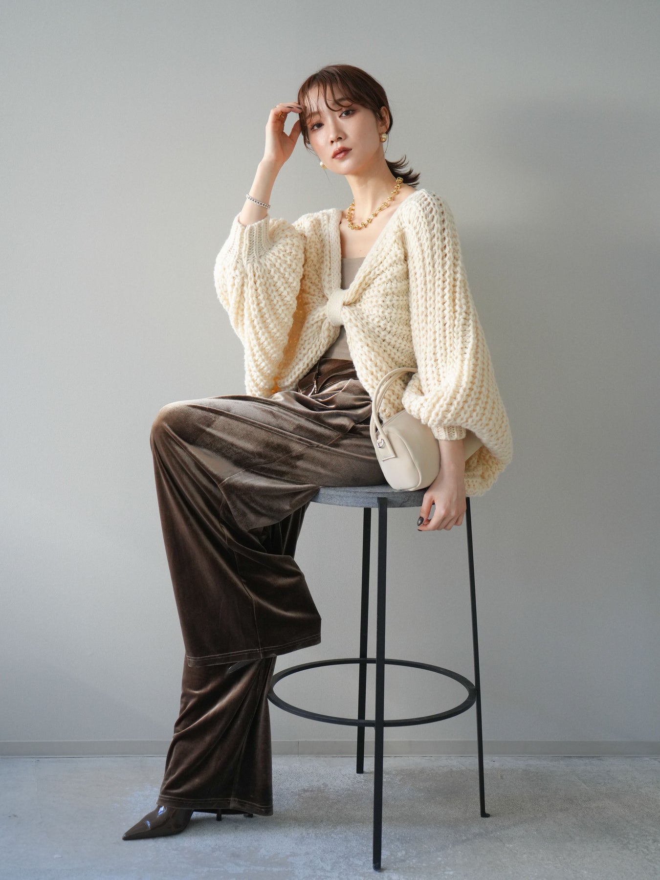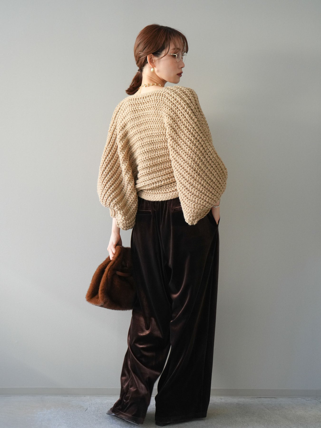[SET]ローゲージ畦編みドルマンニットボレロ+ベロアベルトスリムパンツ(2set)