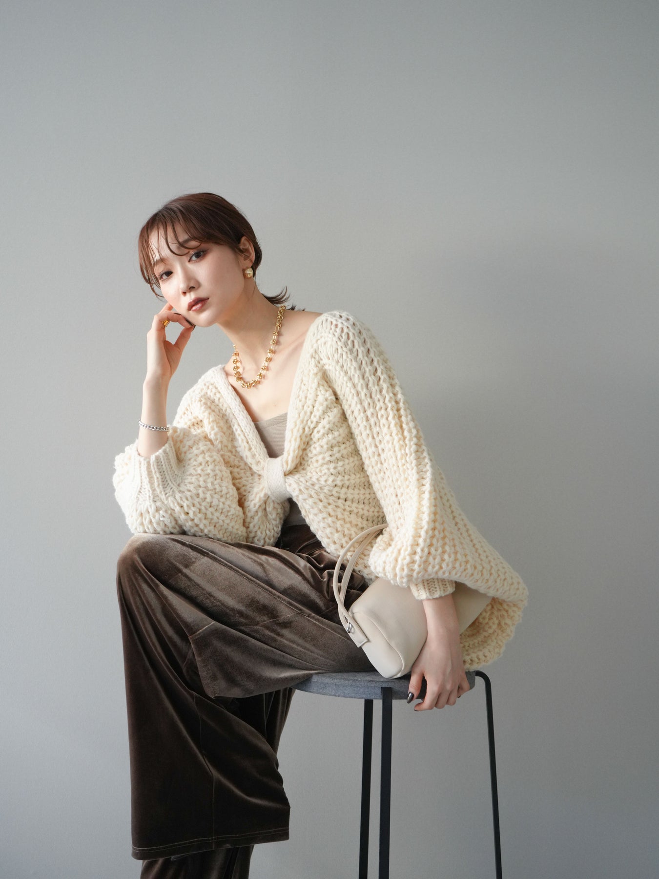 ざっくりとしたローゲージ編みが魅力のドルマンニットボレロ。 ボリュームのあるシルエットと柔らかな風合いが、こなれた印象を与えます。 ゆったりとしたドルマンスリーブが抜け感を演出し、羽織るだけでバランスの取れたスタイルに。 短めの丈感でワンピースやハイウエストボトムとも相性抜群です。 カジュアルにもフェミニンにも合わせやすく、季節の変わり目に活躍する万能な1枚です。 ※ボトムス、キャミソール(インナー)以外の商品は一律でインナーは付属していません。