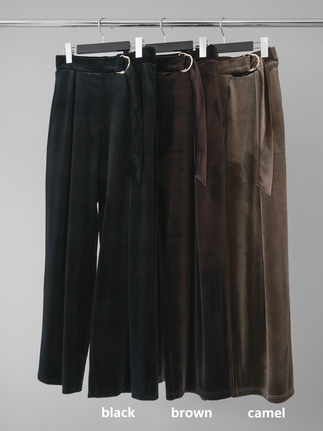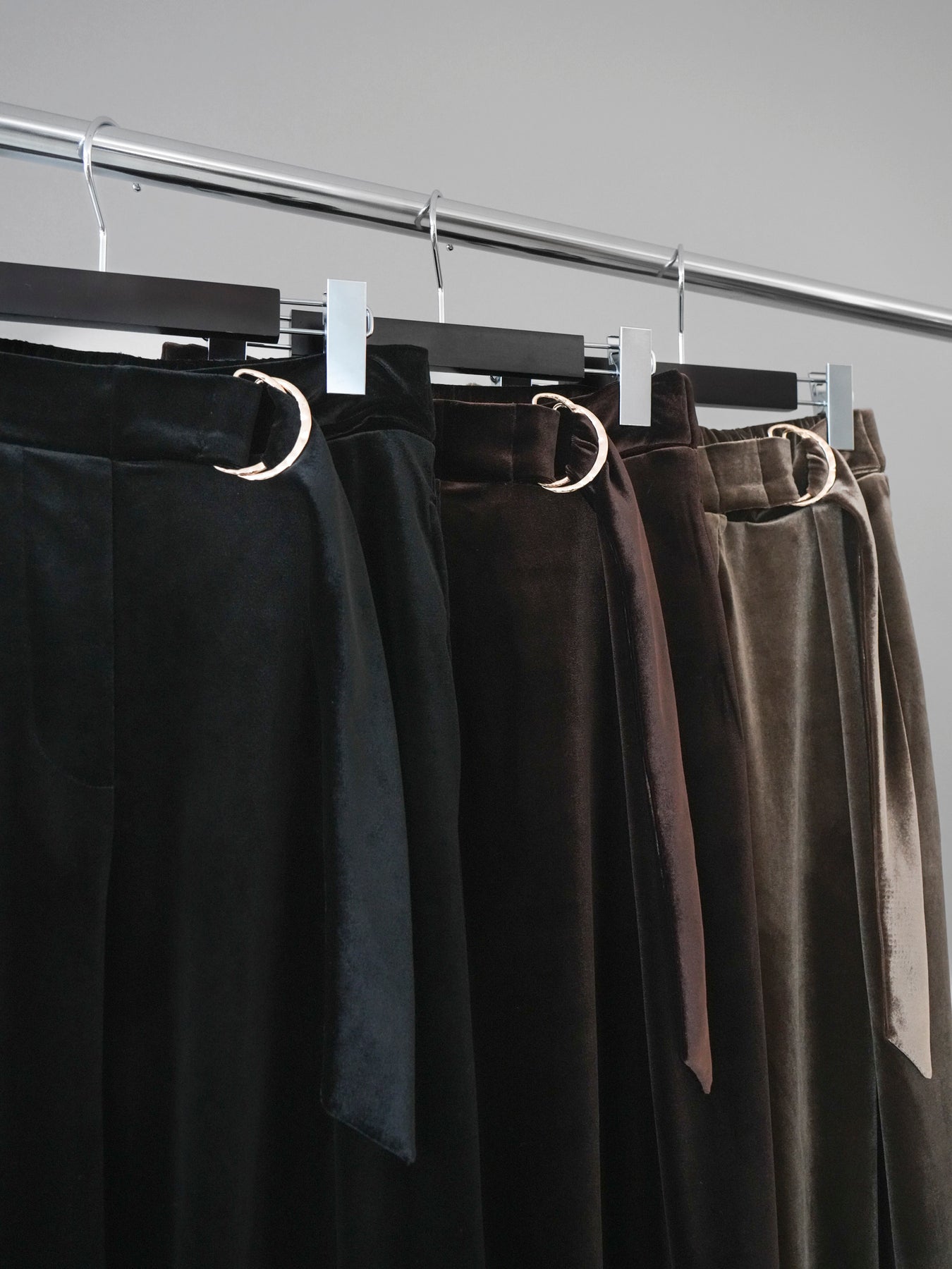 上品な光沢感が魅力のベロア素材を使用したスリムパンツ。 柔らかく滑らかな質感が美しいドレープを生み、女性らしいエレガントな雰囲気を演出します。 付属のベロアベルトがウエストラインを引き締め、スタイルアップ効果も抜群。 ストレートシルエットで脚をすっきりと見せ、カジュアルにもきれいめにも対応可能です。 ニットやブラウスなど幅広いトップスと相性が良く、シーズンの装いを格上げする一本です。