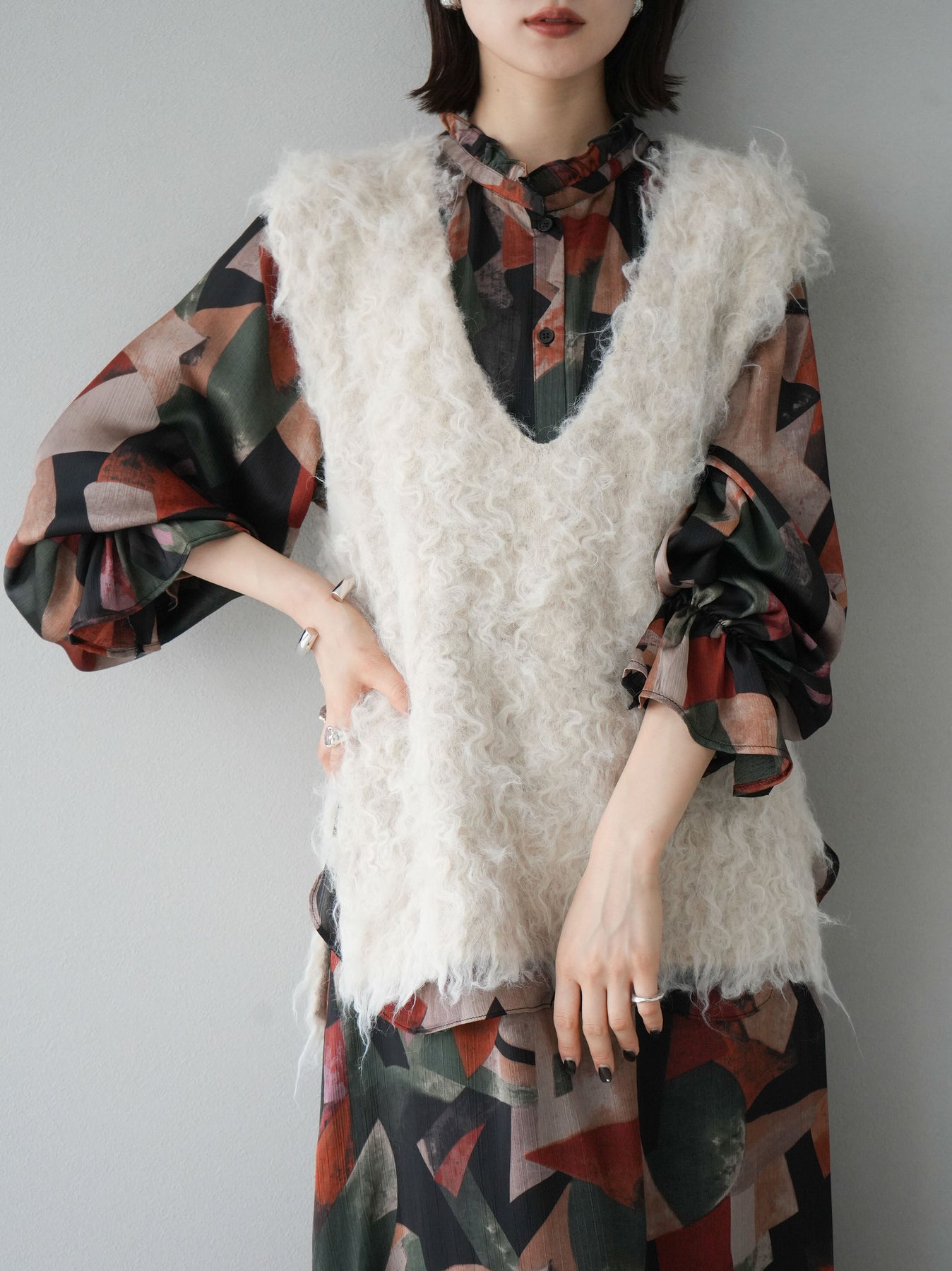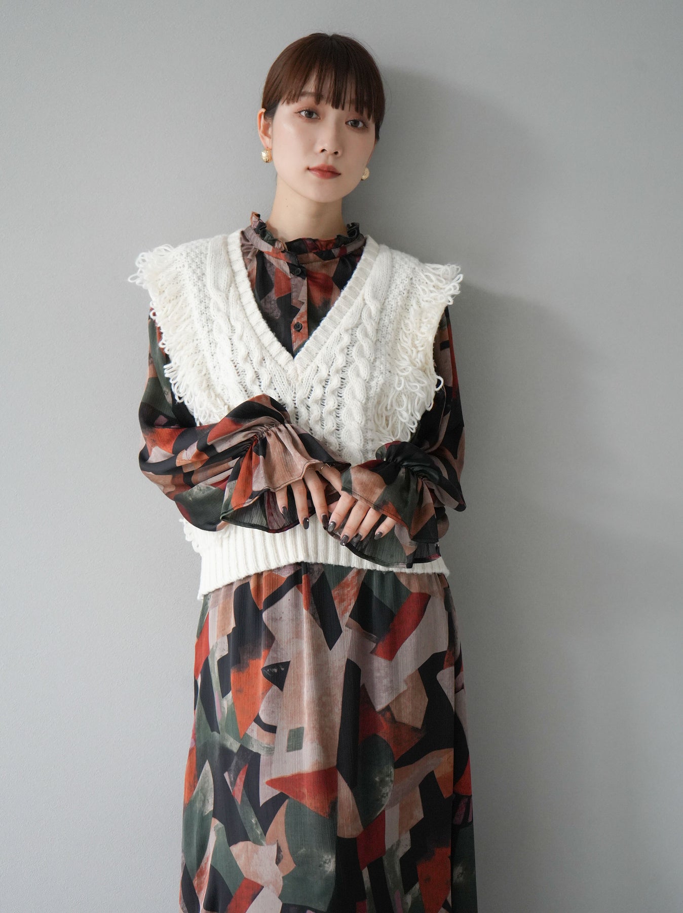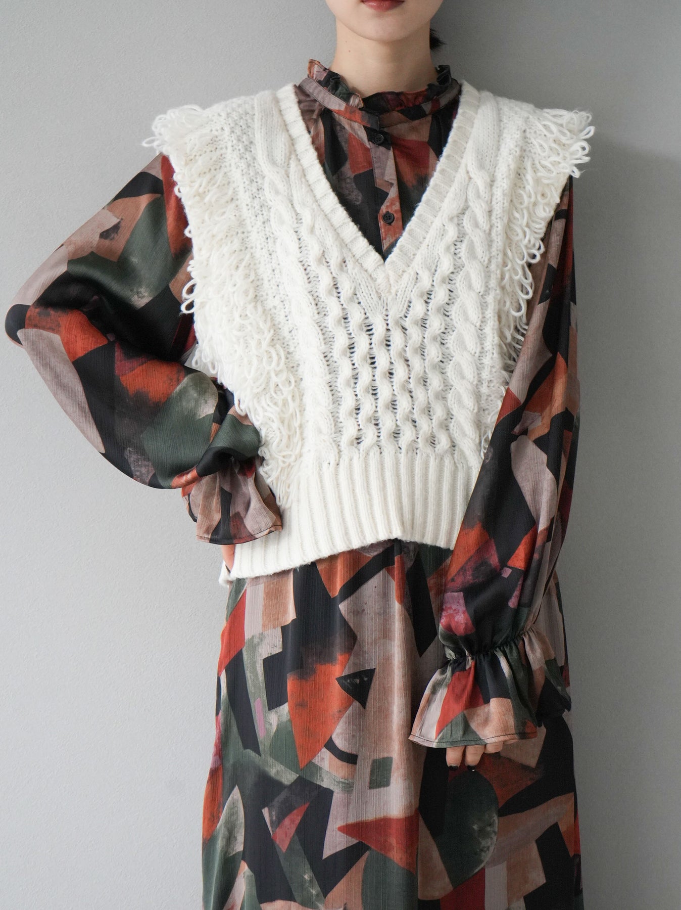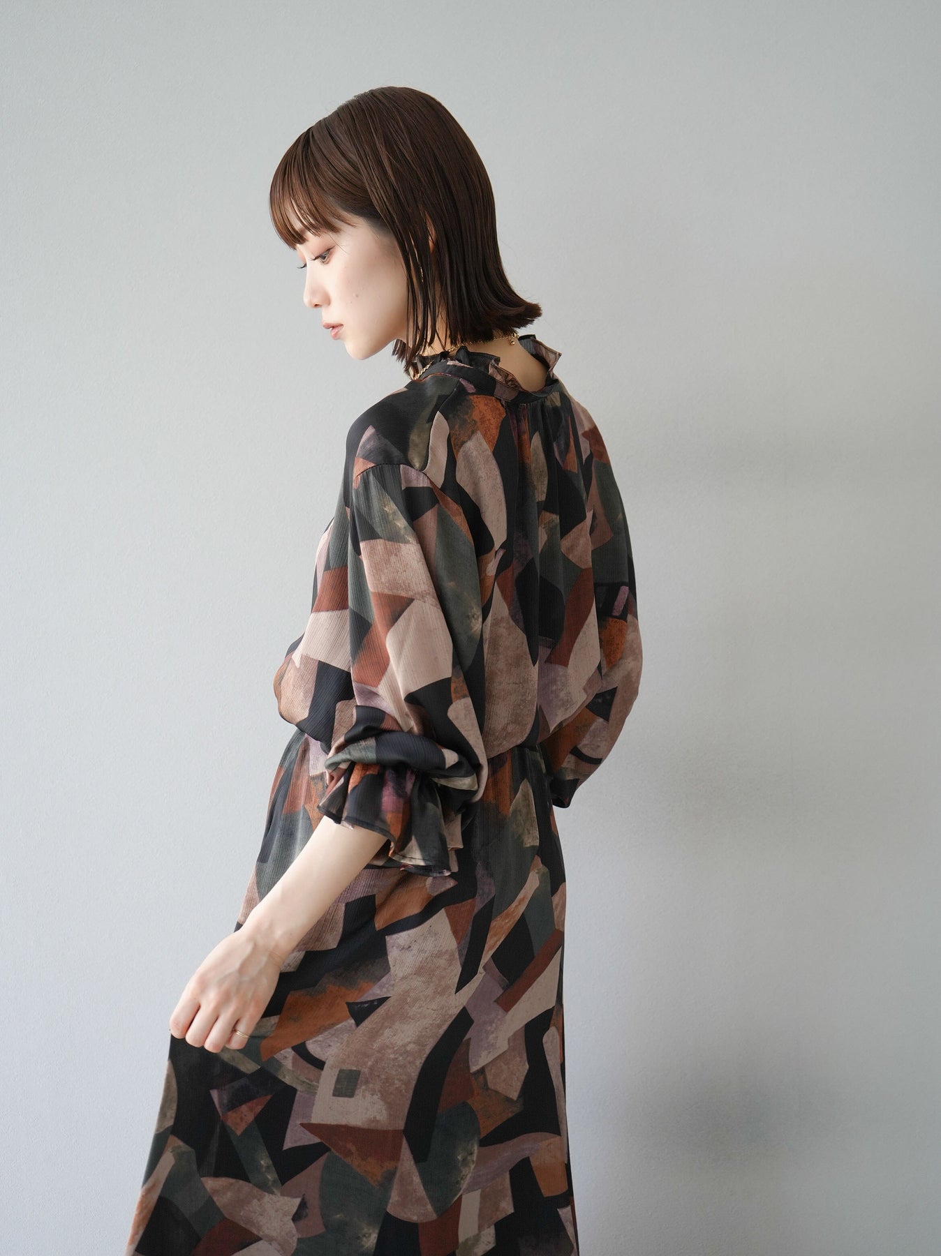 ユニークなレトロプリントが特徴のブラウス。肩から袖にかけて施されたフリルデザインがフェミニンな印象をプラス。柔らかな素材感で着心地も抜群。シンプルなボトムスと合わせるだけで、トレンド感溢れるコーディネートが完成します。 ※ボトムス、キャミソール(インナー)以外の商品は一律でインナーは付属していません
