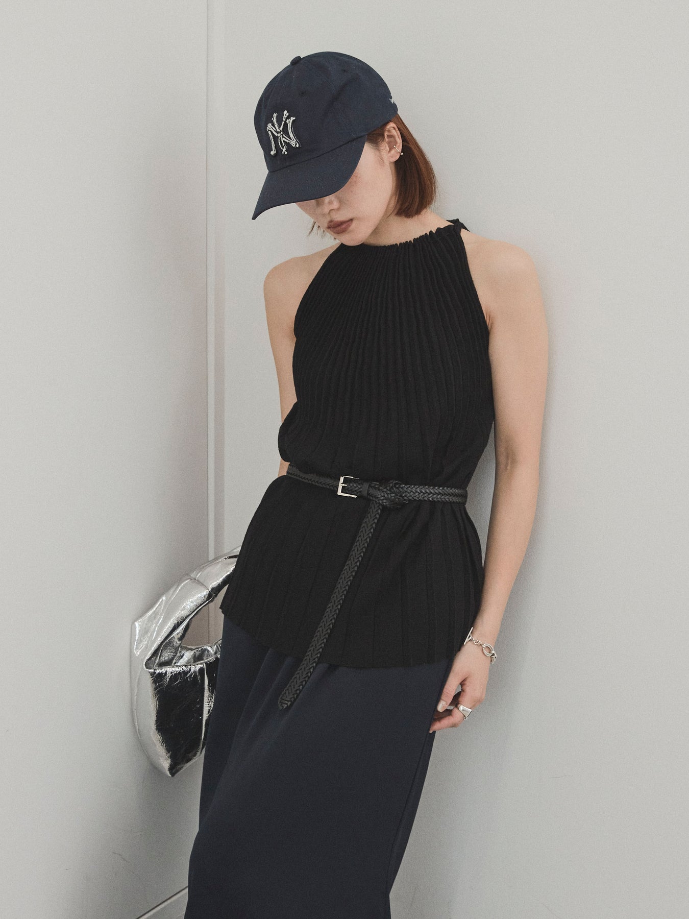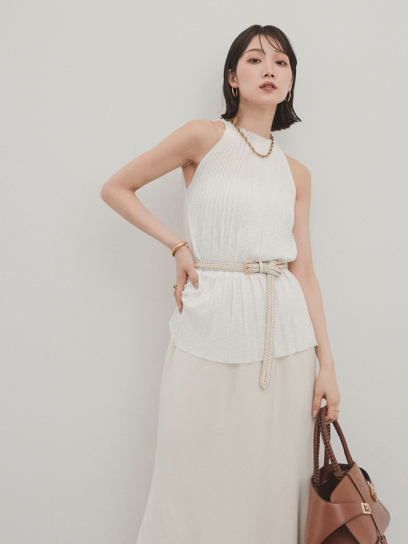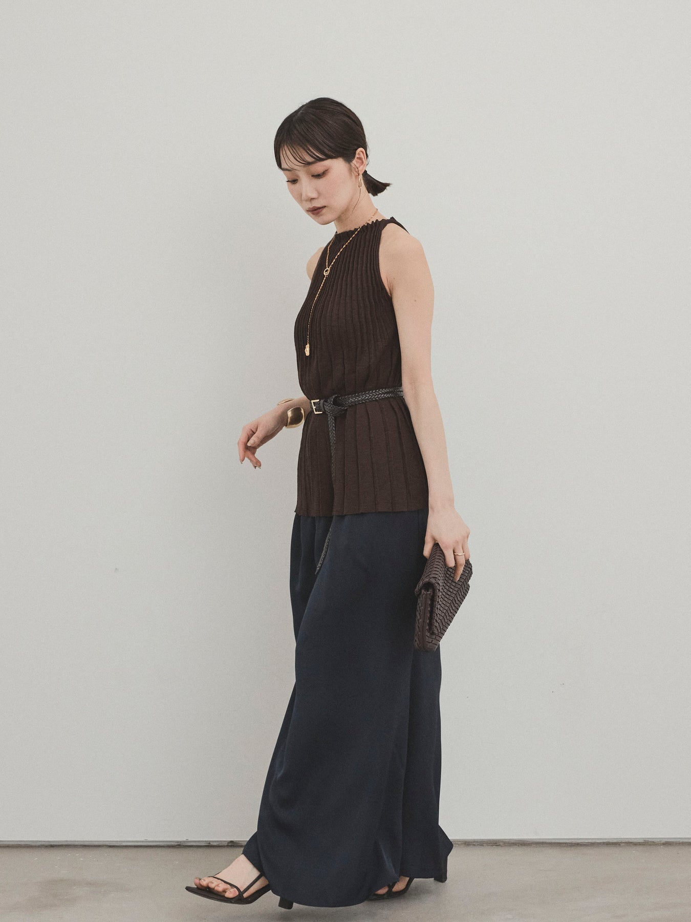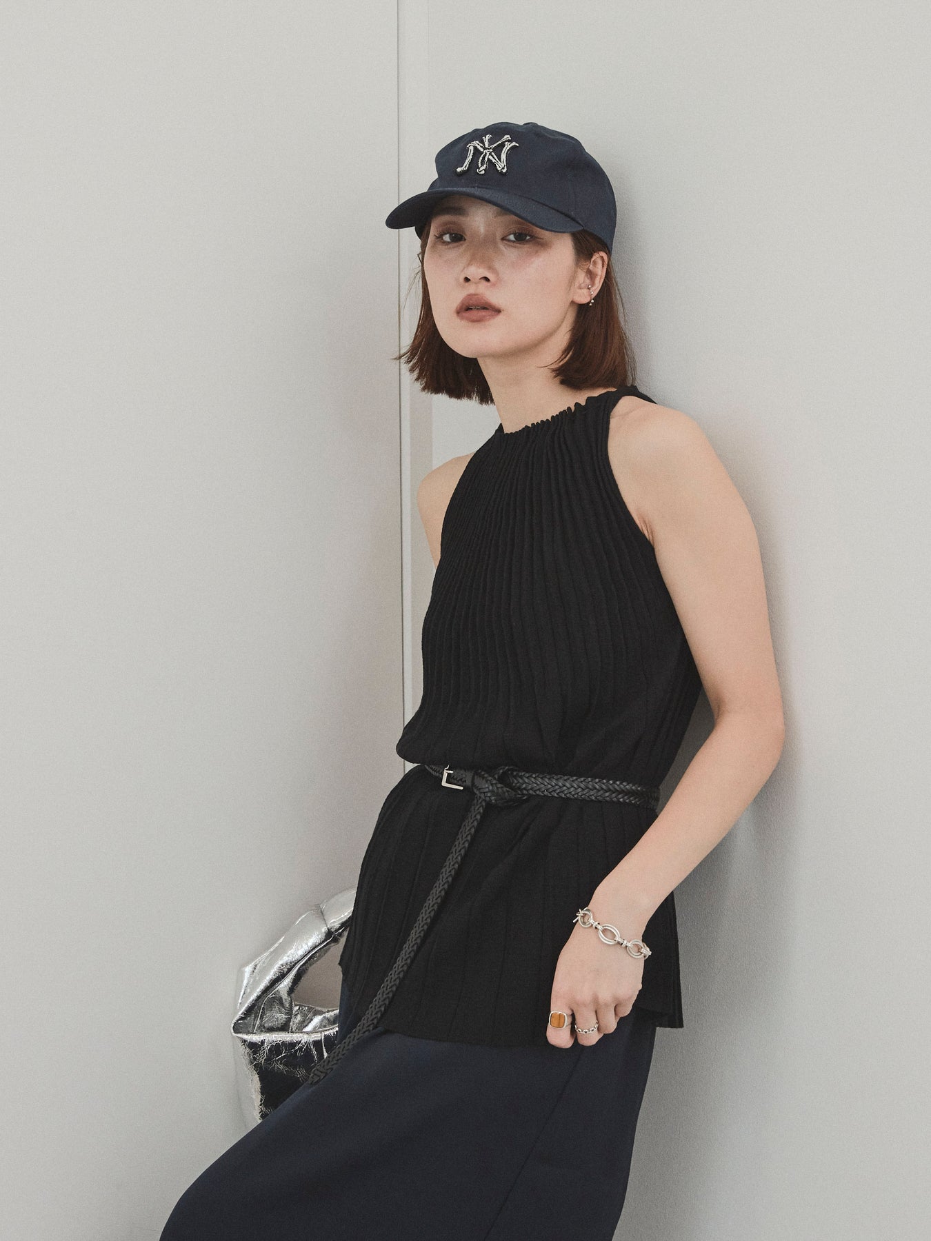 縦ラインが美しいプリーツ編みで仕立てた、大人の洗練を感じさせるニットキャミソール。 身体のラインを拾いすぎない絶妙なシルエットで、スタイルアップも叶える一枚です。 ややハイネック寄りのデザインと肩の露出を抑えた絶妙なアームホールのカットが、ヘルシーながらも上品な印象に。 さらりとした肌あたりのニット素材で、暑い季節でも快適に着用できます。 一枚での着用はもちろん、ジャケットやシャツのインナーとしても活躍する万能トップス。 カジュアルからきれいめまで、幅広いコーディネートに対応できるアイテムです。