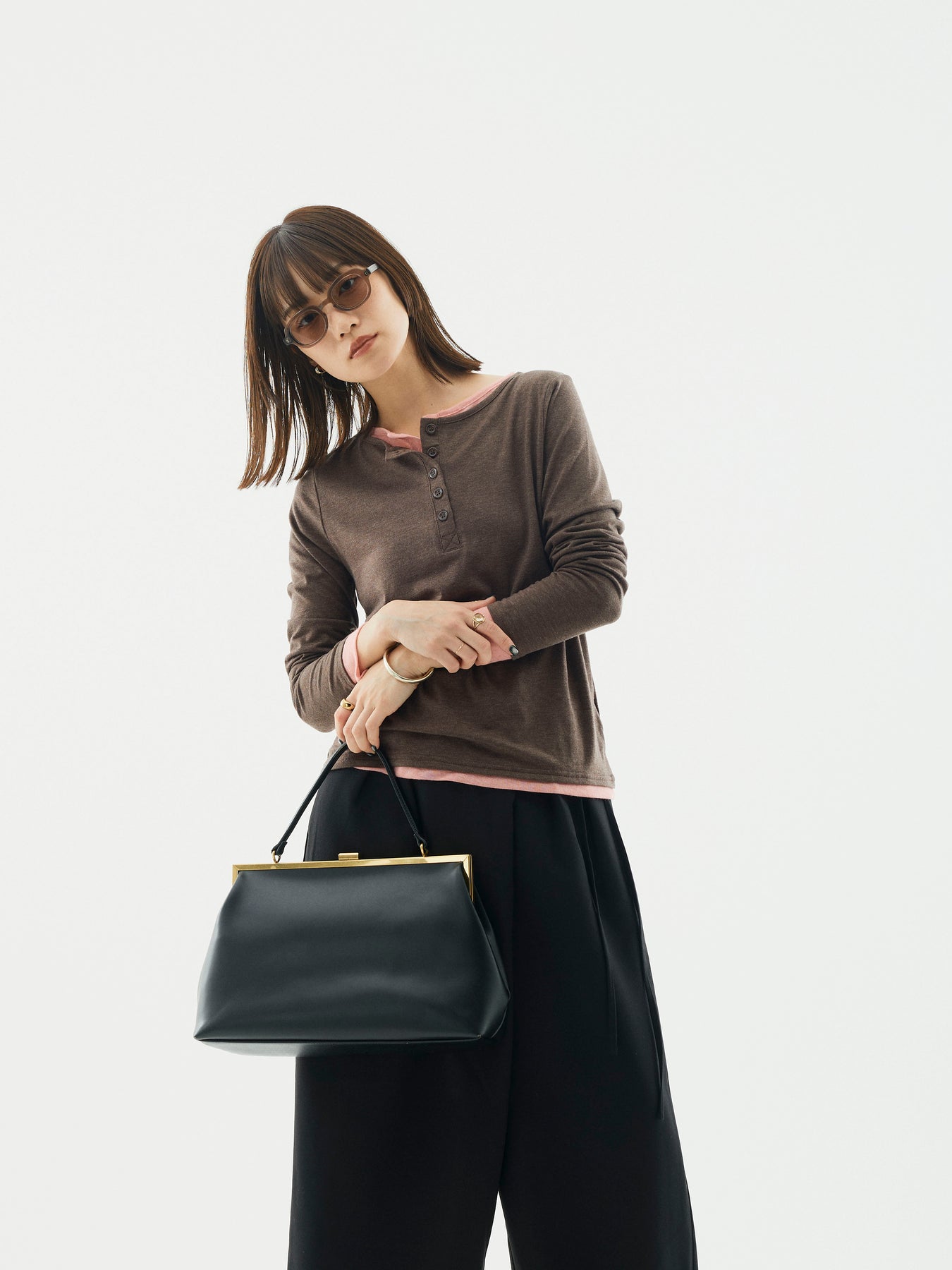 ヴィンテージ感漂う風合いと、絶妙な配色が目を引くレイヤード風ヘンリーネックトップス。 襟元と裾、袖口からさりげなく覗く配色が、シンプルながらもスタイリングに奥行きを与え、1枚でサマになるデザイン。ややルーズなシルエットが今っぽさを引き立てつつ、こなれ感あるカジュアルスタイルにマッチします。 肌当たりの良いコットン混素材で、着心地も快適。デニムやカーゴパンツ、スカートまで幅広く合わせやすい万能トップスです。 1枚で存在感のある、デイリーに使いたくなる優秀アイテム。