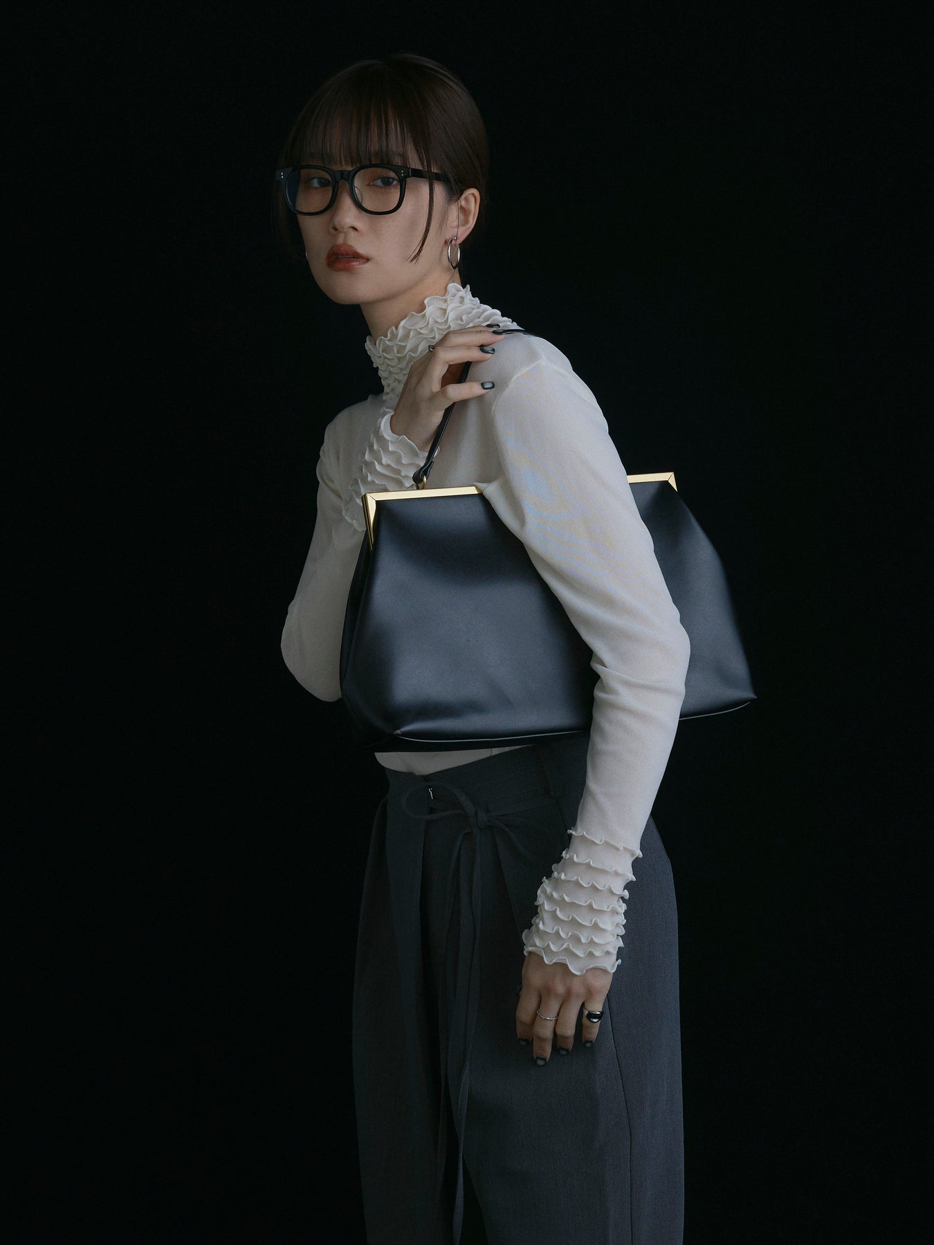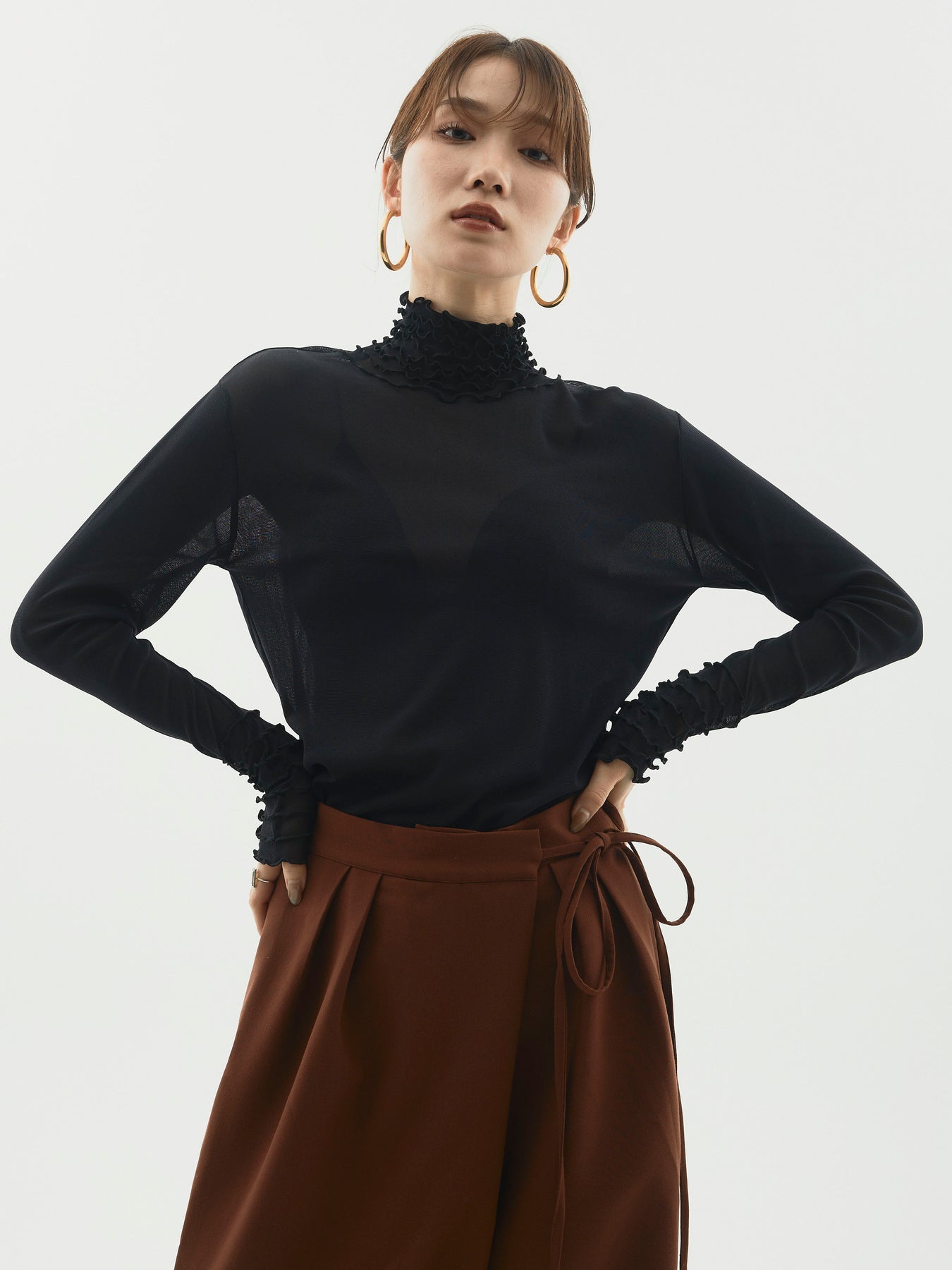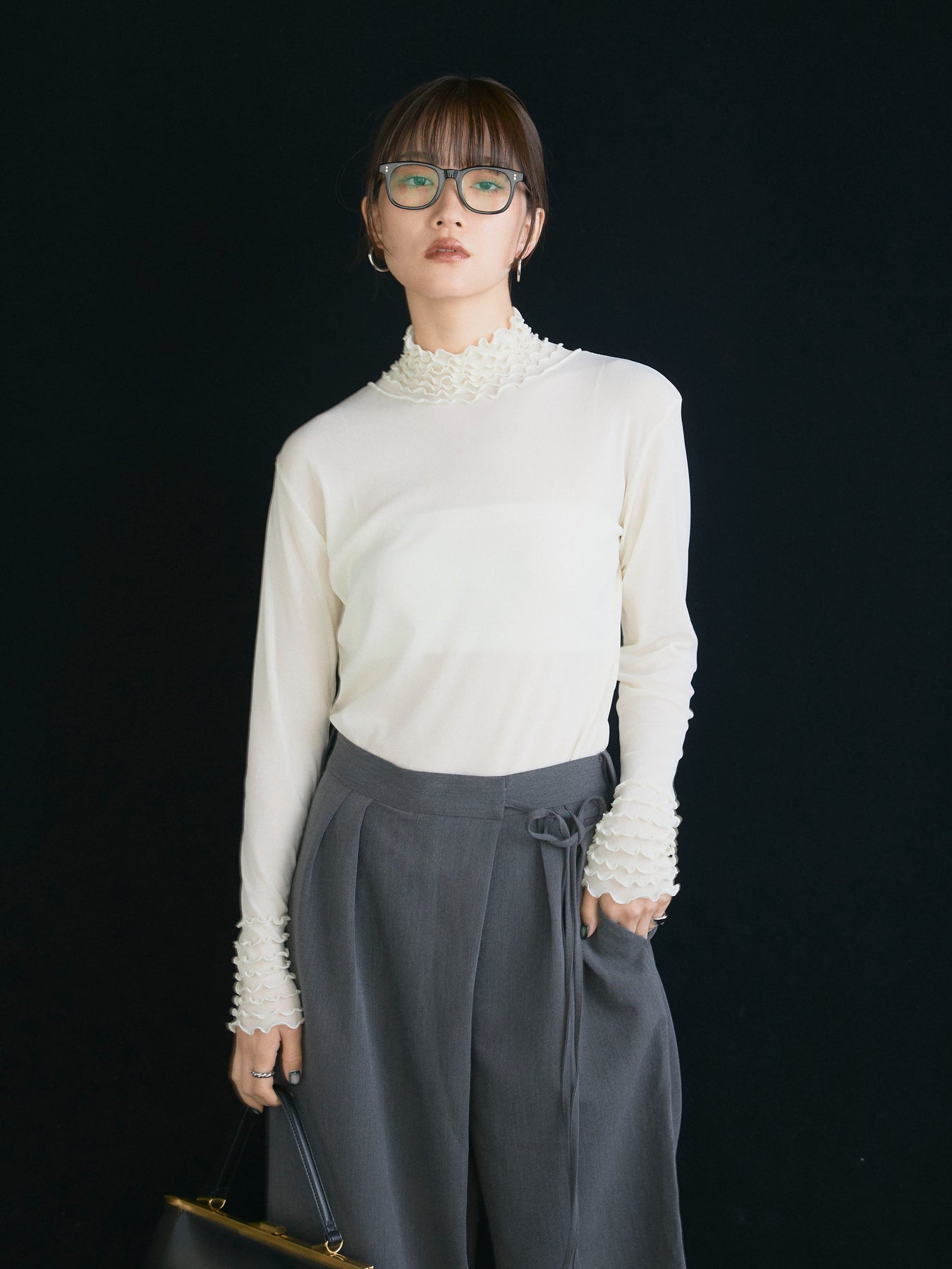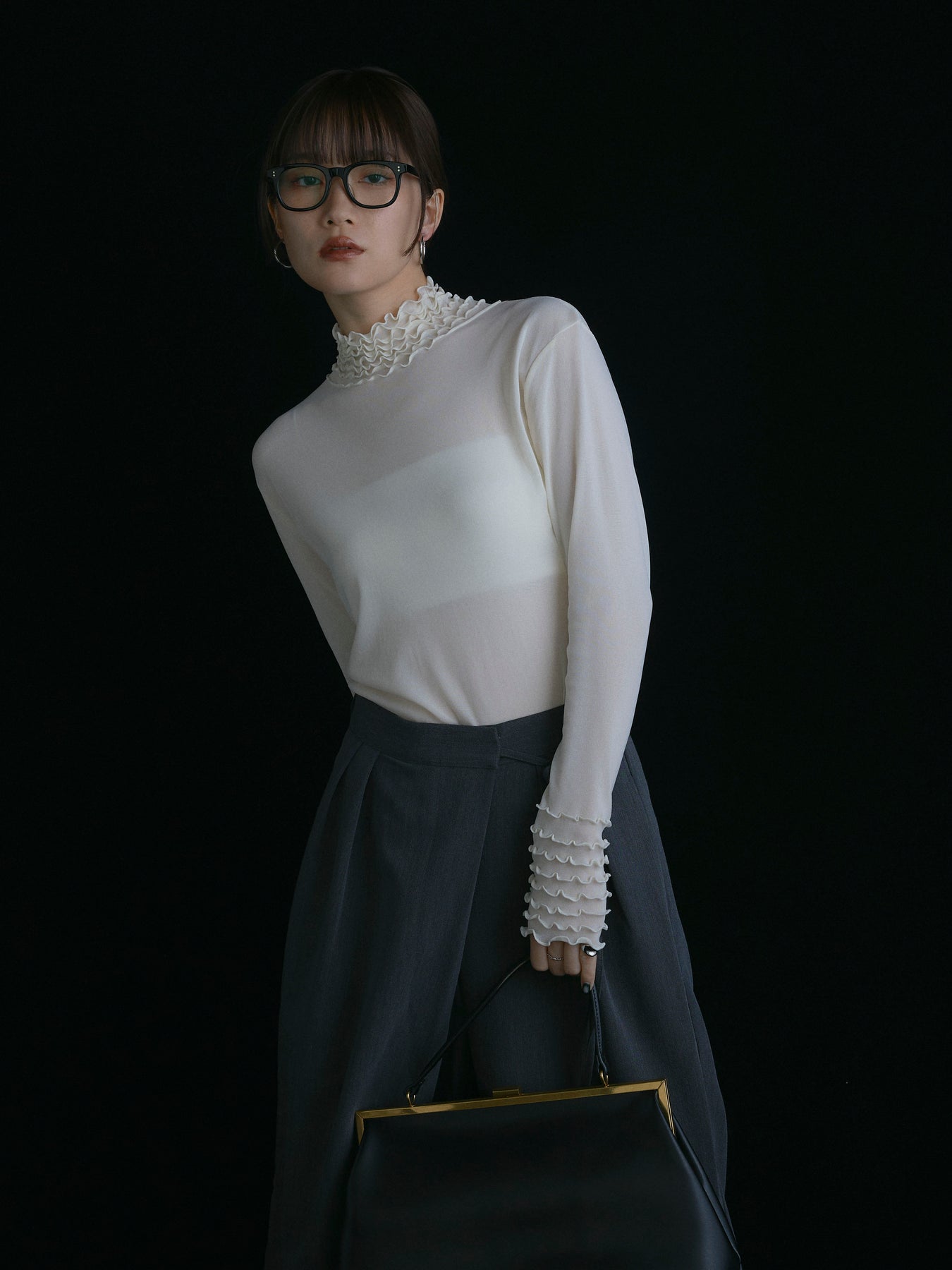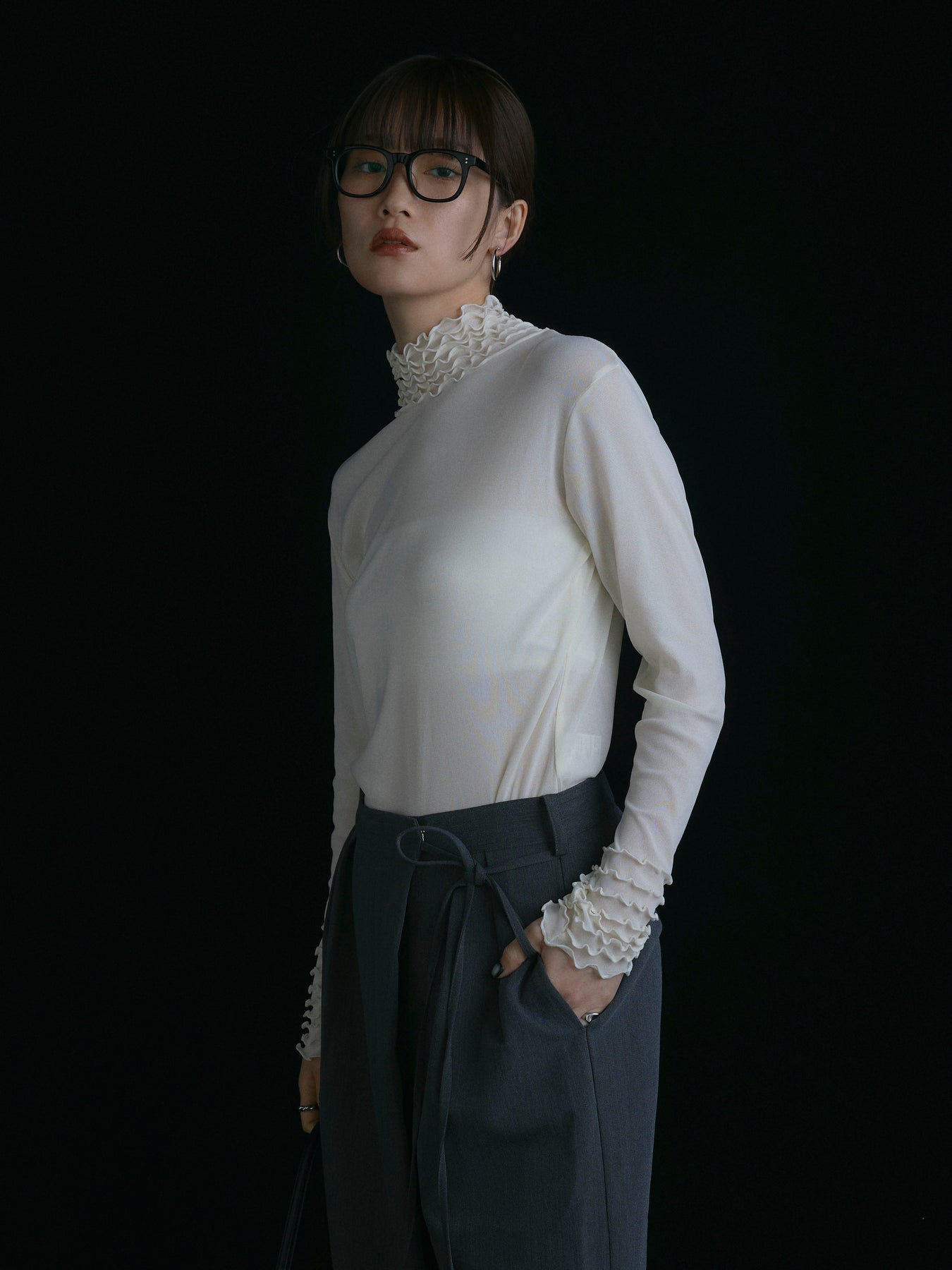 襟元と袖口に施したフリルメローがポイントのシアートップス。上品な透け感がレイヤードスタイルに抜け感を与え、インナー次第でロングシーズン活躍します。伸縮性がありながらもラインを拾いにくい絶妙なシルエットで、ワンピースやビスチェとの相性も抜群です。