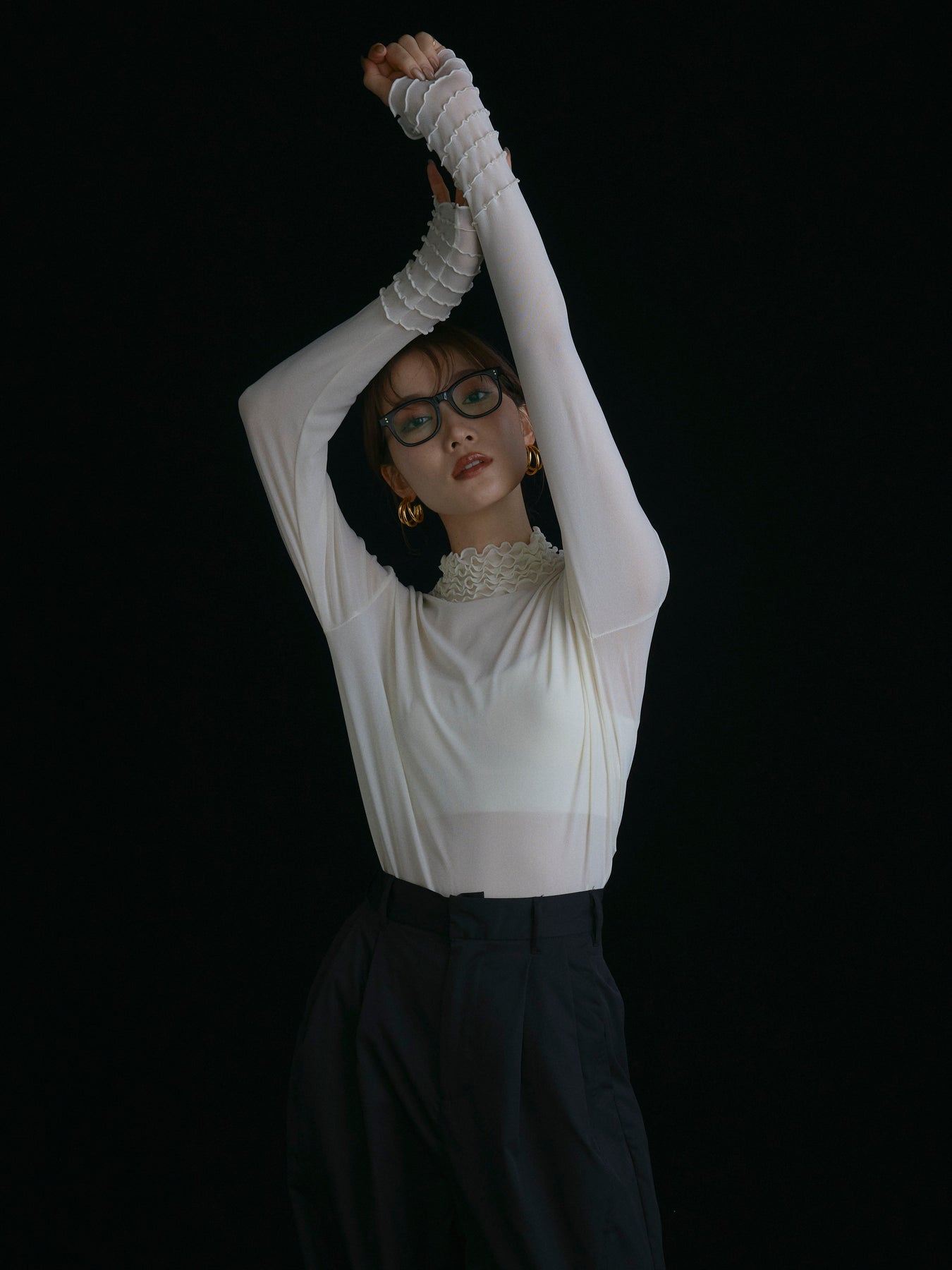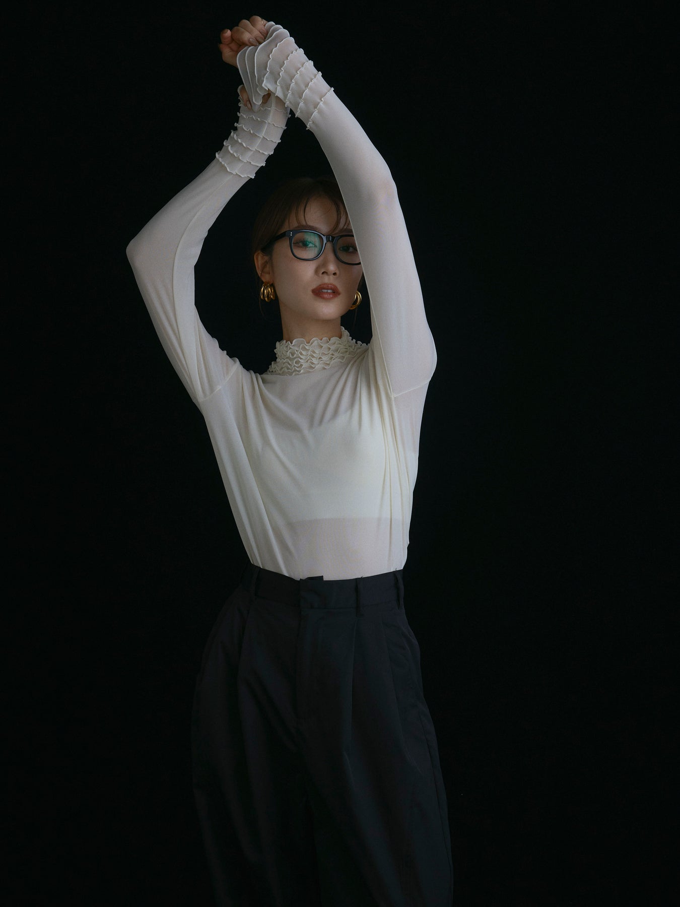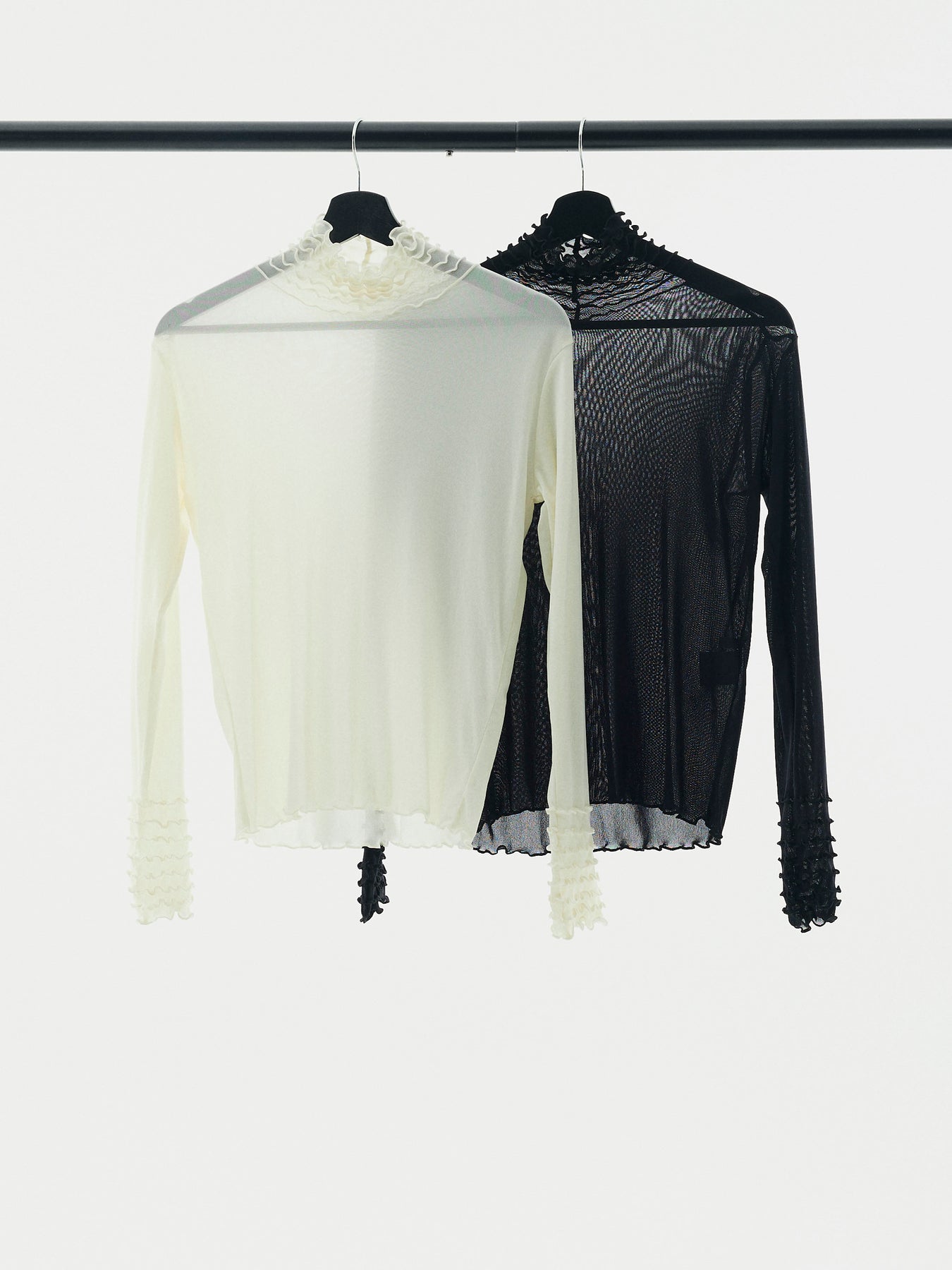 襟元と袖口に施したフリルメローがポイントのシアートップス。上品な透け感がレイヤードスタイルに抜け感を与え、インナー次第でロングシーズン活躍します。伸縮性がありながらもラインを拾いにくい絶妙なシルエットで、ワンピースやビスチェとの相性も抜群です。