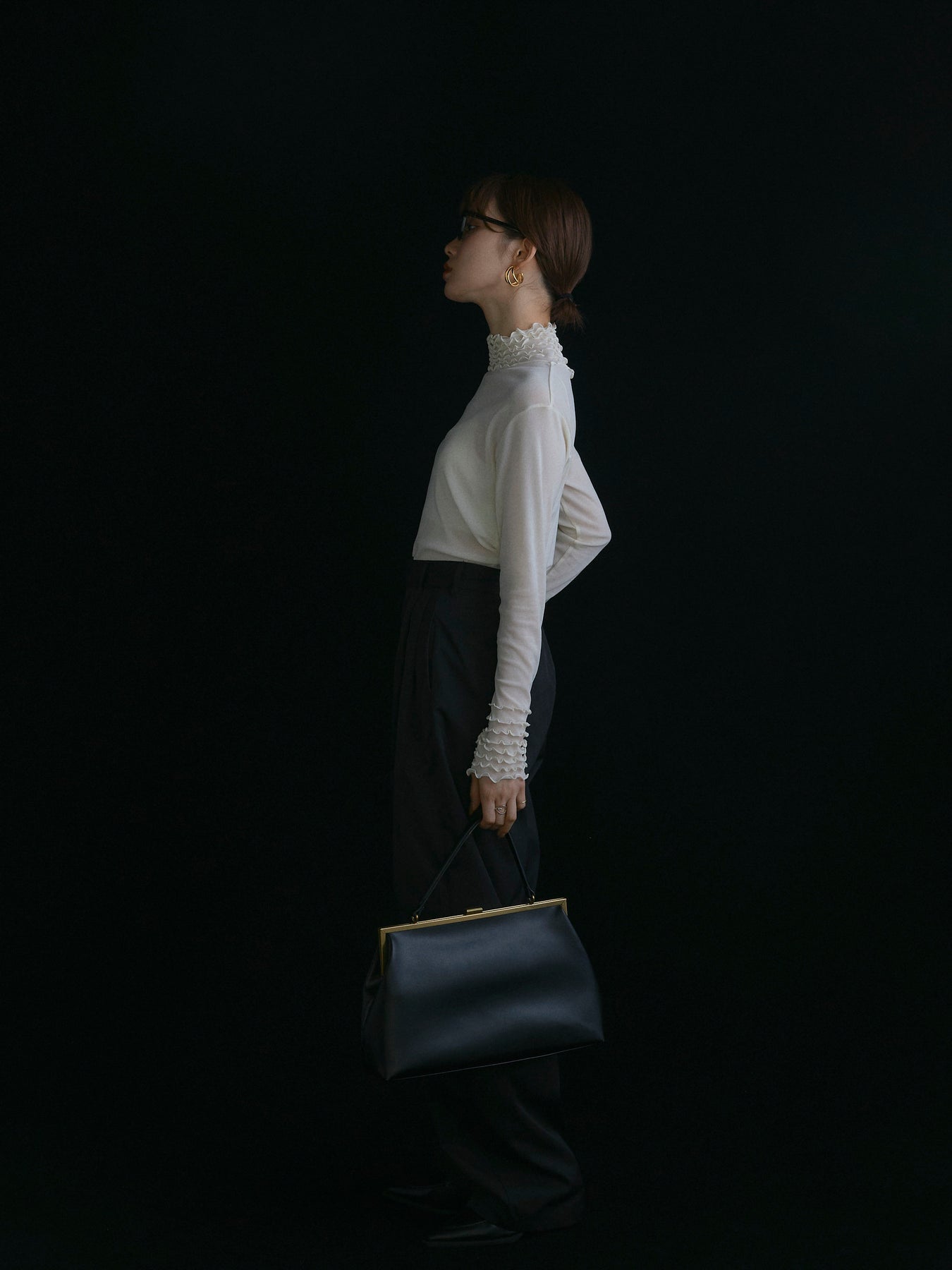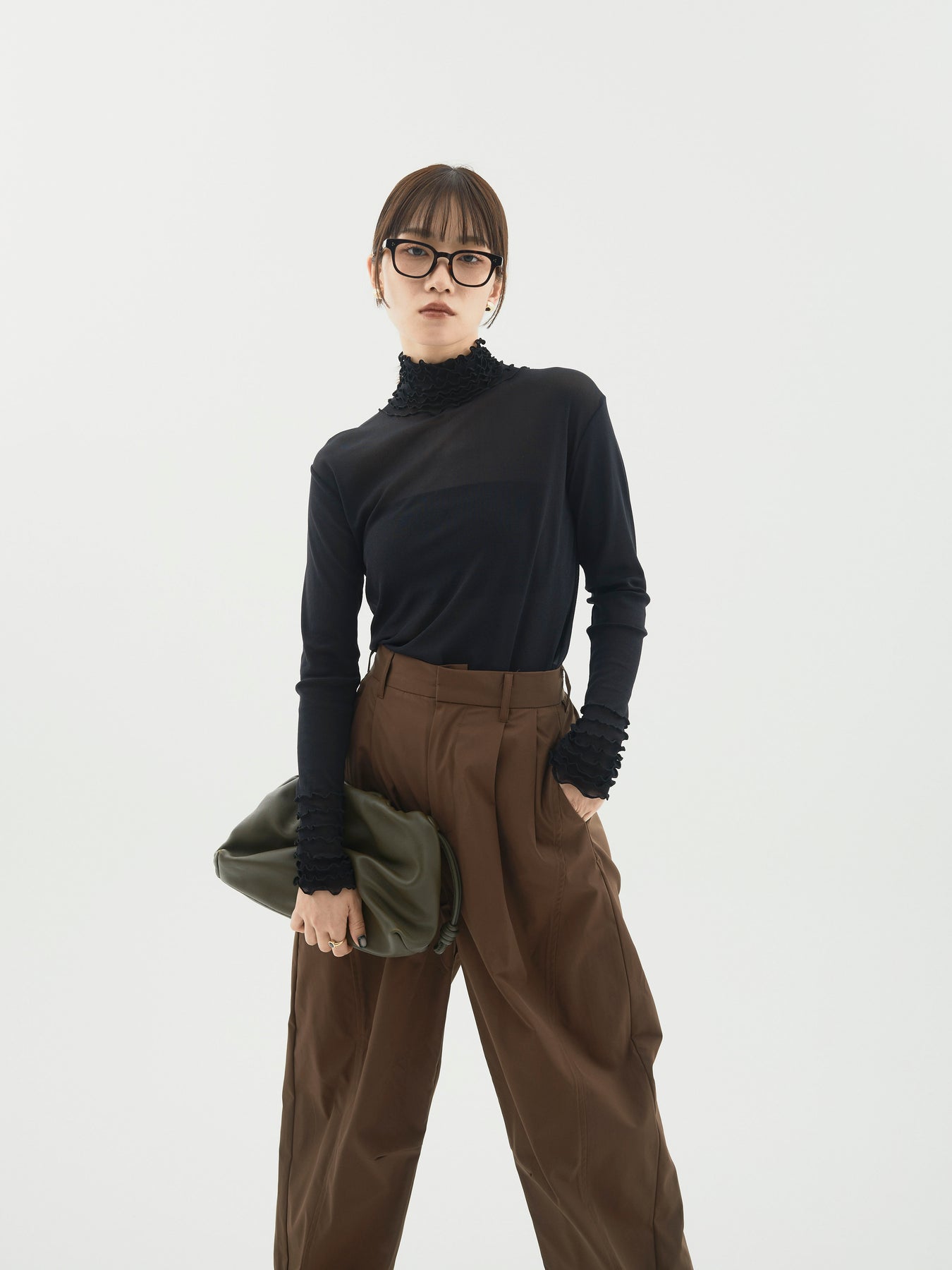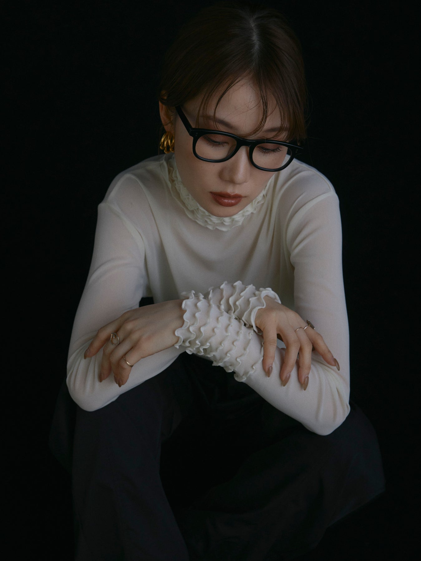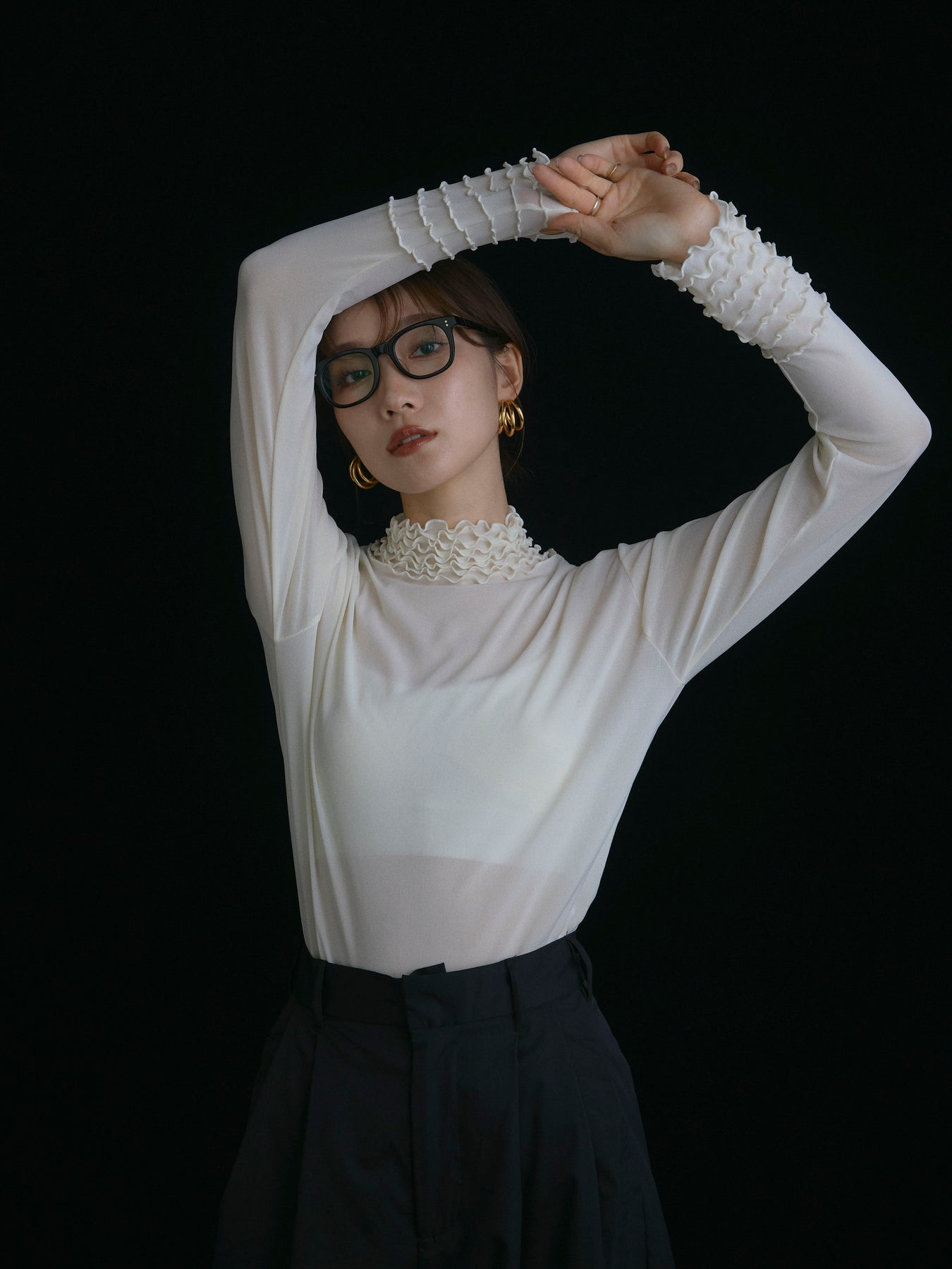 襟元と袖口に施したフリルメローがポイントのシアートップス。上品な透け感がレイヤードスタイルに抜け感を与え、インナー次第でロングシーズン活躍します。伸縮性がありながらもラインを拾いにくい絶妙なシルエットで、ワンピースやビスチェとの相性も抜群です。