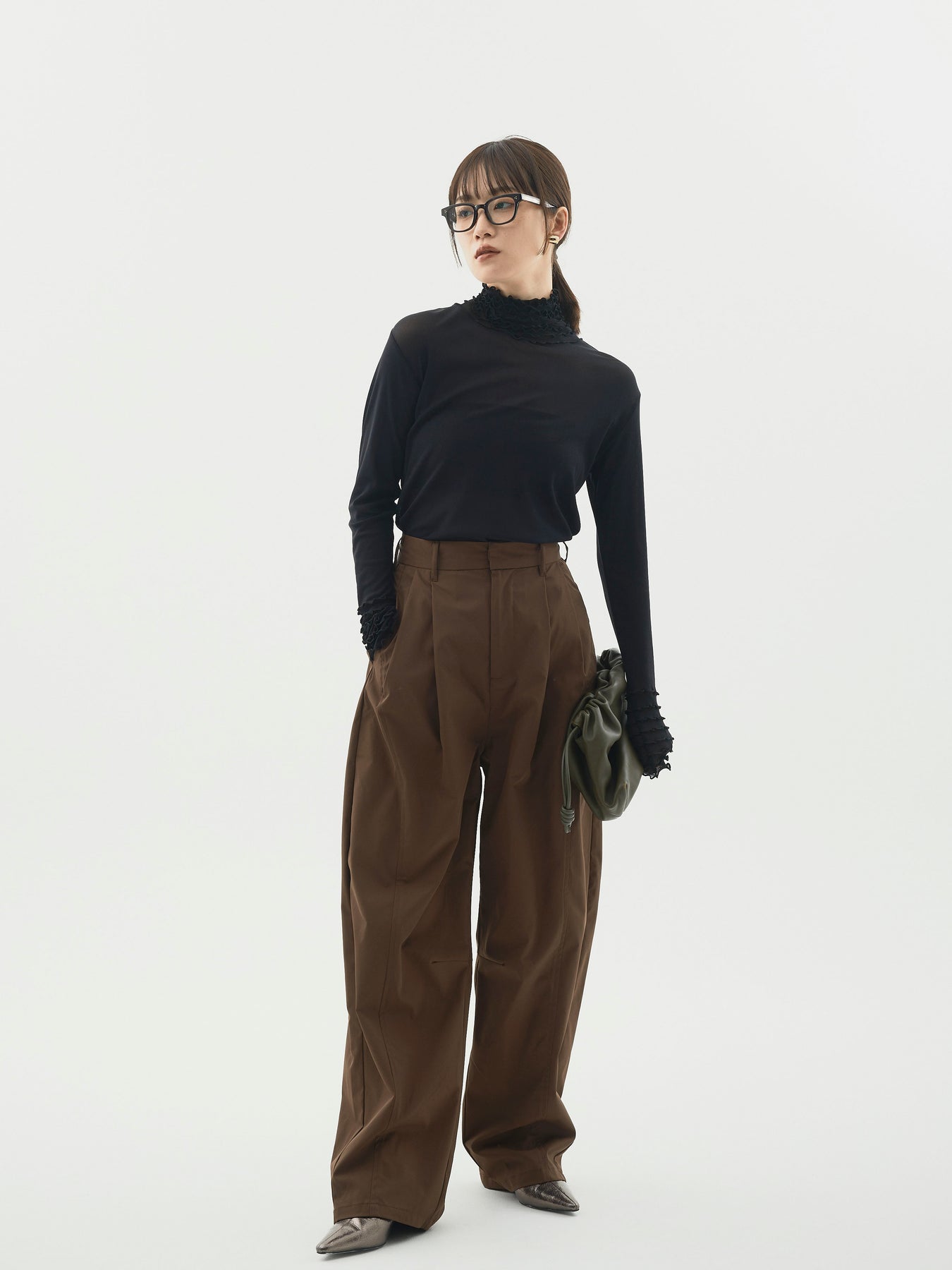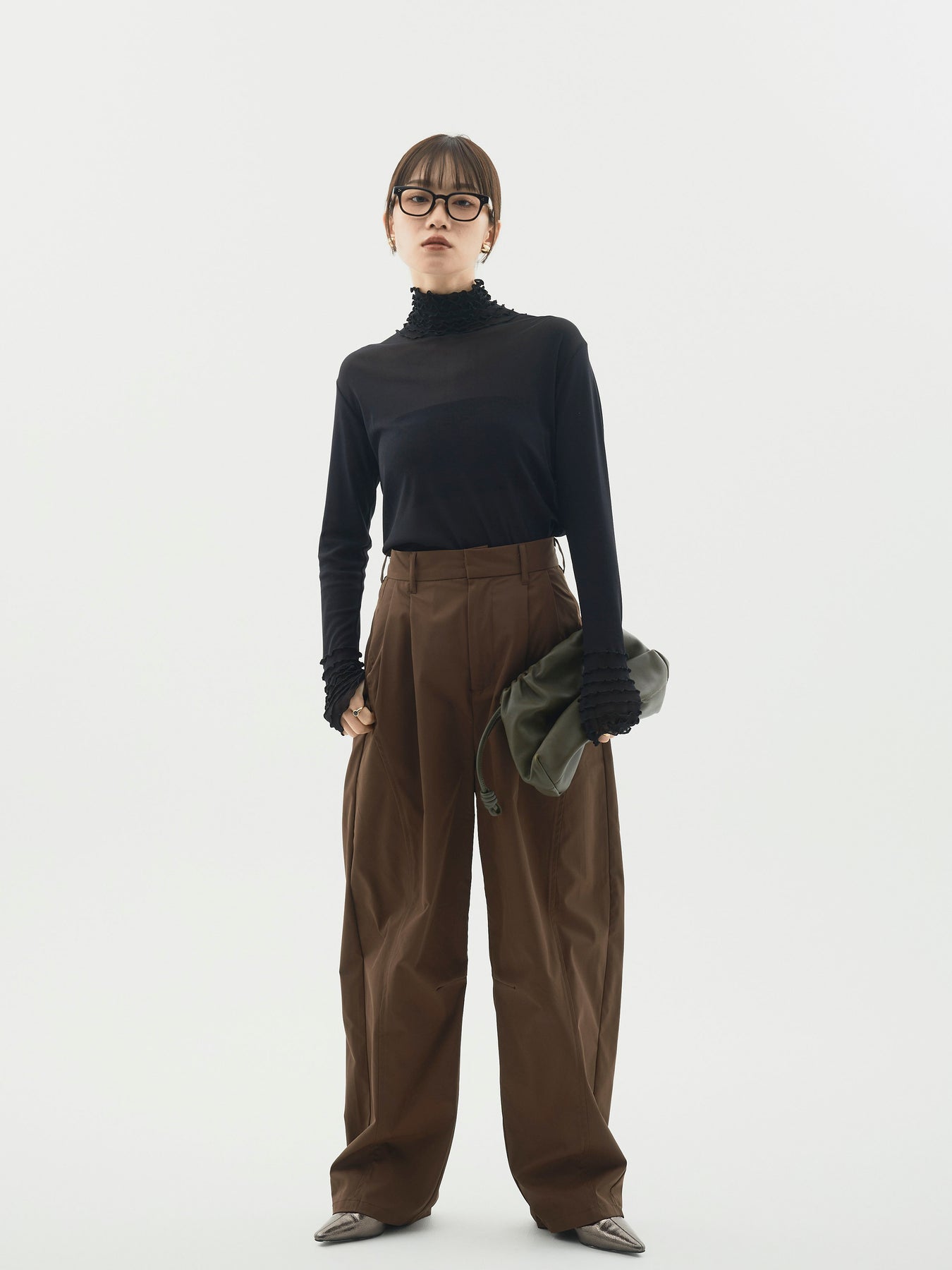しなやかさと程よいハリ感を併せ持つタフタ素材で仕立てた、ボリューム感たっぷりのカーブワイドパンツ。 フロントに深めのタックを入れることで、立体的で洗練されたシルエットを実現。丸みのあるカーブラインが、動くたびに美しいドレープを生み出し、コーディネートにモードなニュアンスをプラスします。 ウエストはすっきりとしたハイウエスト仕様でスタイルアップ効果も抜群。タフタ特有の軽さと適度な光沢感が、大人のきれいめカジュアルにぴったりです。 シンプルなトップスを合わせるだけで、コーディネートが一気に映える主役級アイテム。