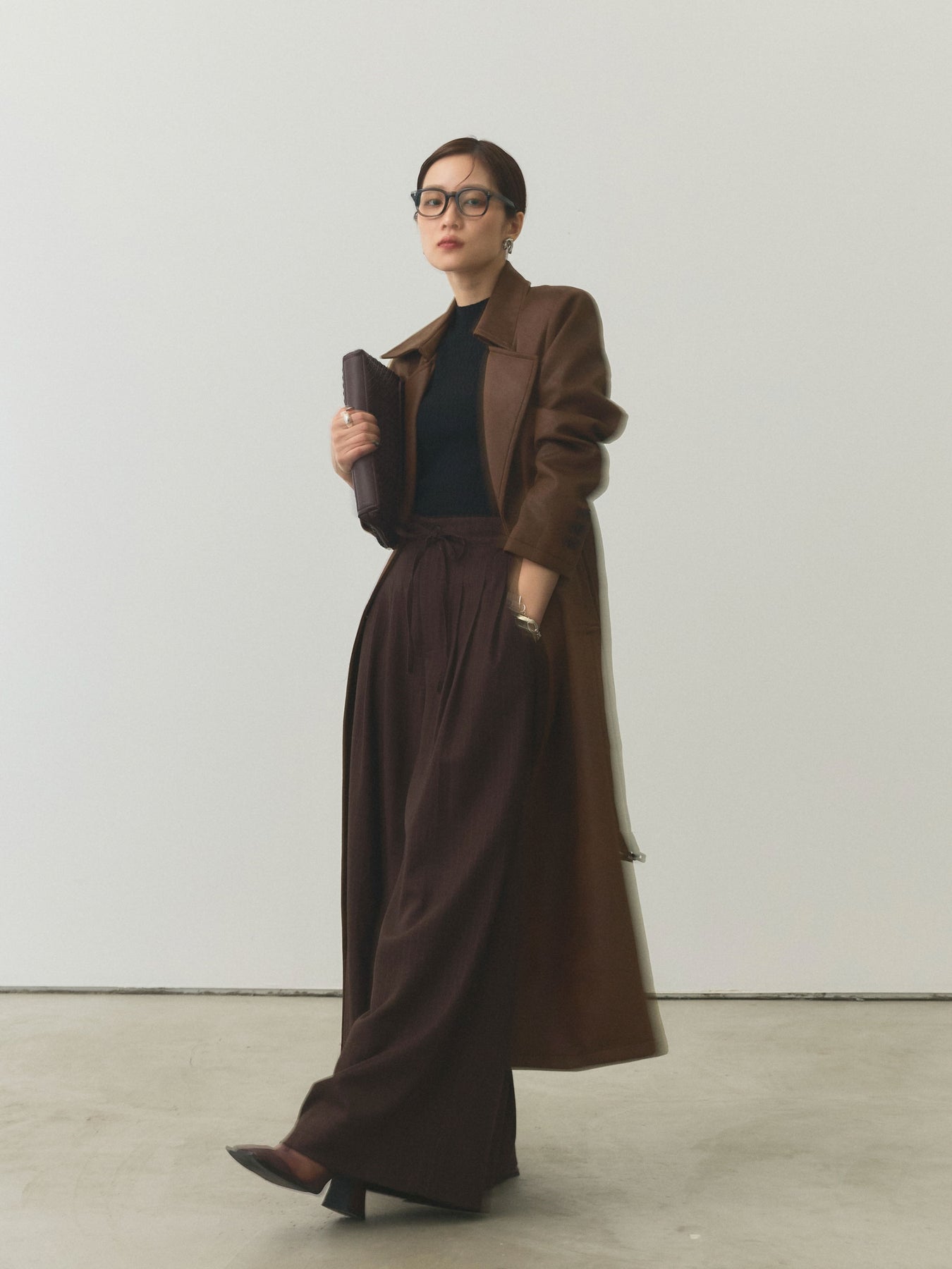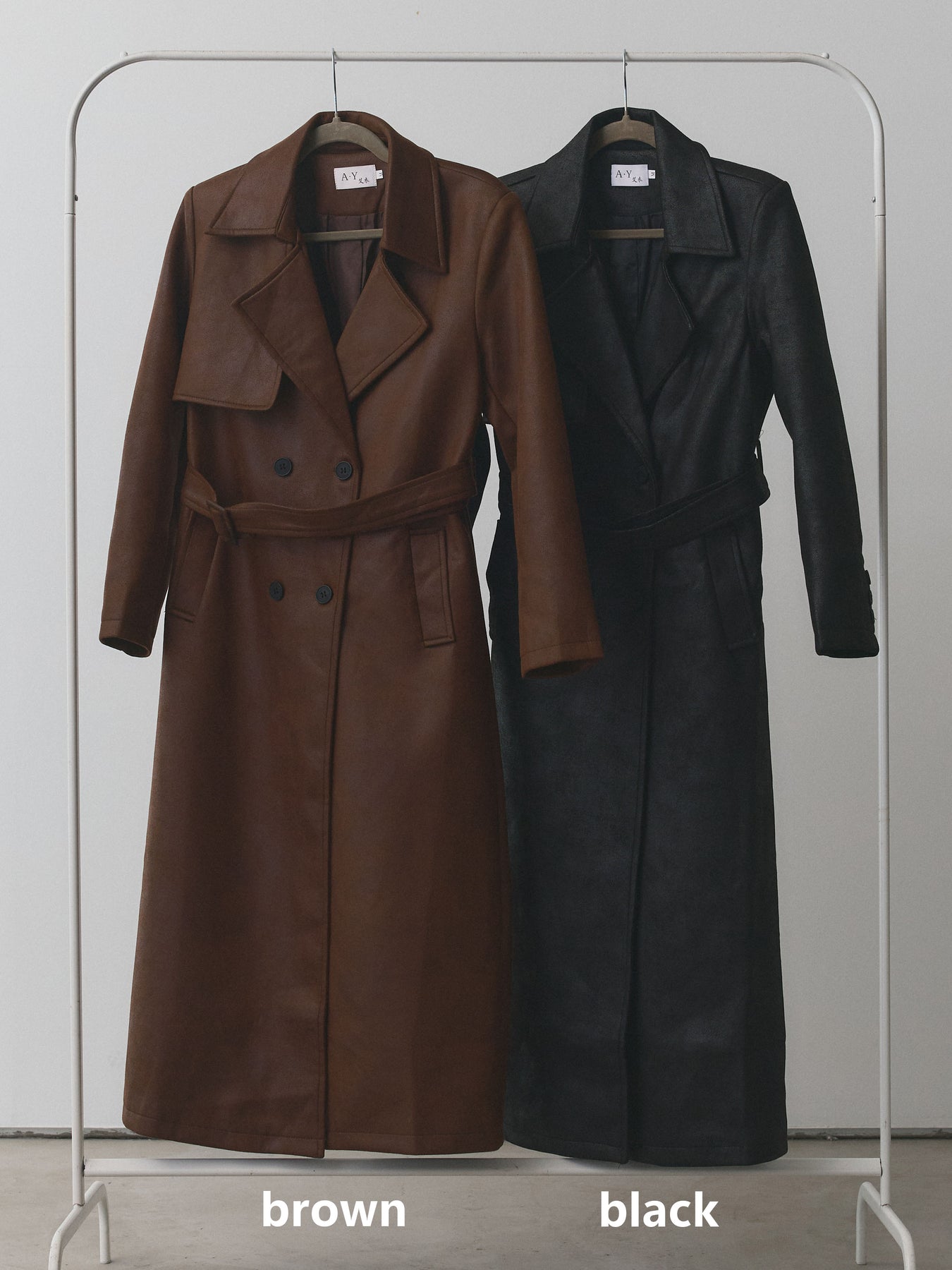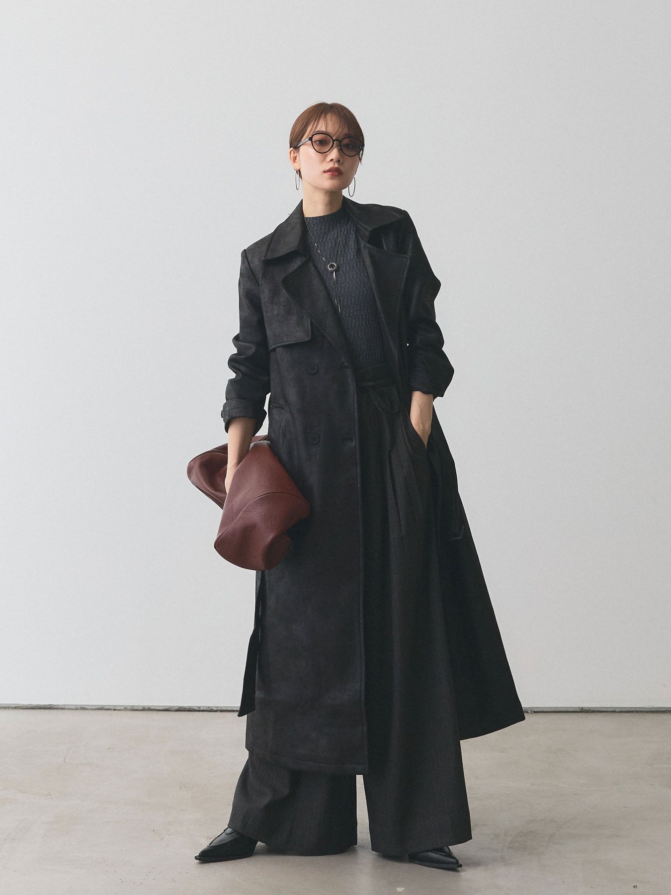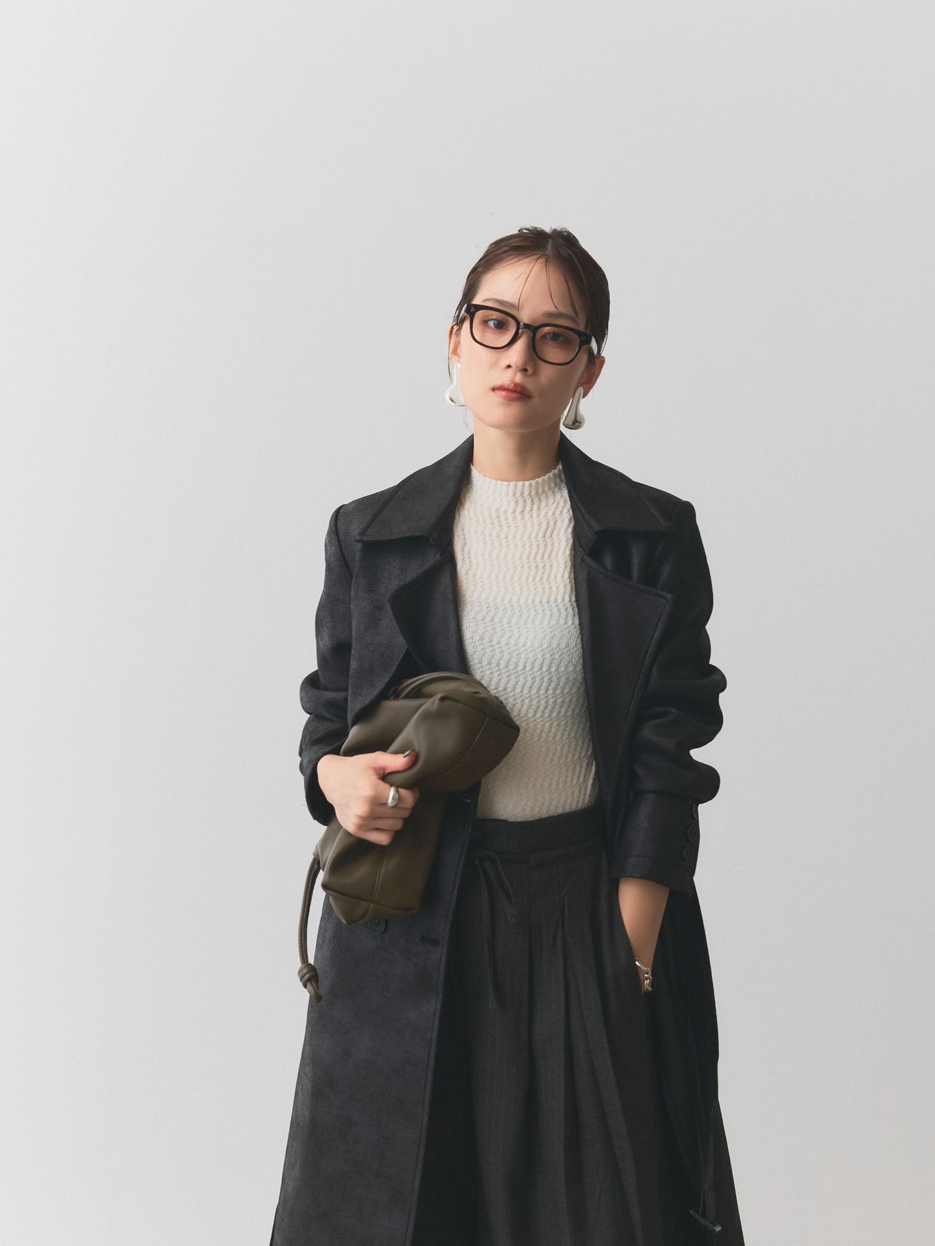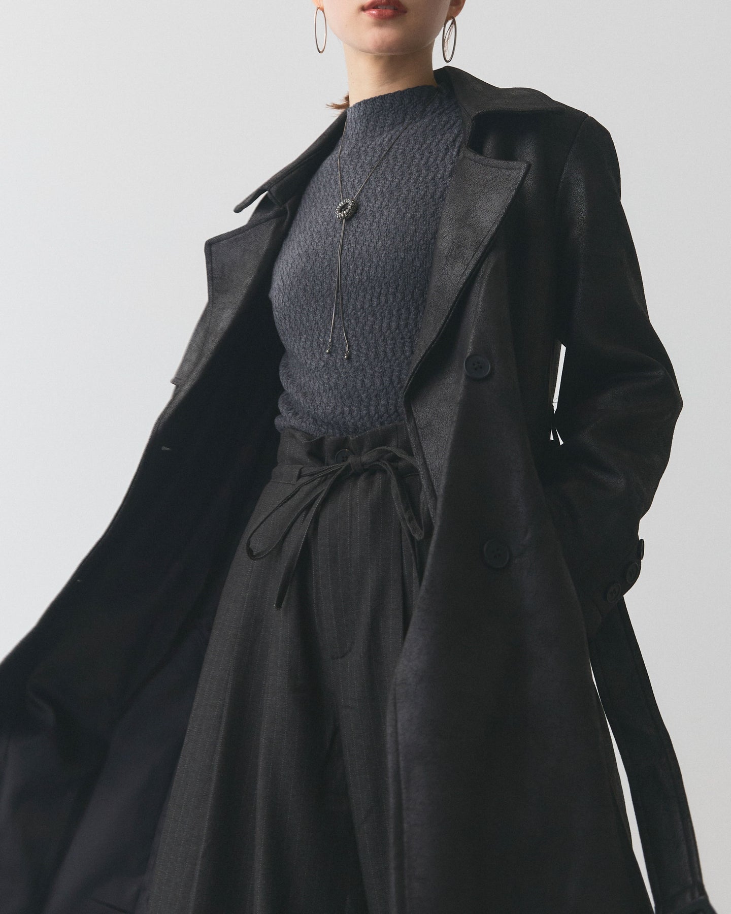 重厚感のあるレザー調素材を使用したトレンチコート。ヴィンテージライクな風合いが大人の雰囲気を漂わせ、羽織るだけでスタイリングを格上げしてくれます。ダブルボタンとウエストベルトのクラシックなディテールを備えつつ、すっきりとしたシルエットで洗練された印象に。パンツにもスカートにも合わせやすく、デイリーから特別なシーンまで幅広く活躍する存在感のある一着です。 ※ボトムス、キャミソール(インナー)以外の商品は一律でインナーは付属していません。