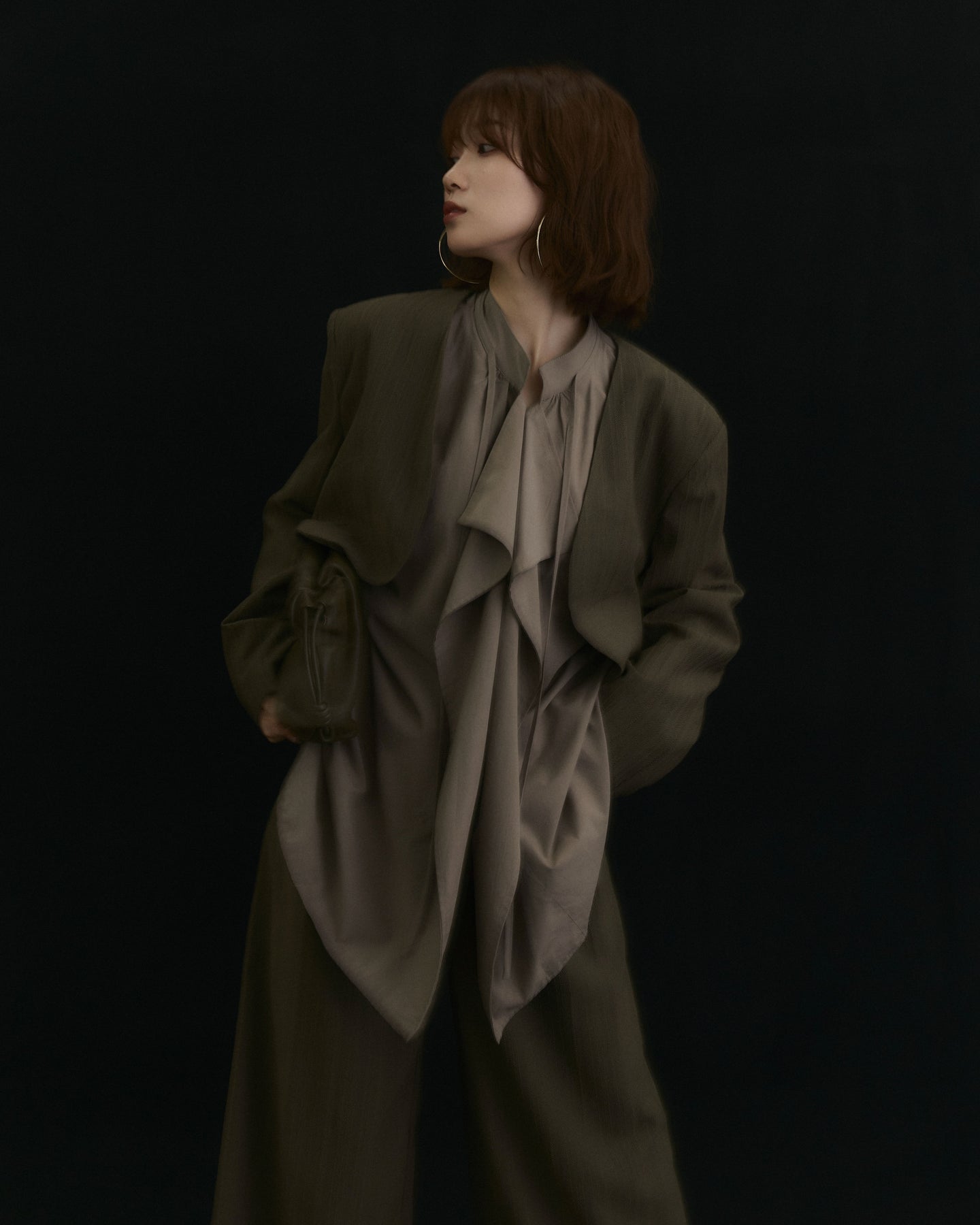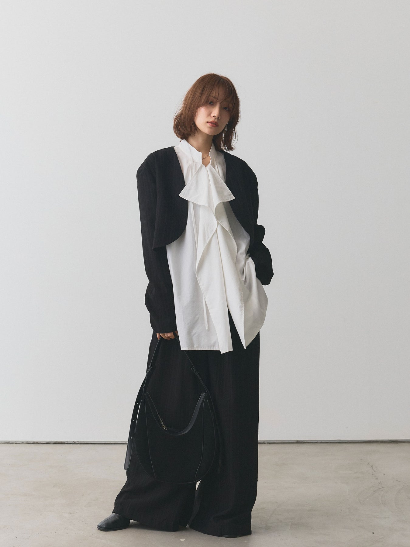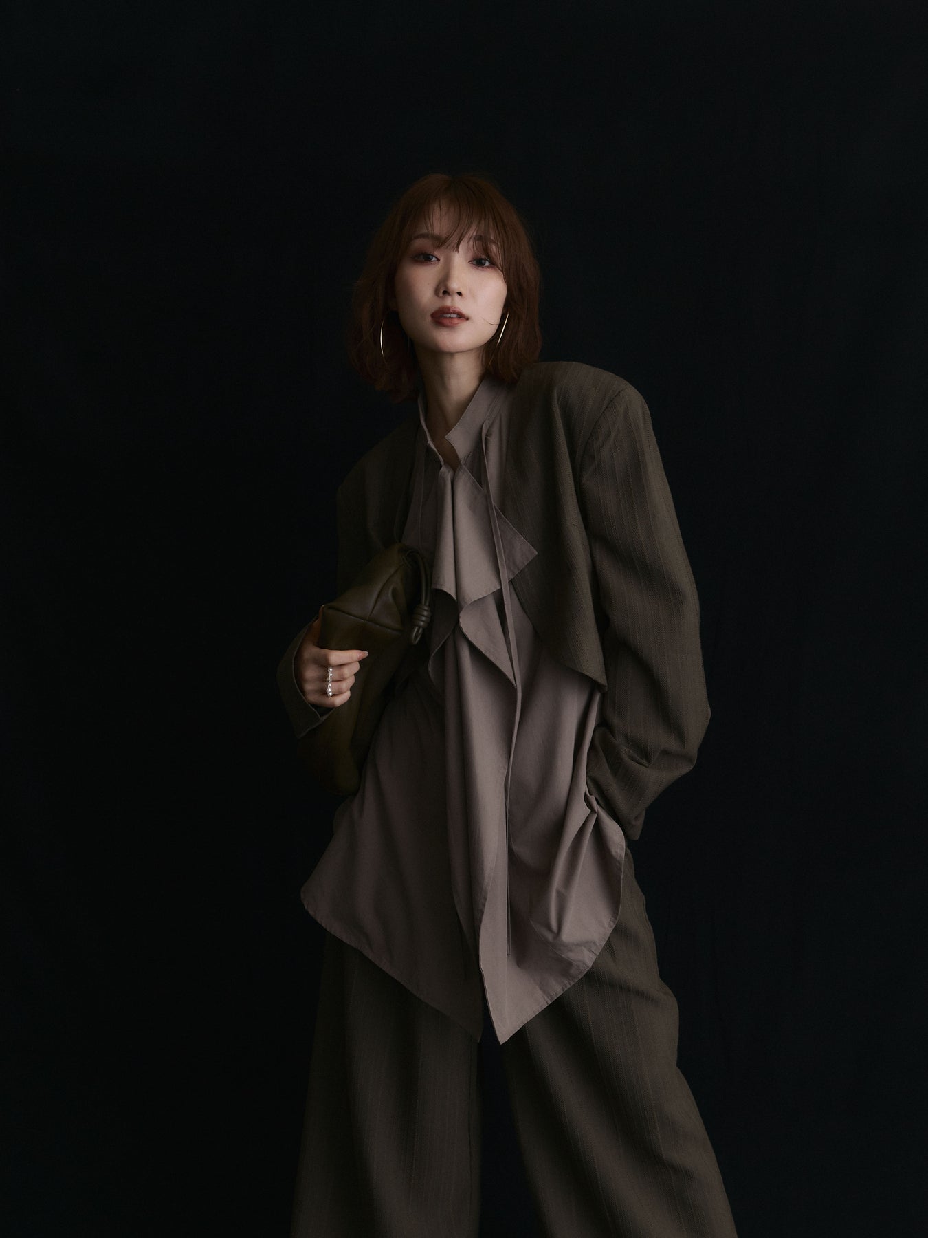 クラシカルなヘリンボーン柄で仕立てたショートジャケットとワイドパンツのセットアップ。ジャケットはコンパクトな着丈でバランスが取りやすく、パンツは落ち感のあるシルエットで脚長効果を演出します。セットで着用すれば洗練されたスタイリングが完成し、それぞれ単品でも着回せるのが魅力。オンオフ問わず幅広いシーンで活躍する、大人のワードローブに取り入れたいアイテムです。