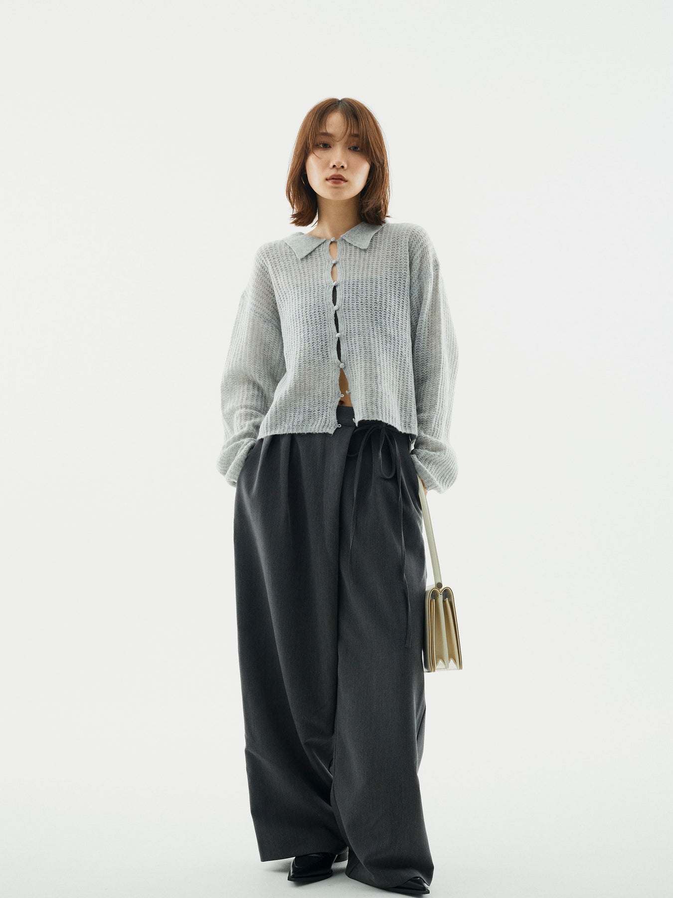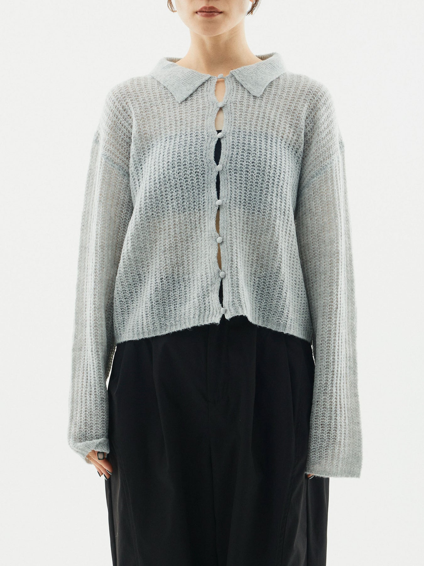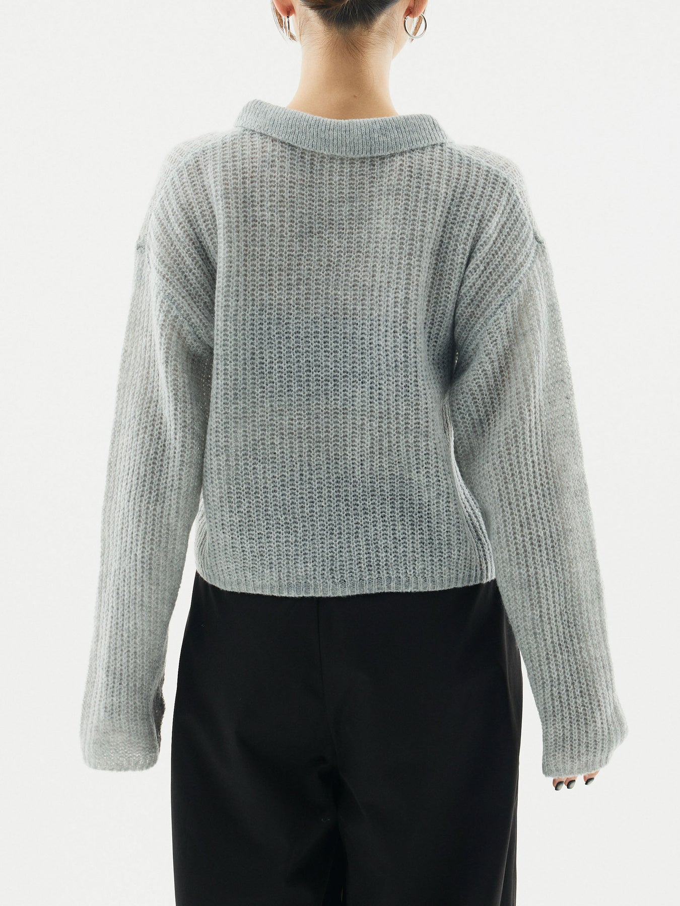 ふんわりとした起毛感と、透け感のある片畦編みが絶妙にマッチした、抜け感たっぷりのポロニット。 軽やかな編地と柔らかな素材感が、季節の変わり目にぴったり。クラシカルなポロカラーデザインに、前立てのループボタンがアクセントを添え、さりげなくこなれた印象に仕上げてくれます。 ゆったりとしたシルエットで、ラフに羽織っても、一枚でトップスとして着てもサマになる1着。キャミやタンクとのレイヤードで透け感を楽しむスタイリングがおすすめです。 大人のカジュアルスタイルに、ほどよい甘さとトレンド感をプラスする主役ニット。