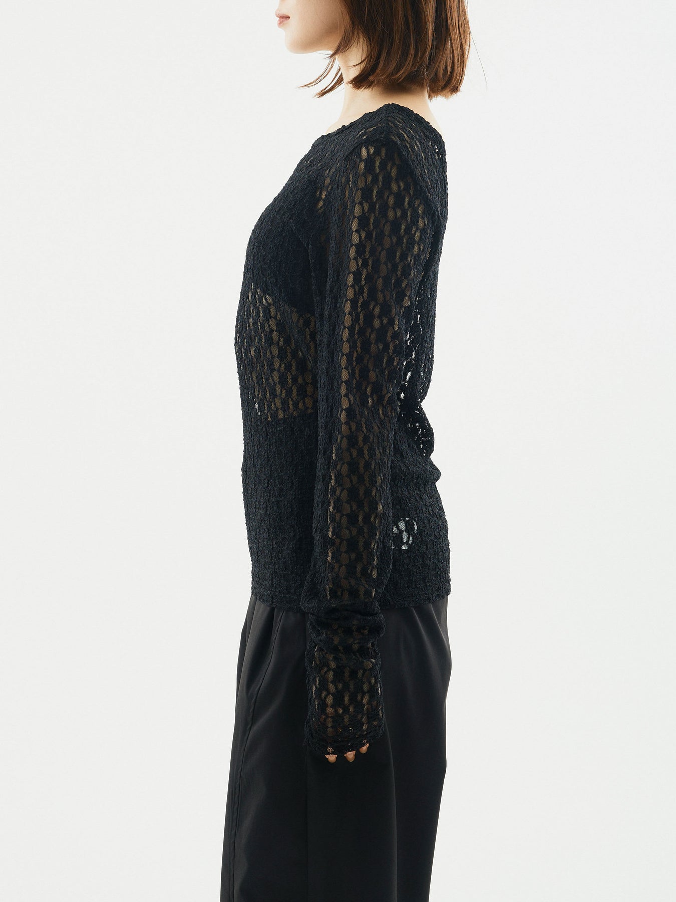 程よい透け感のレースが女性らしさを引き立てる一枚。柔らかく肌なじみの良い素材で着心地も快適。程よく体に沿うシルエットがレイヤードにも最適で、ジャケットやベストのインナー使いとしても活躍します。バックスタイルは緩やかなラウンドカットになっており、抜け感のある着こなしを演出できます。