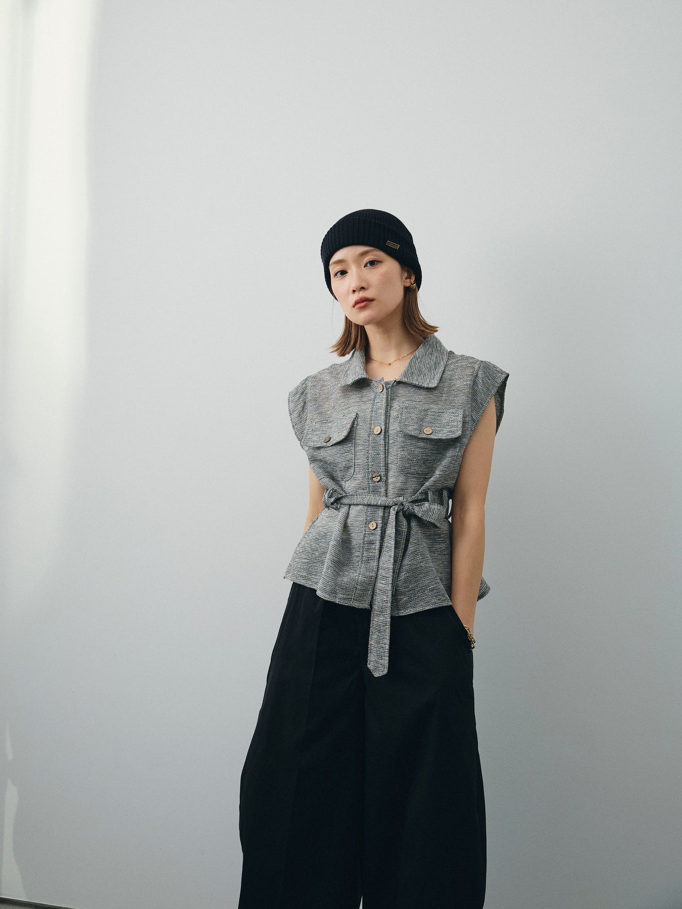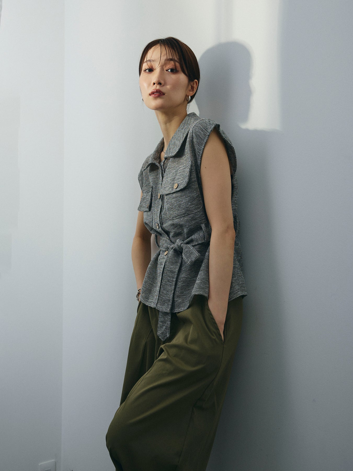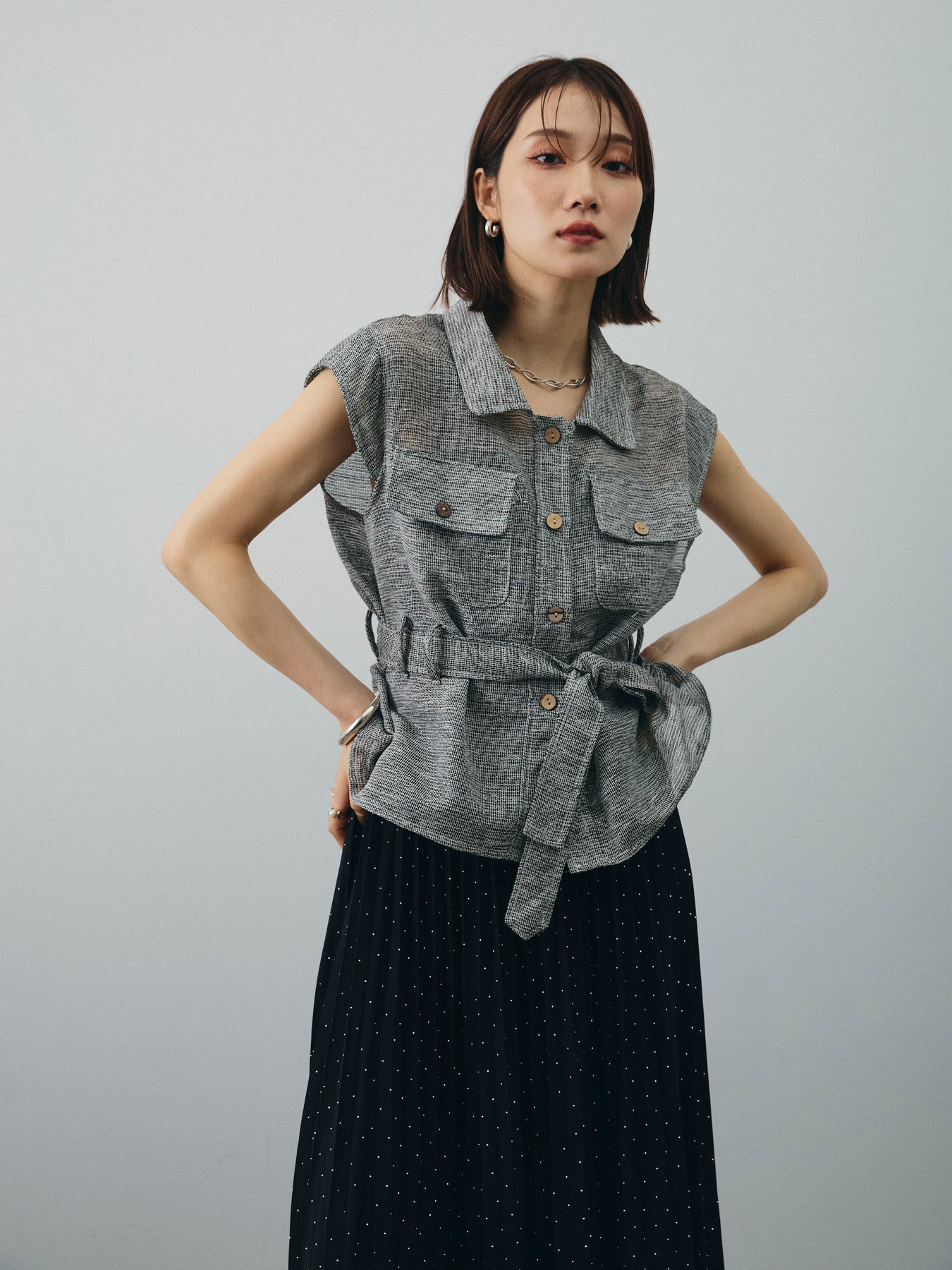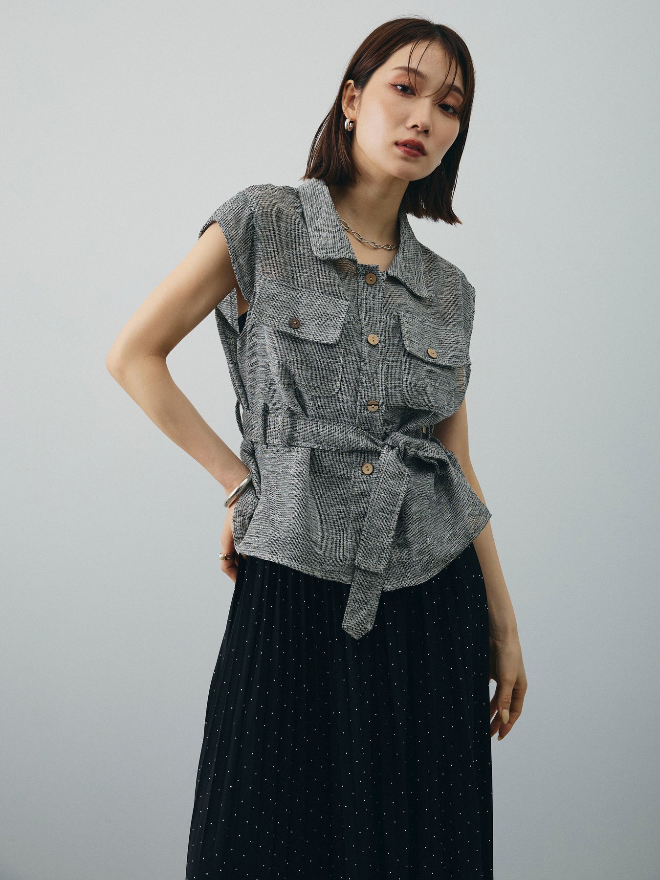 異素材のミックスヤーンで編み上げた、表情豊かなメッシュ素材が魅力のノースリーブブラウス。 通気性に優れた軽やかな着心地と、ニュアンスのある色合いが大人の抜け感を演出します。 ウエストは共布リボン付きで、シルエットにメリハリを出した着こなしが可能。 胸元の大きめポケットや開襟デザインが、カジュアルながらもきちんと感をプラスします。 インナー次第で季節を問わず着回しができ、パンツにもスカートにも合わせやすい万能アイテム。 一枚で主役になる、大人のための涼しげサマーブラウスです。