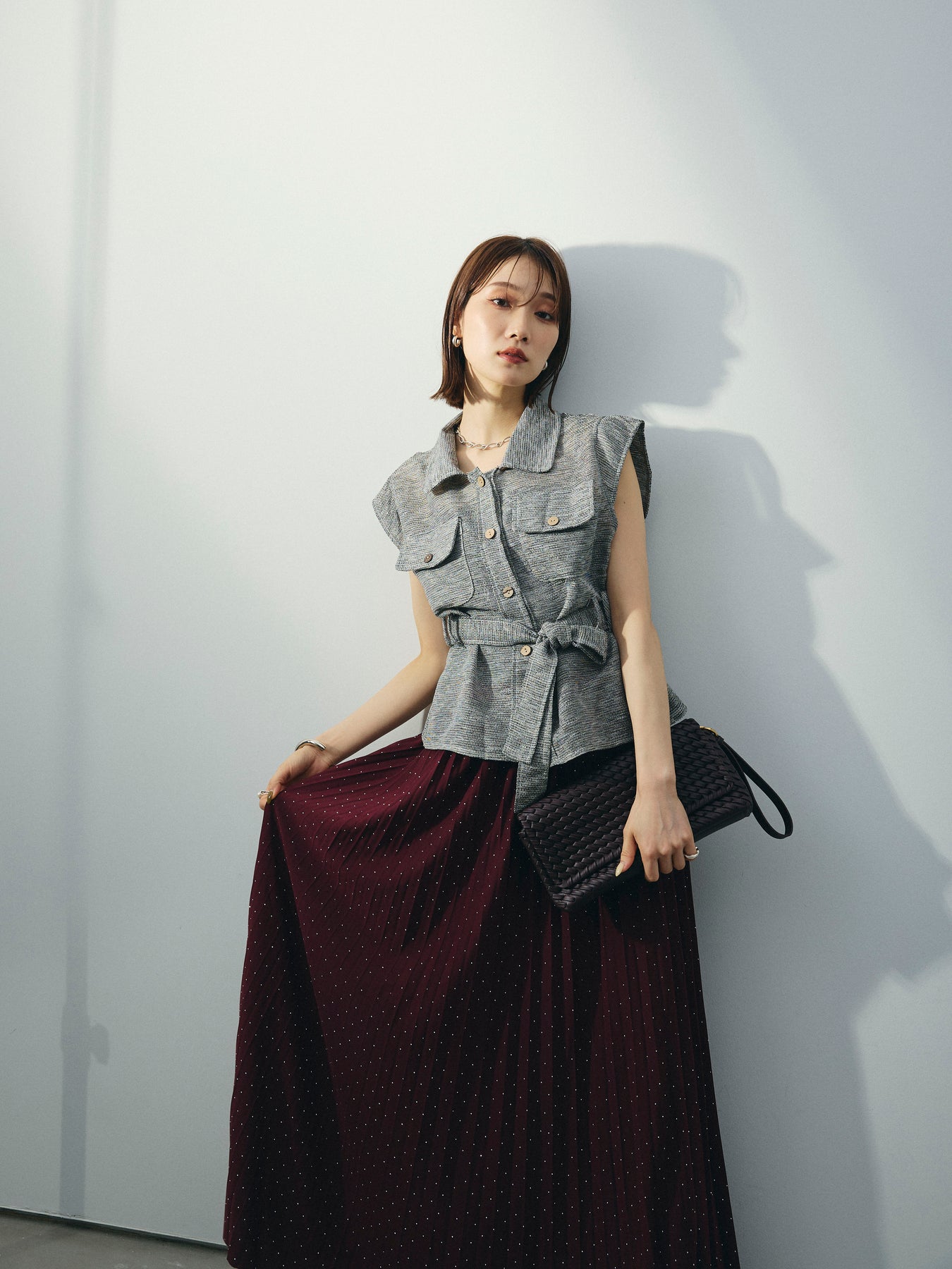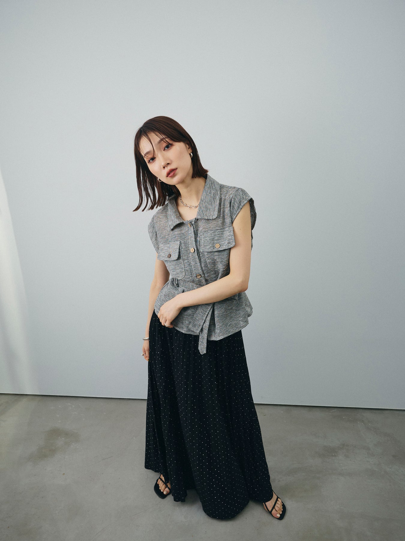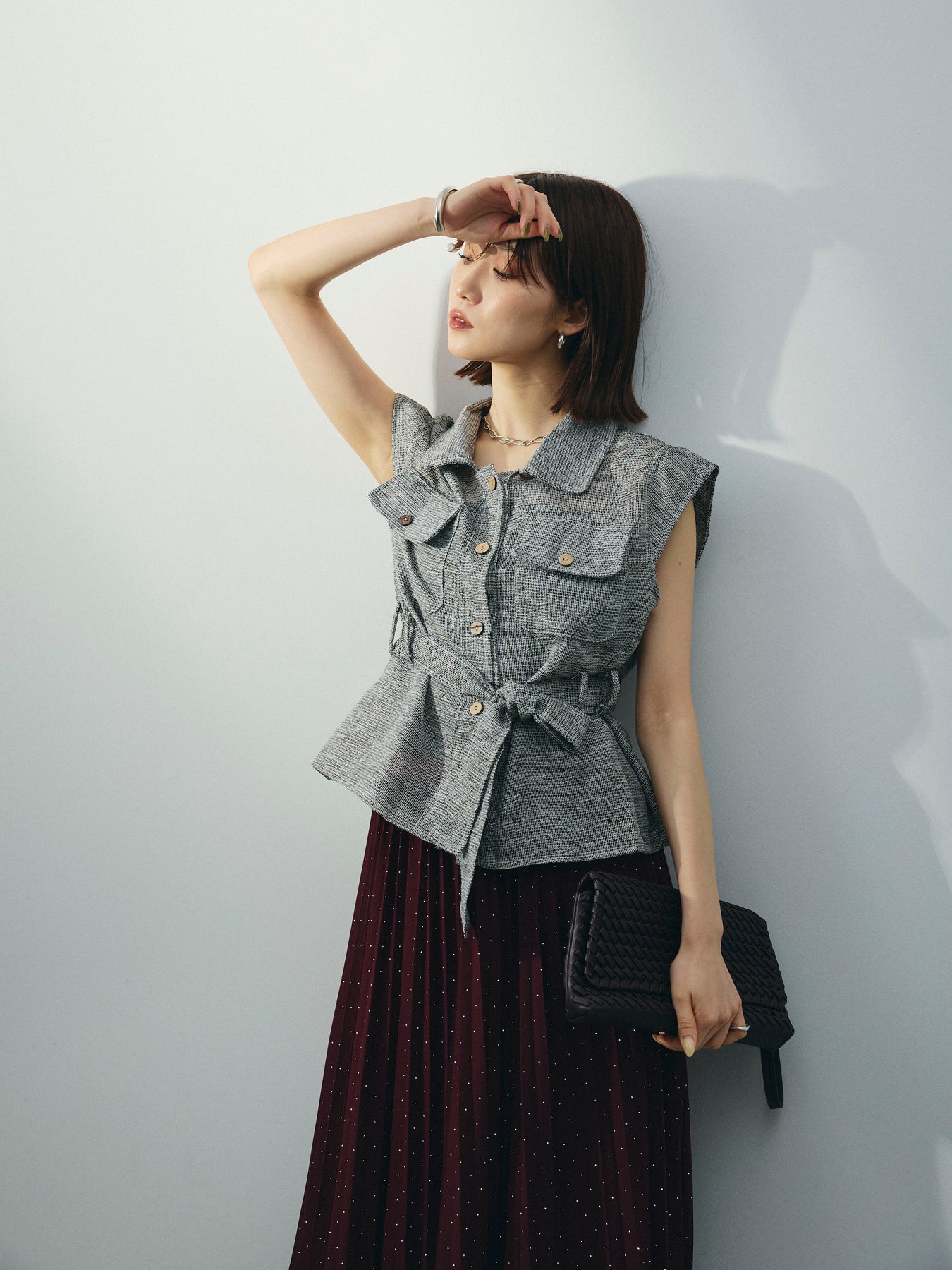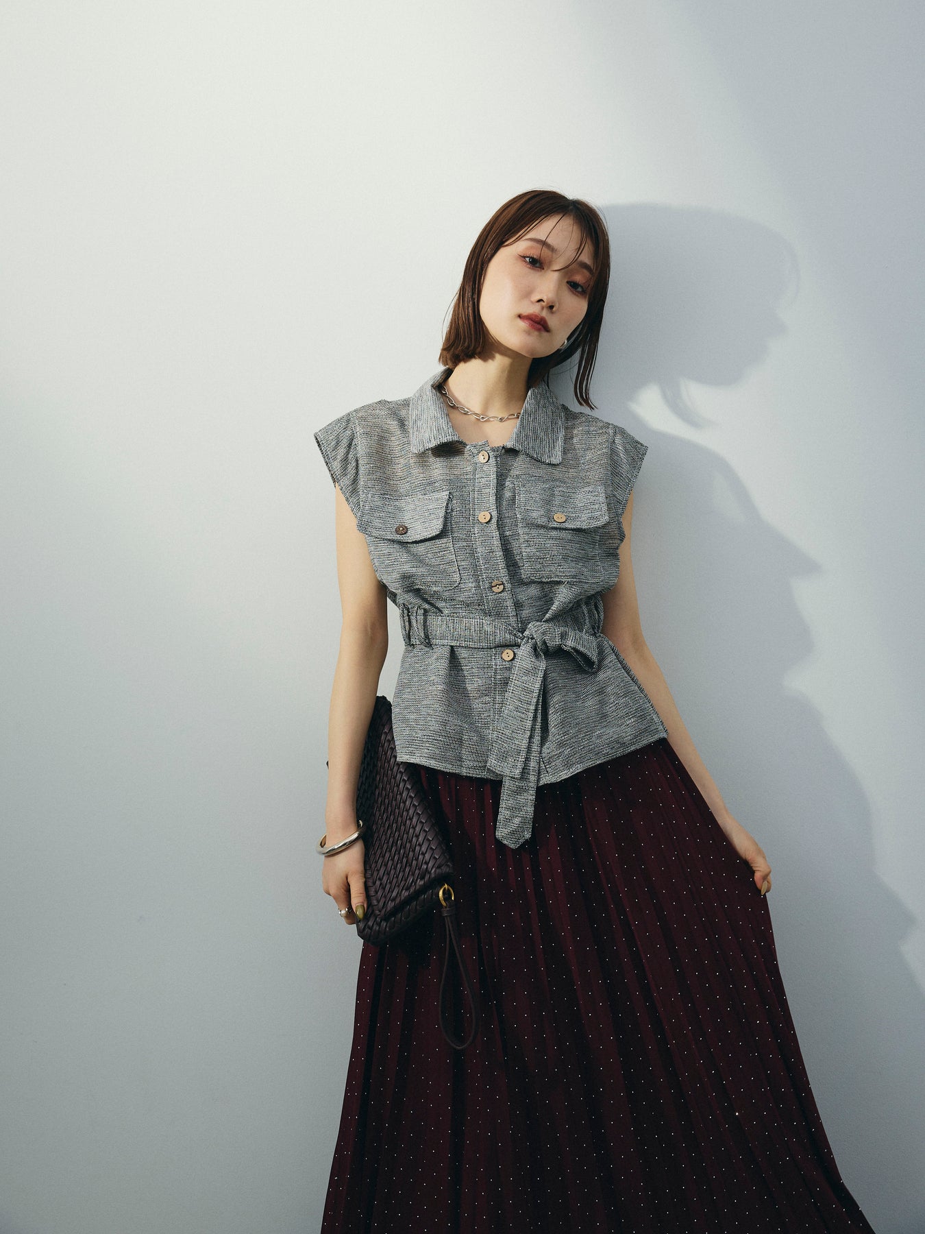 異素材のミックスヤーンで編み上げた、表情豊かなメッシュ素材が魅力のノースリーブブラウス。 通気性に優れた軽やかな着心地と、ニュアンスのある色合いが大人の抜け感を演出します。 ウエストは共布リボン付きで、シルエットにメリハリを出した着こなしが可能。 胸元の大きめポケットや開襟デザインが、カジュアルながらもきちんと感をプラスします。 インナー次第で季節を問わず着回しができ、パンツにもスカートにも合わせやすい万能アイテム。 一枚で主役になる、大人のための涼しげサマーブラウスです。