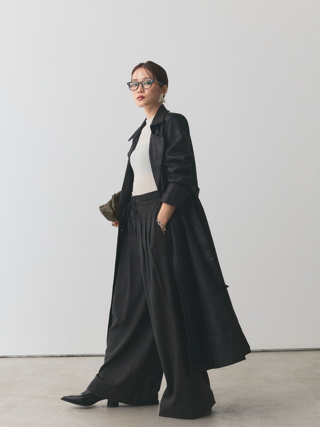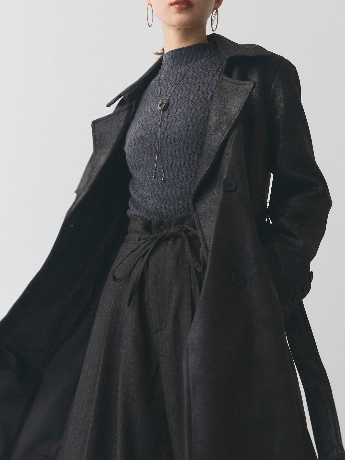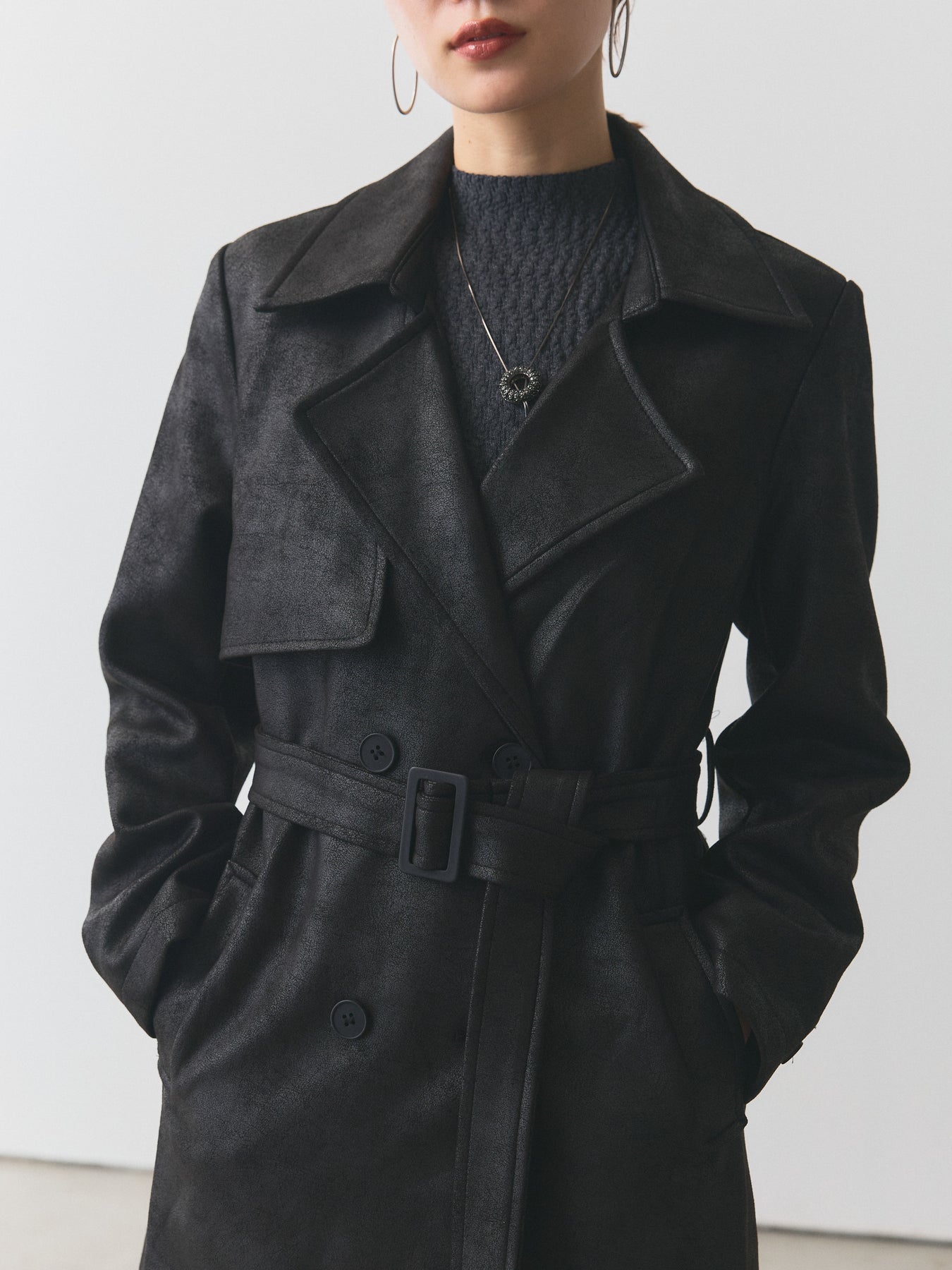 重厚感のあるレザー調素材を使用したトレンチコート。ヴィンテージライクな風合いが大人の雰囲気を漂わせ、羽織るだけでスタイリングを格上げしてくれます。ダブルボタンとウエストベルトのクラシックなディテールを備えつつ、すっきりとしたシルエットで洗練された印象に。パンツにもスカートにも合わせやすく、デイリーから特別なシーンまで幅広く活躍する存在感のある一着です。 ※ボトムス、キャミソール(インナー)以外の商品は一律でインナーは付属していません。