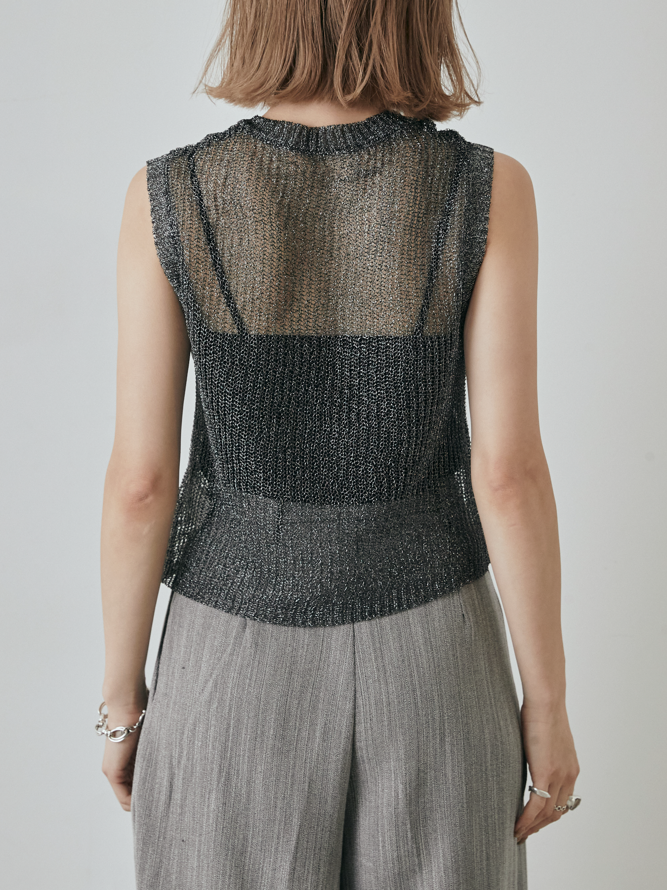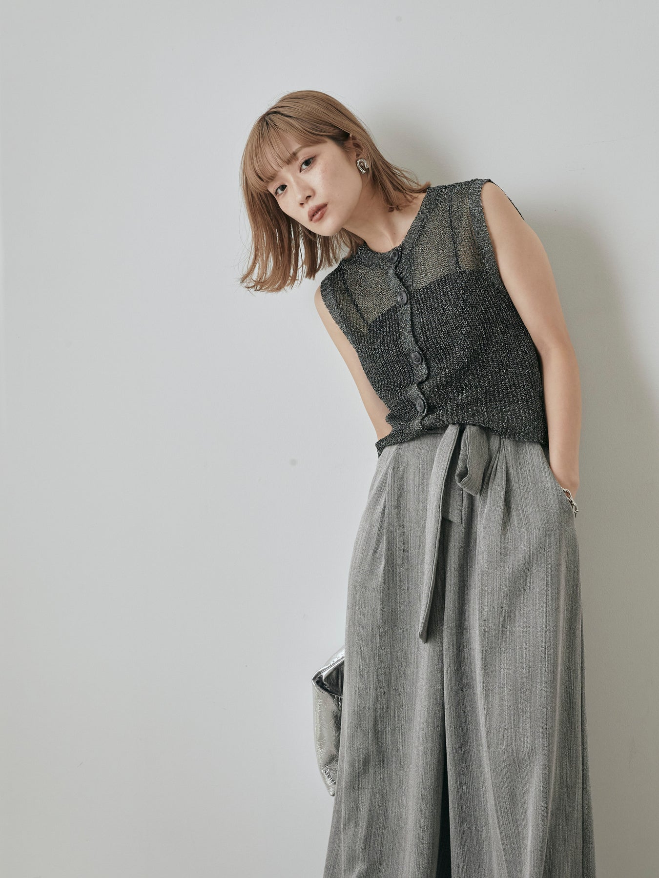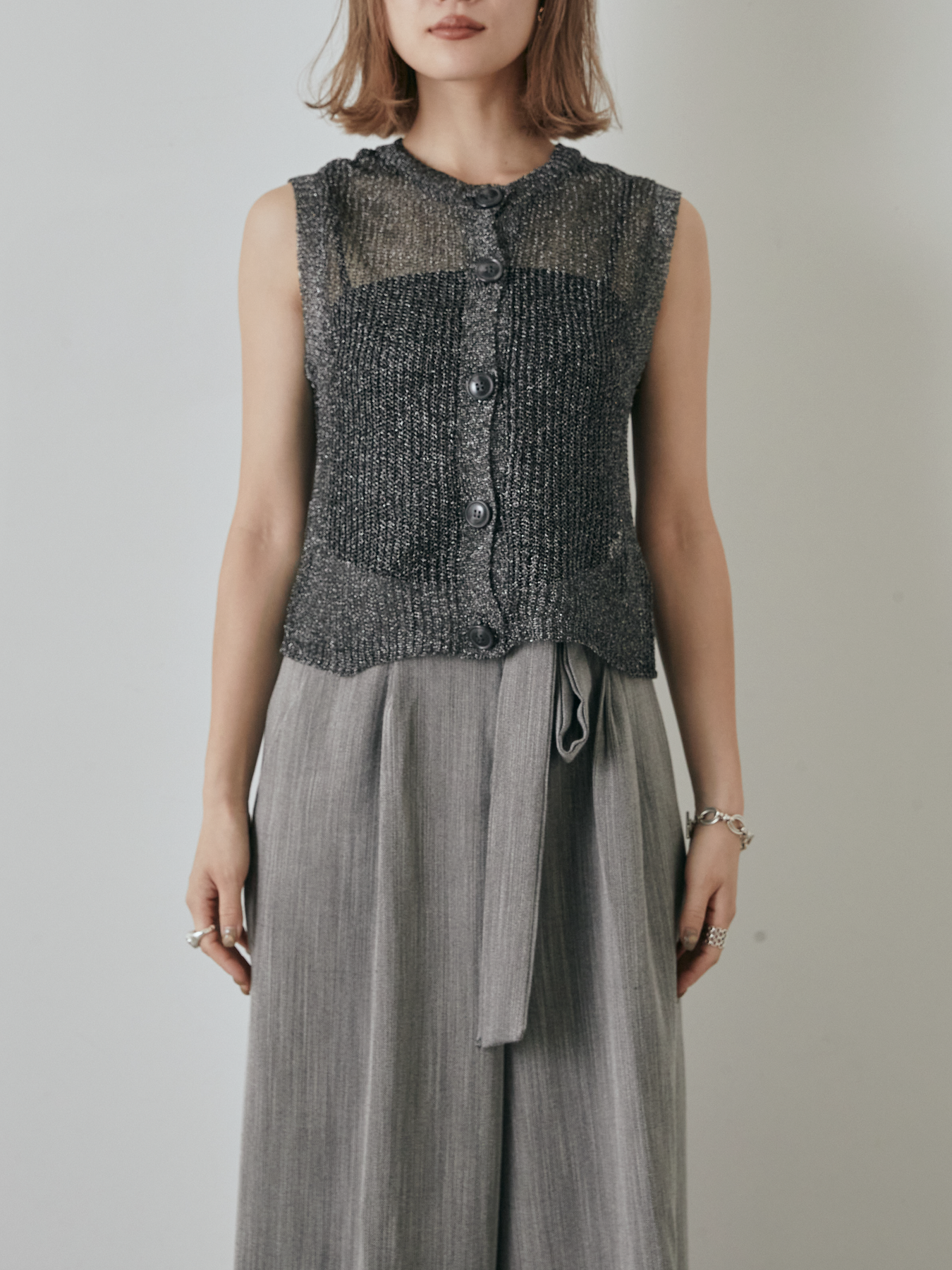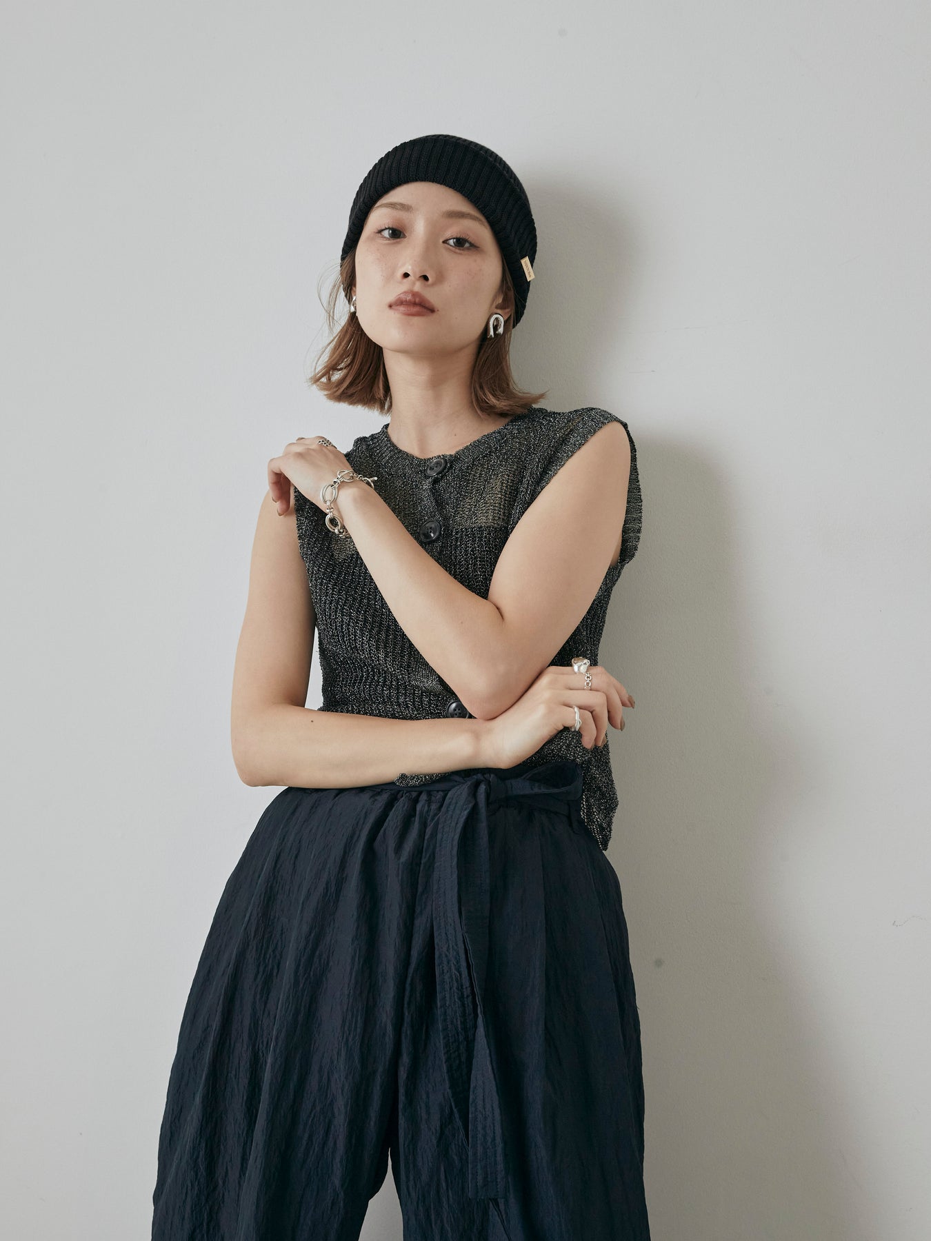 ラメ糸を織り込んだ華やかな表情が魅力の、コード編みニットベスト。 シンプルなシルエットながら、ラメの煌めきがスタイリングに華やぎと抜け感をプラスしてくれる一枚です。 ざっくりとした風合いの編地が、涼しげでナチュラルな印象に。 ゆったりとしつつもコンパクトにまとまる絶妙なサイズ感で、レイヤードしやすく着回し力も抜群です。 フロントはボタン開き仕様で、前を開けて羽織りとしても着用可能。 ワイドパンツやスカートにさらっと合わせるだけで、上品なリラクシースタイルが完成します。