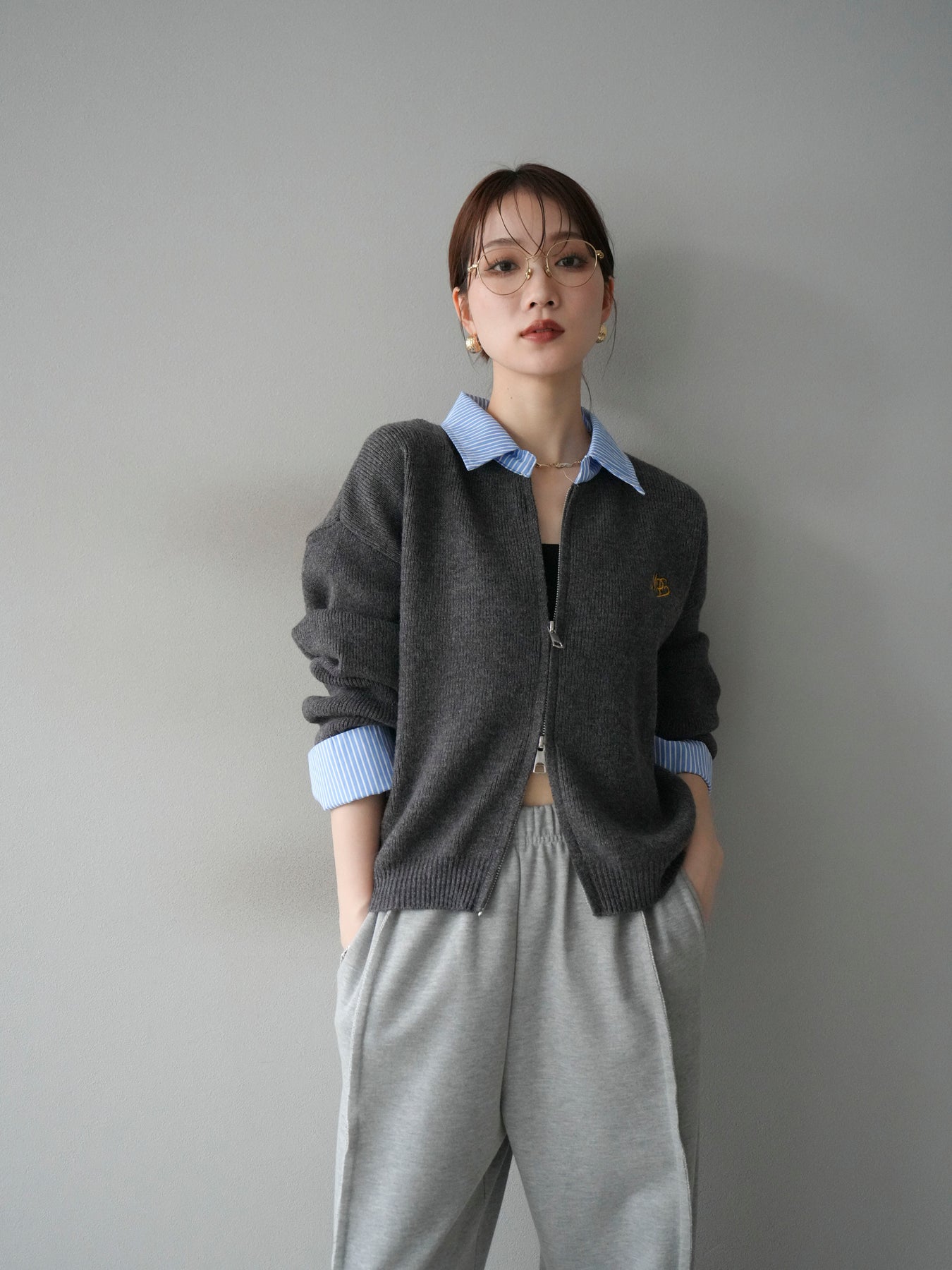 ストライプシャツを重ね着したようなレイヤードデザインが魅力のZIPニットカーディガン。 襟元や袖口から覗くシャツ生地が程よいきちんと感をプラスし、1枚でこなれたスタイルが完成します。 胸元の刺繍ロゴがさりげないアクセントとなり、カジュアルながらも上品な印象に。 ジップを開けて羽織りとしても、閉めてトップス風にも着られる万能アイテムです。 デニムやスラックス、スカートなど、どんなボトムとも相性の良い一枚です。 ※ボトムス、キャミソール(インナー)以外の商品は一律でインナーは付属していません。