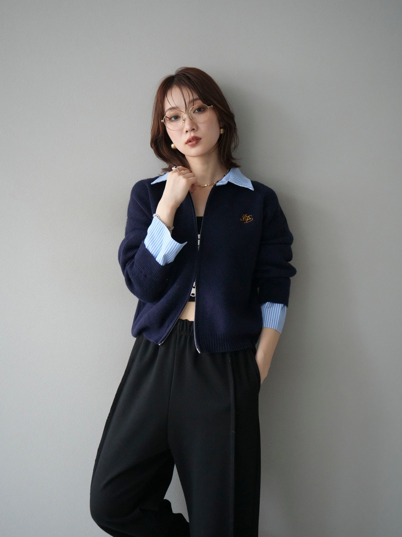 [予約]ストライプシャツレイヤードZIPニットカーディガン/navy