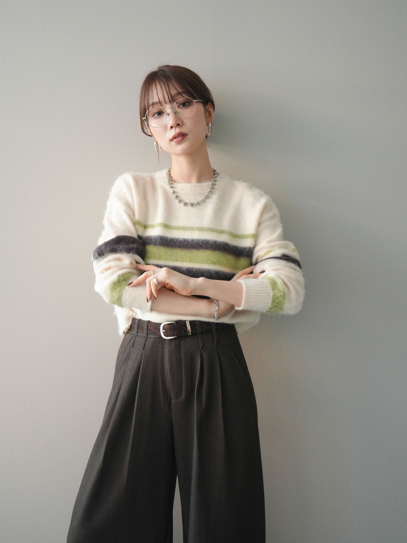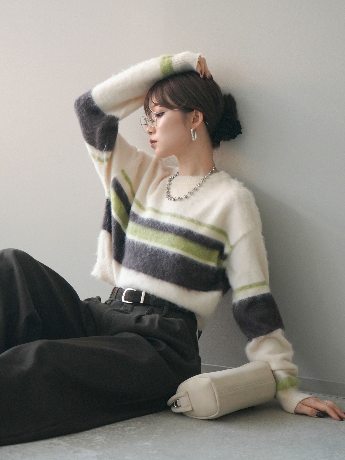 柔らかなソフトタッチ素材で仕立てた、軽やかな着心地のボーダーニットプルオーバー。程よく起毛した風合いが季節感を引き立てつつ、クロップド丈がスタイリングに抜け感とバランスの良さをプラスします。配色ラインがさりげないアクセントになり、シンプルながらも表情のある1枚に。ハイウエストのボトムスとも相性よく、デイリーに使いやすい万能ニットです。 ※ボトムス、キャミソール(インナー)以外の商品は一律でインナーは付属していません。