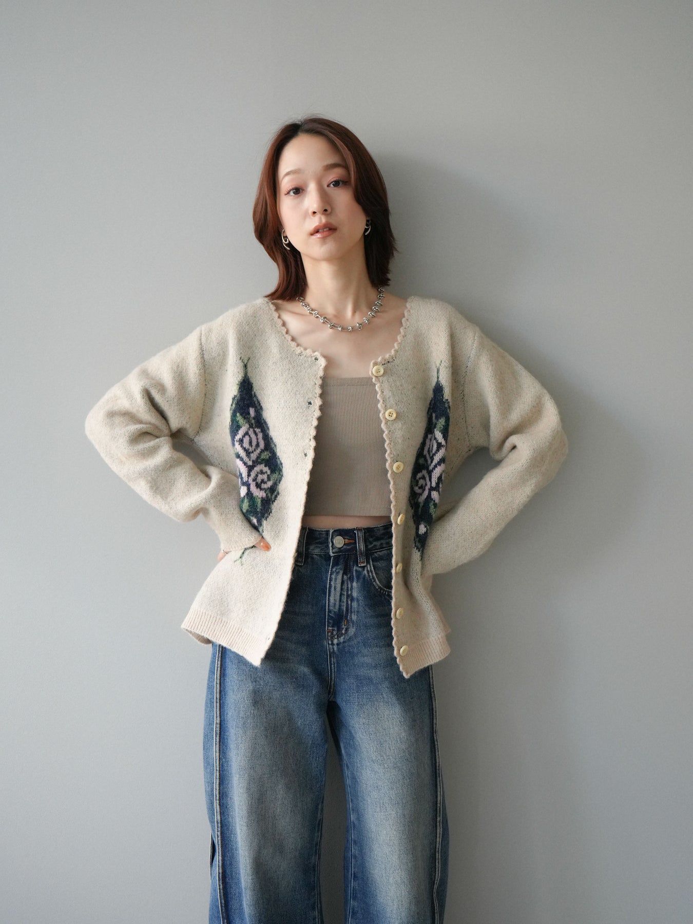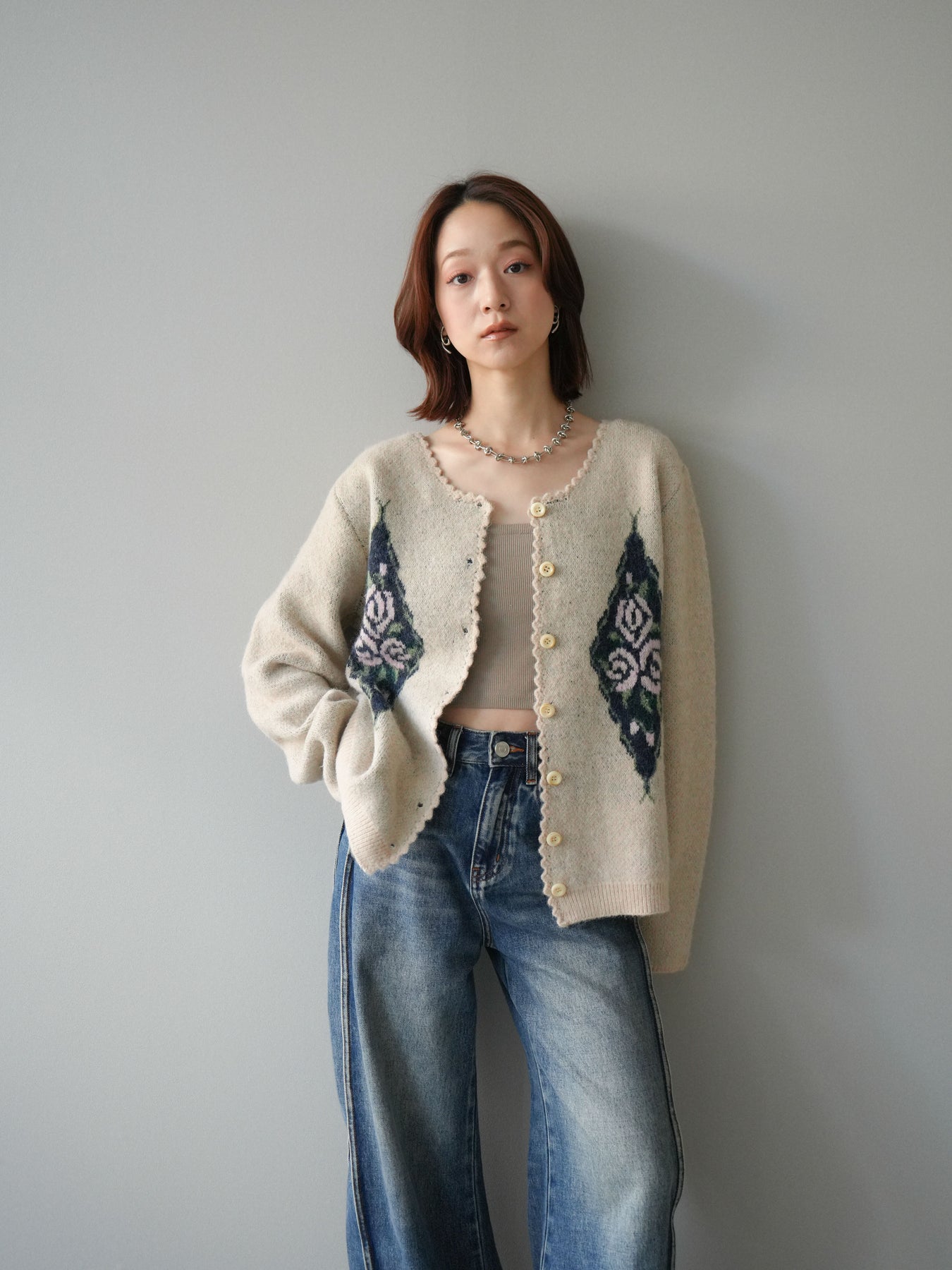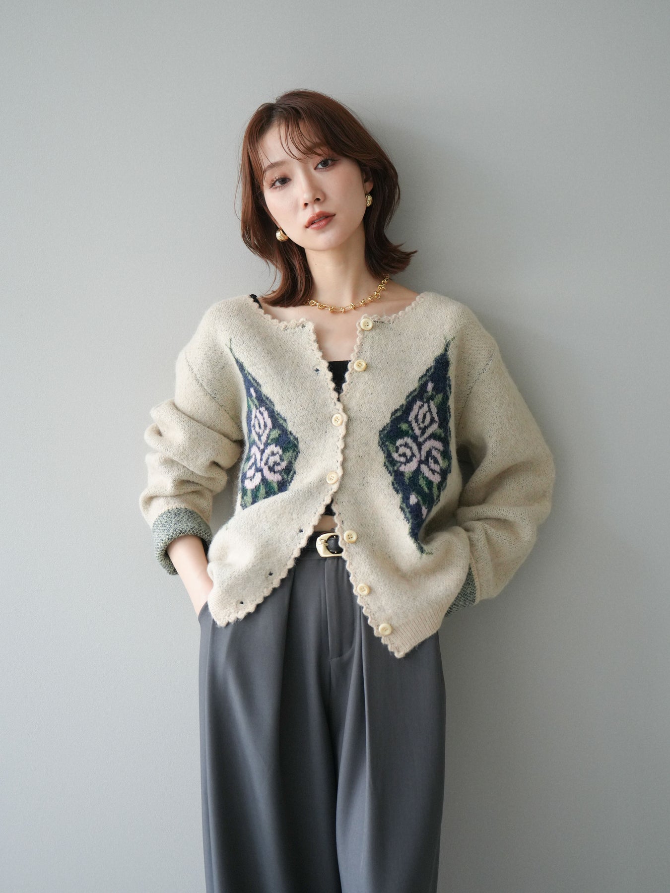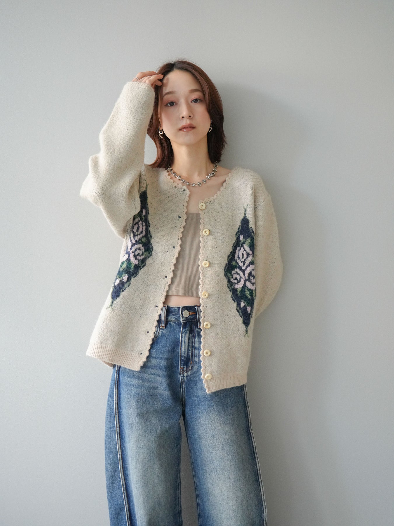 アンティーク調のフラワージャガード柄が目を惹くニットカーディガン。 ふんわりとした柔らかな風合いで、シーズンムードたっぷりに仕上げました。 レトロな柄行きと配色が上品な存在感を放ち、1枚でスタイリングの主役になるアイテムです。 ゆったりとしたシルエットで抜け感を演出し、羽織りとしてもボタンを閉めてトップス風にも着用可能。 カジュアルからフェミニンまで幅広いコーディネートにマッチする、今季注目の1着です。 ※ボトムス、キャミソール(インナー)以外の商品は一律でインナーは付属していません。
