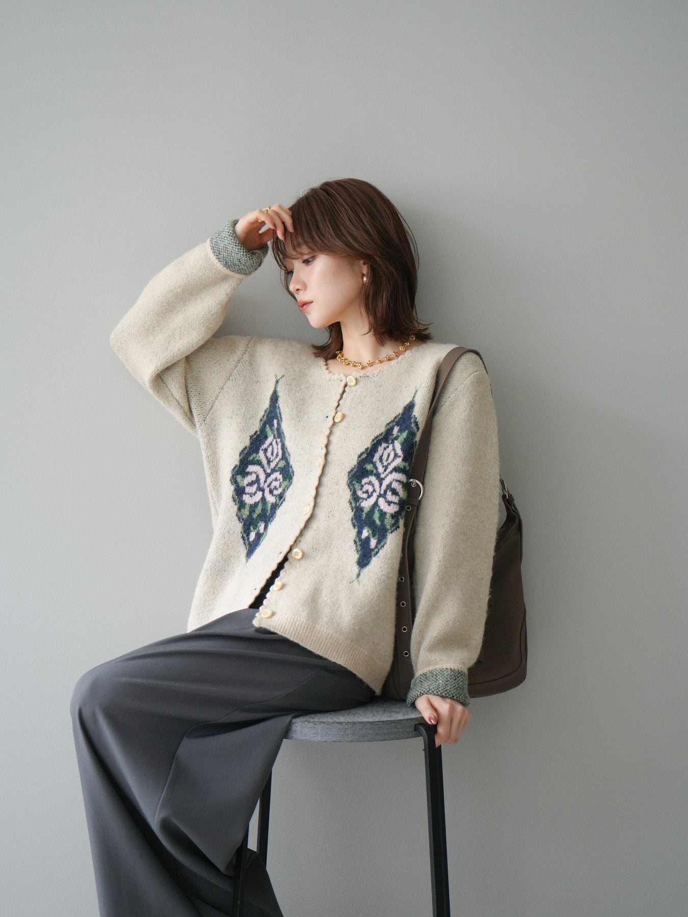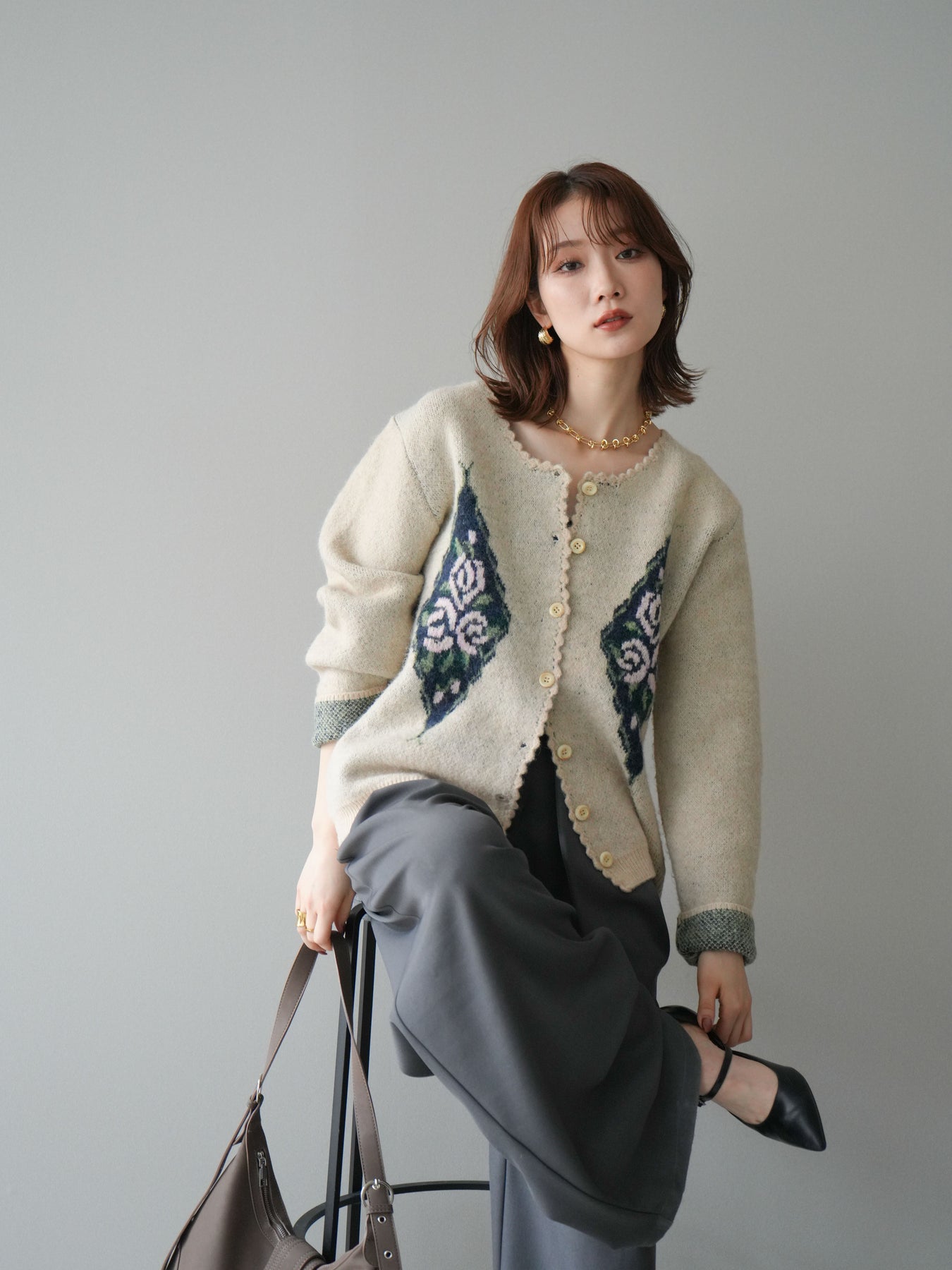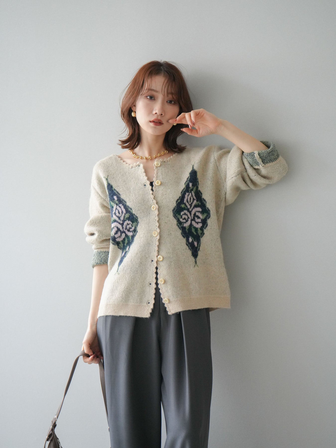 アンティーク調のフラワージャガード柄が目を惹くニットカーディガン。 ふんわりとした柔らかな風合いで、シーズンムードたっぷりに仕上げました。 レトロな柄行きと配色が上品な存在感を放ち、1枚でスタイリングの主役になるアイテムです。 ゆったりとしたシルエットで抜け感を演出し、羽織りとしてもボタンを閉めてトップス風にも着用可能。 カジュアルからフェミニンまで幅広いコーディネートにマッチする、今季注目の1着です。 ※ボトムス、キャミソール(インナー)以外の商品は一律でインナーは付属していません。