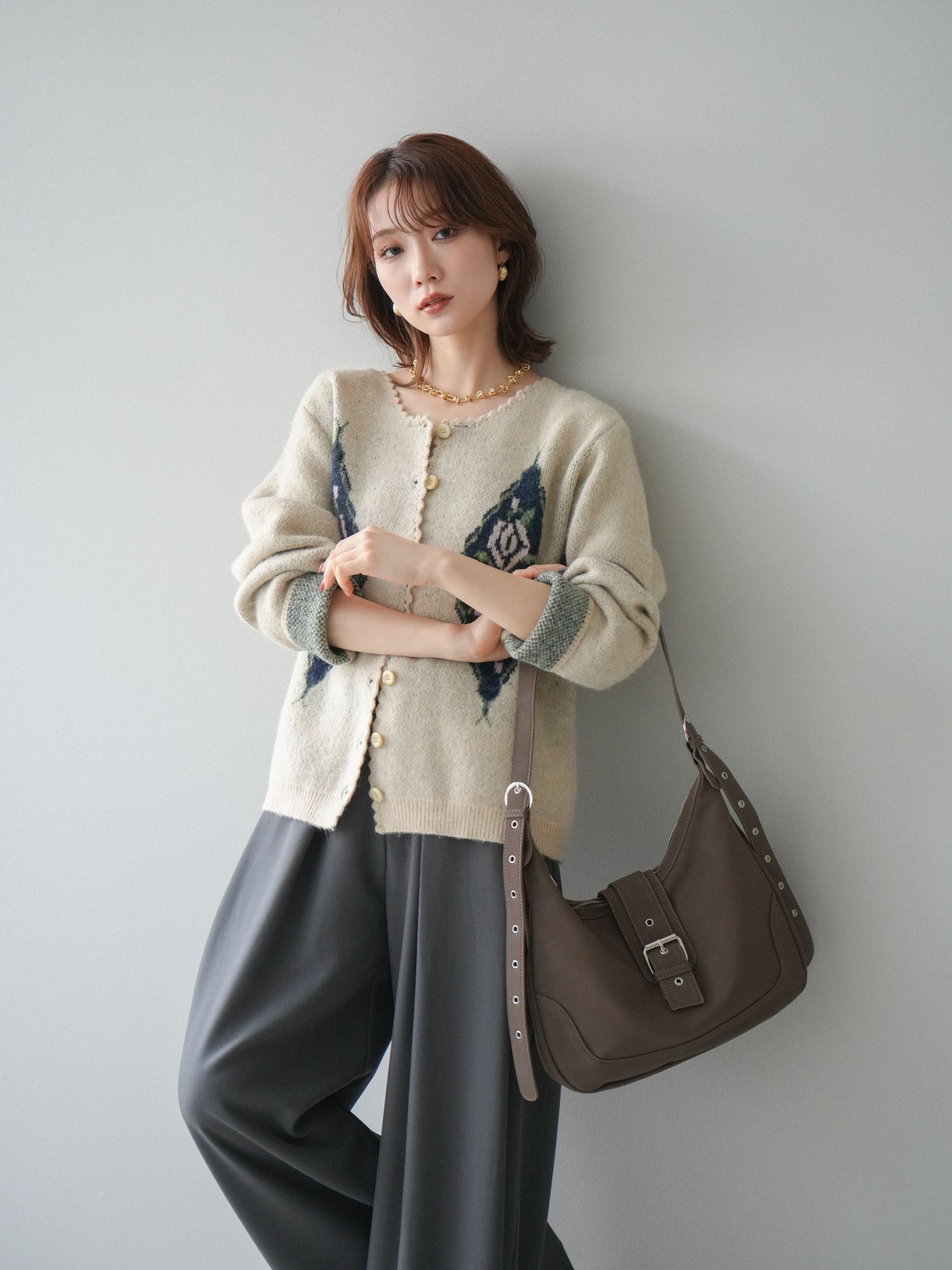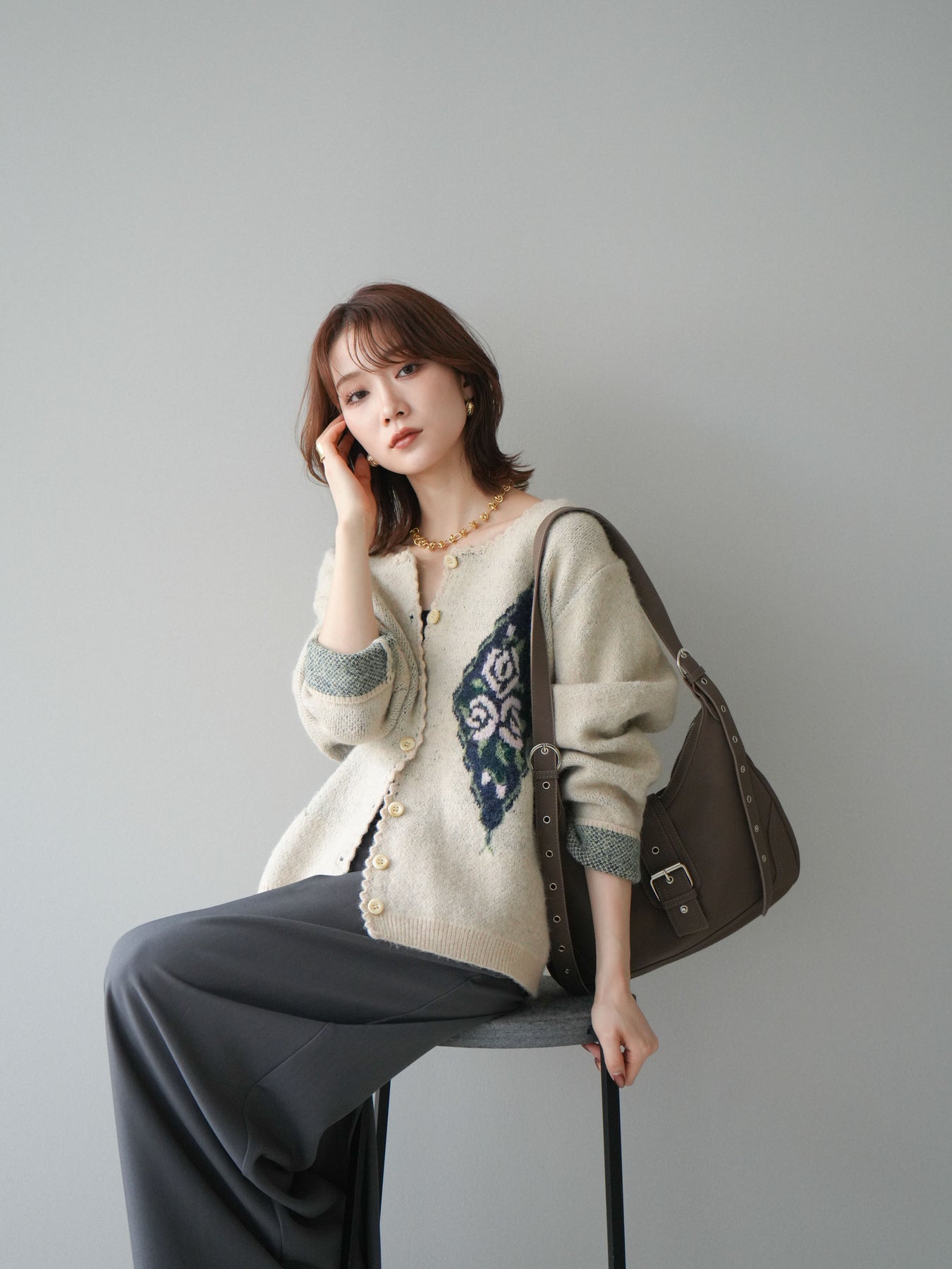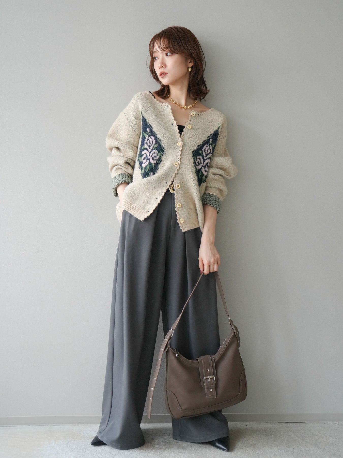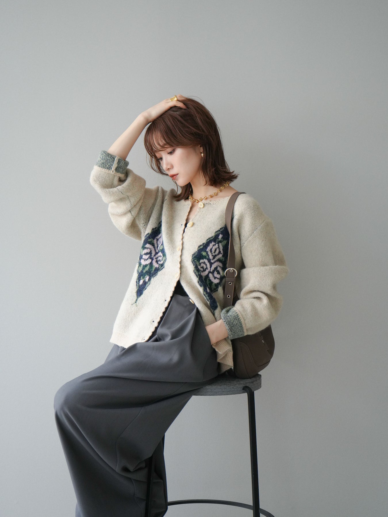 アンティーク調のフラワージャガード柄が目を惹くニットカーディガン。 ふんわりとした柔らかな風合いで、シーズンムードたっぷりに仕上げました。 レトロな柄行きと配色が上品な存在感を放ち、1枚でスタイリングの主役になるアイテムです。 ゆったりとしたシルエットで抜け感を演出し、羽織りとしてもボタンを閉めてトップス風にも着用可能。 カジュアルからフェミニンまで幅広いコーディネートにマッチする、今季注目の1着です。 ※ボトムス、キャミソール(インナー)以外の商品は一律でインナーは付属していません。
