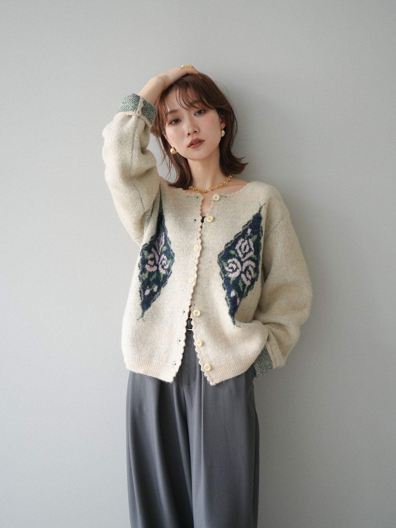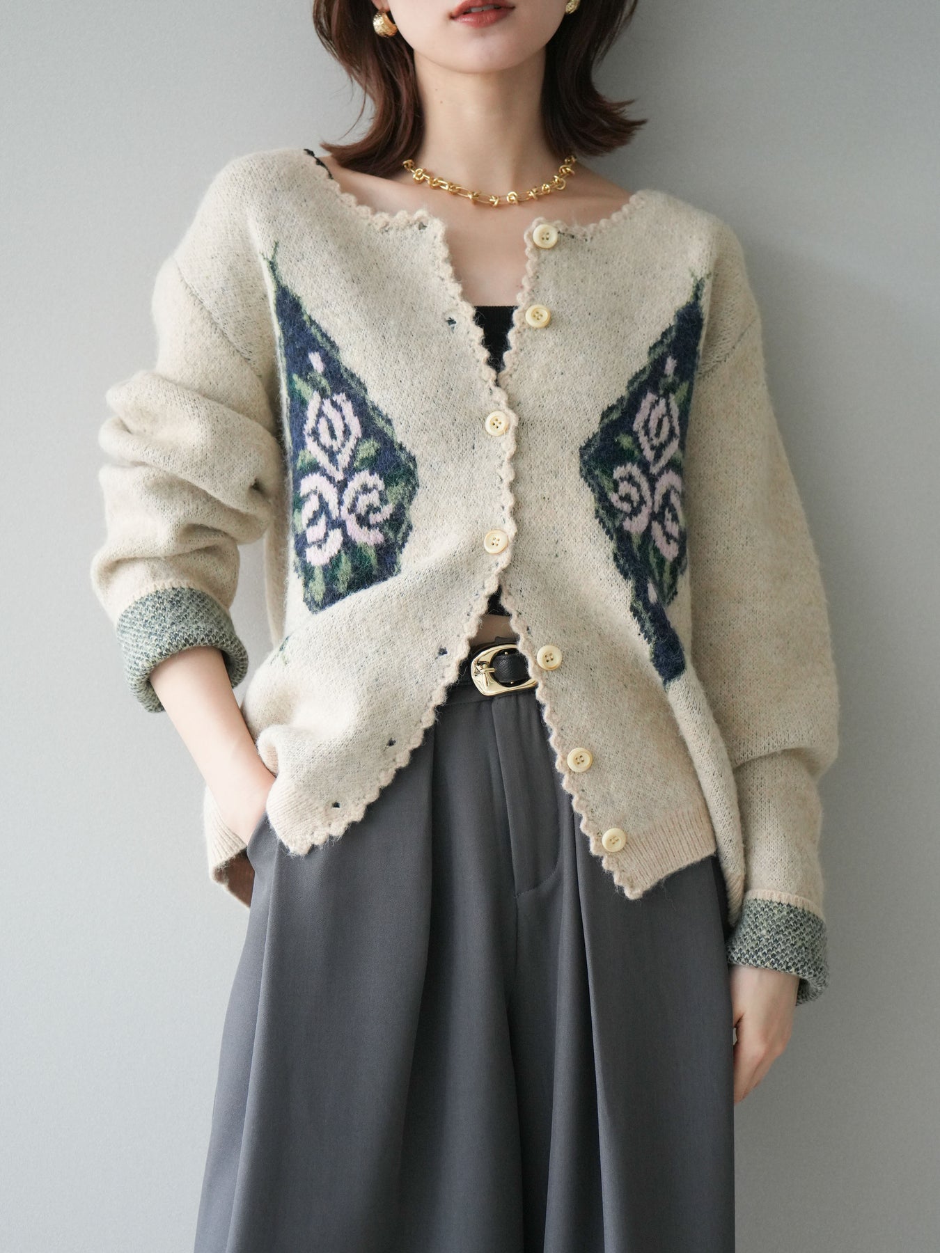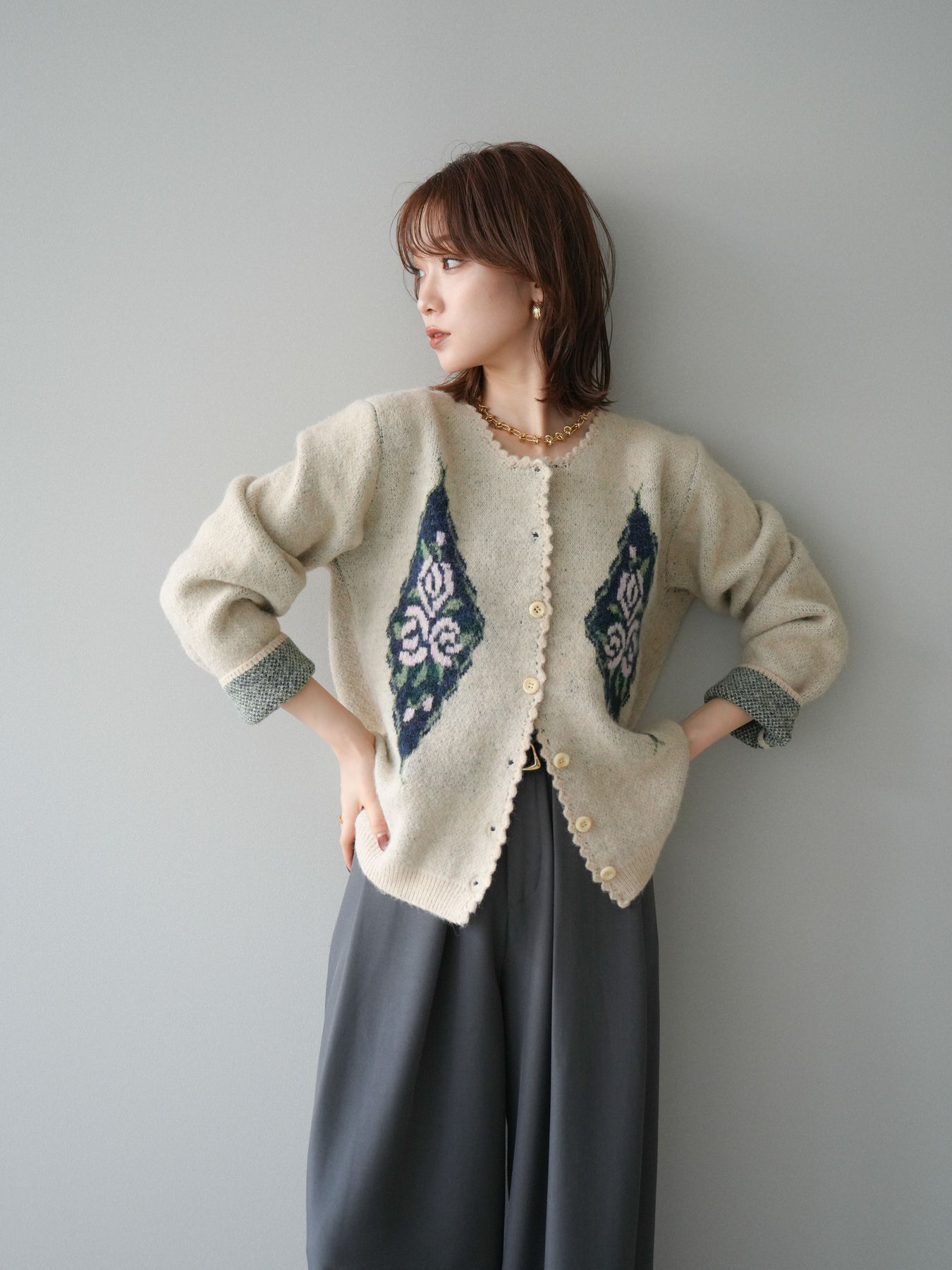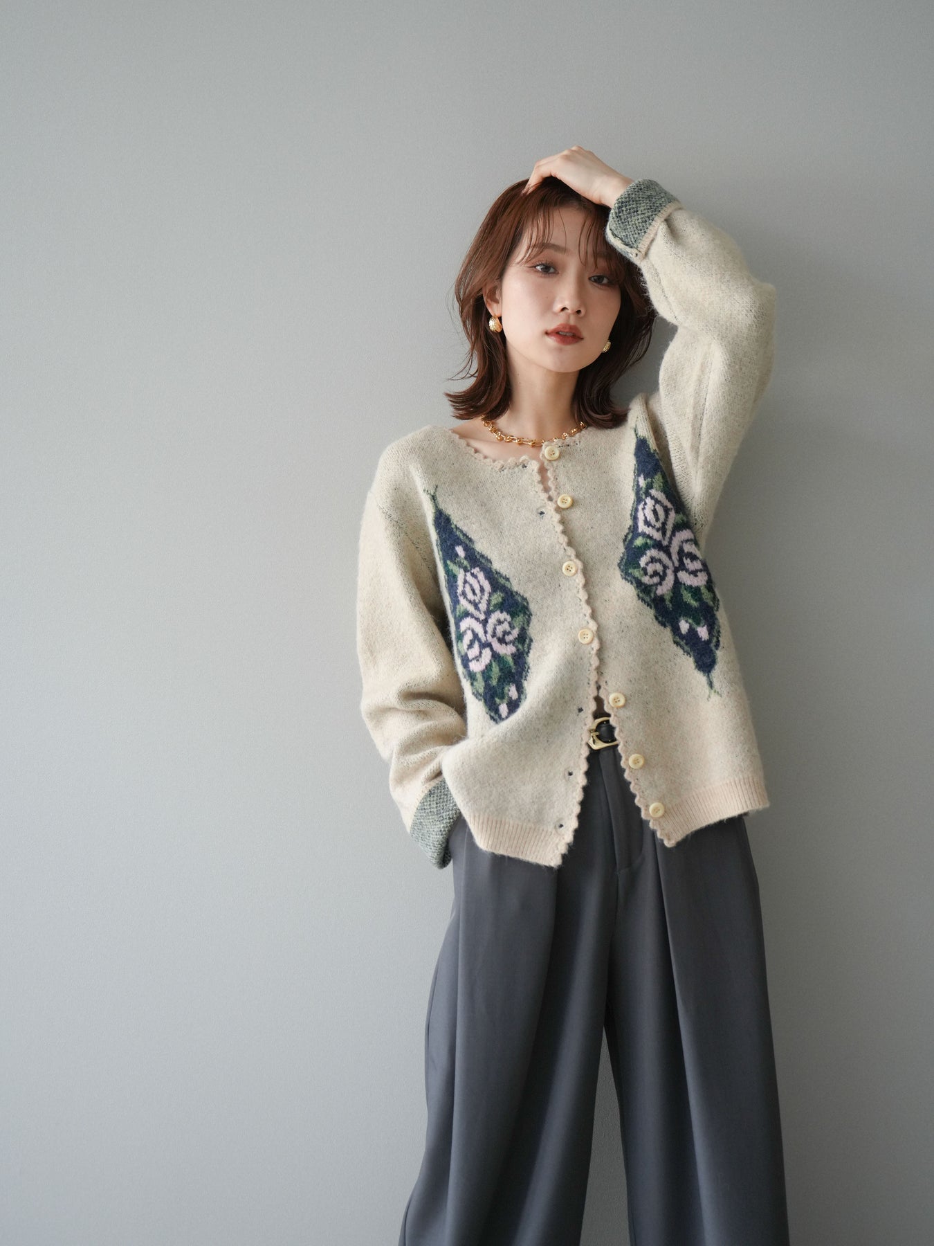 [予約]アンティークフラワージャガードニットカーディガンに関連する商品を探す↓