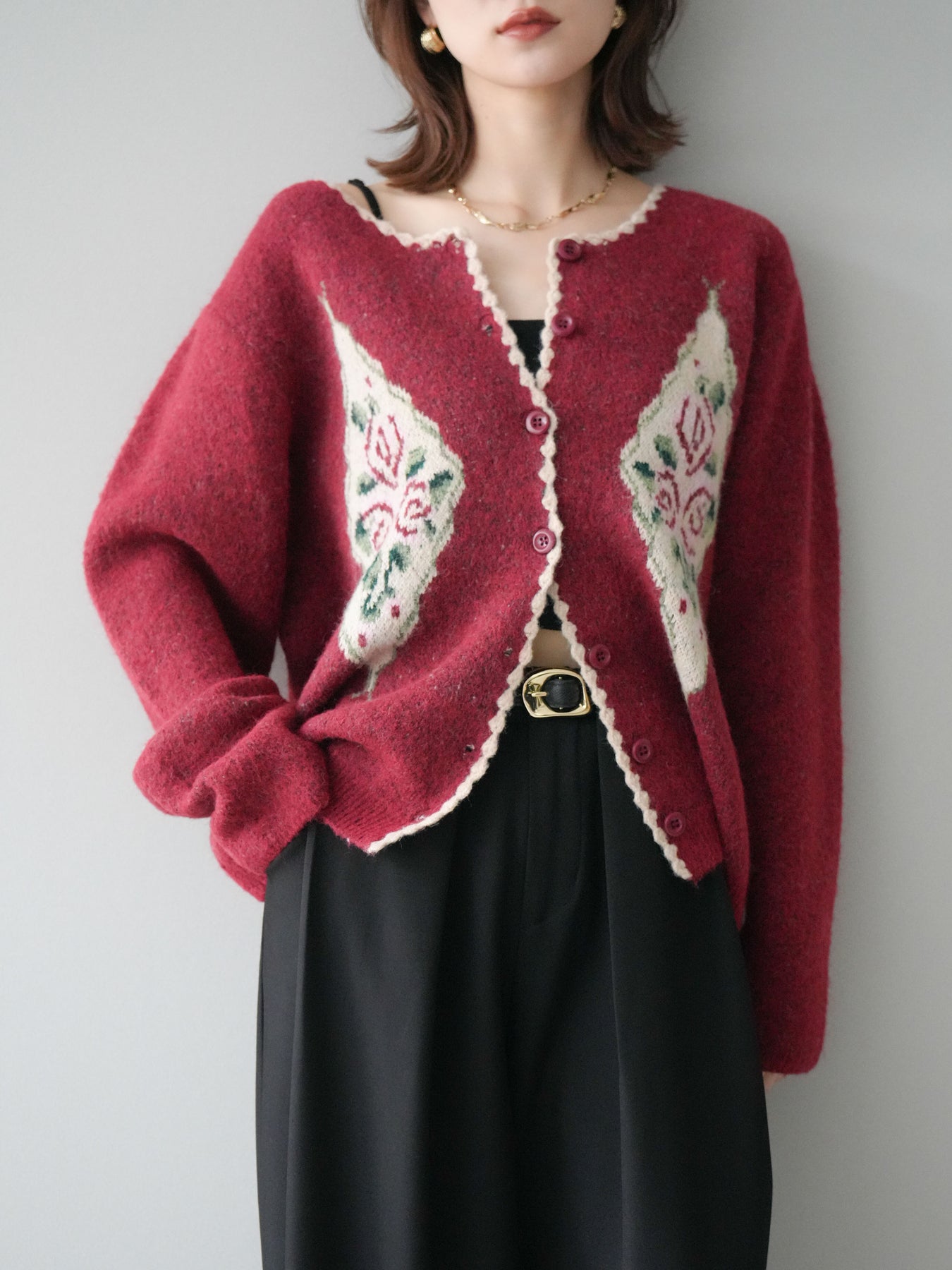 アンティーク調のフラワージャガード柄が目を惹くニットカーディガン。 ふんわりとした柔らかな風合いで、シーズンムードたっぷりに仕上げました。 レトロな柄行きと配色が上品な存在感を放ち、1枚でスタイリングの主役になるアイテムです。 ゆったりとしたシルエットで抜け感を演出し、羽織りとしてもボタンを閉めてトップス風にも着用可能。 カジュアルからフェミニンまで幅広いコーディネートにマッチする、今季注目の1着です。 ※ボトムス、キャミソール(インナー)以外の商品は一律でインナーは付属していません。