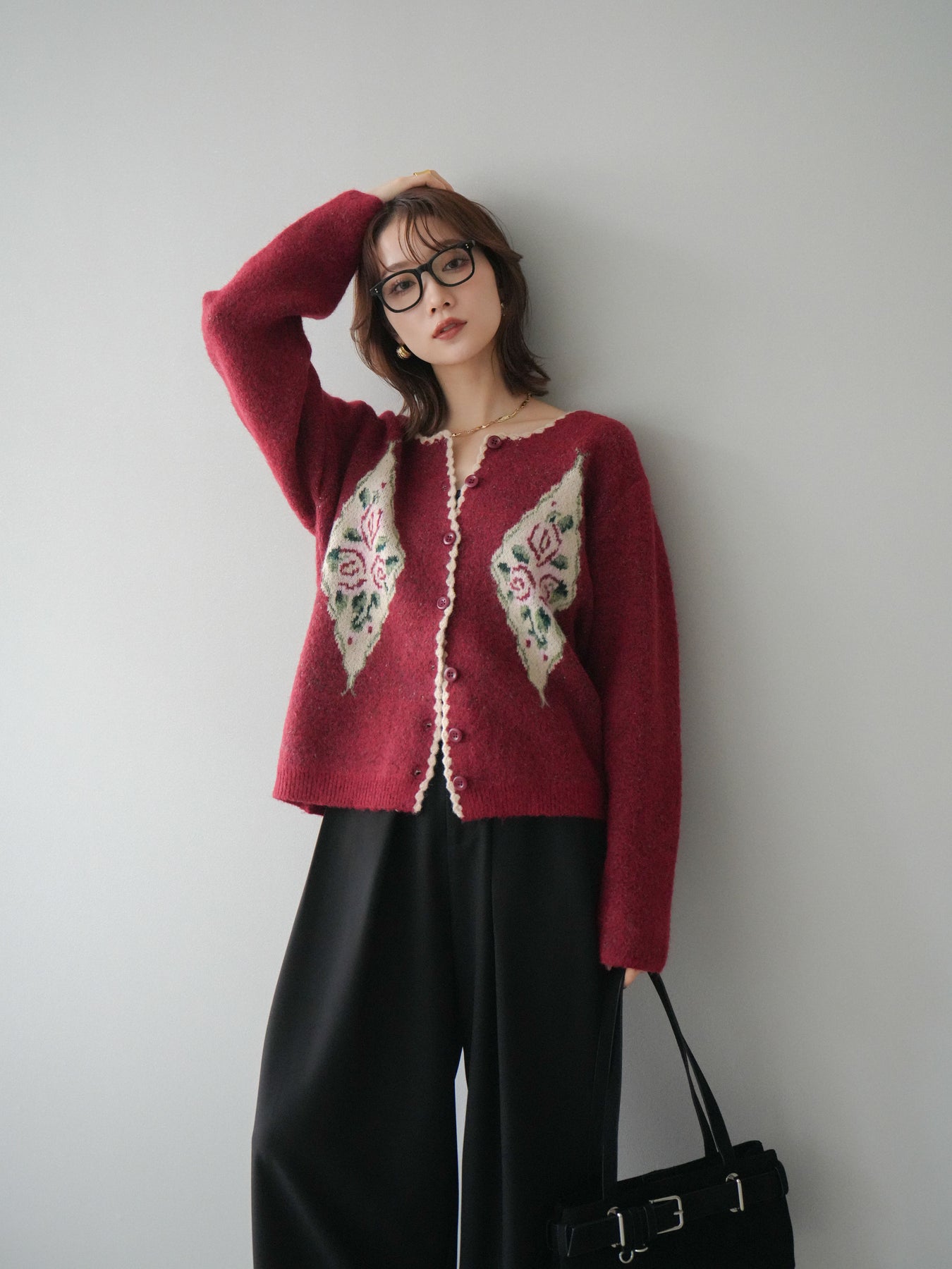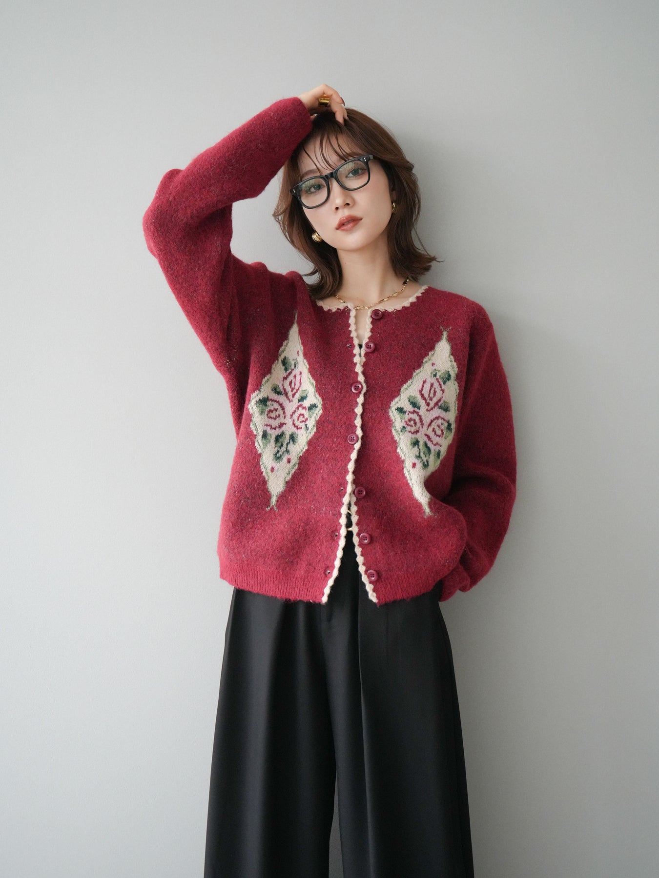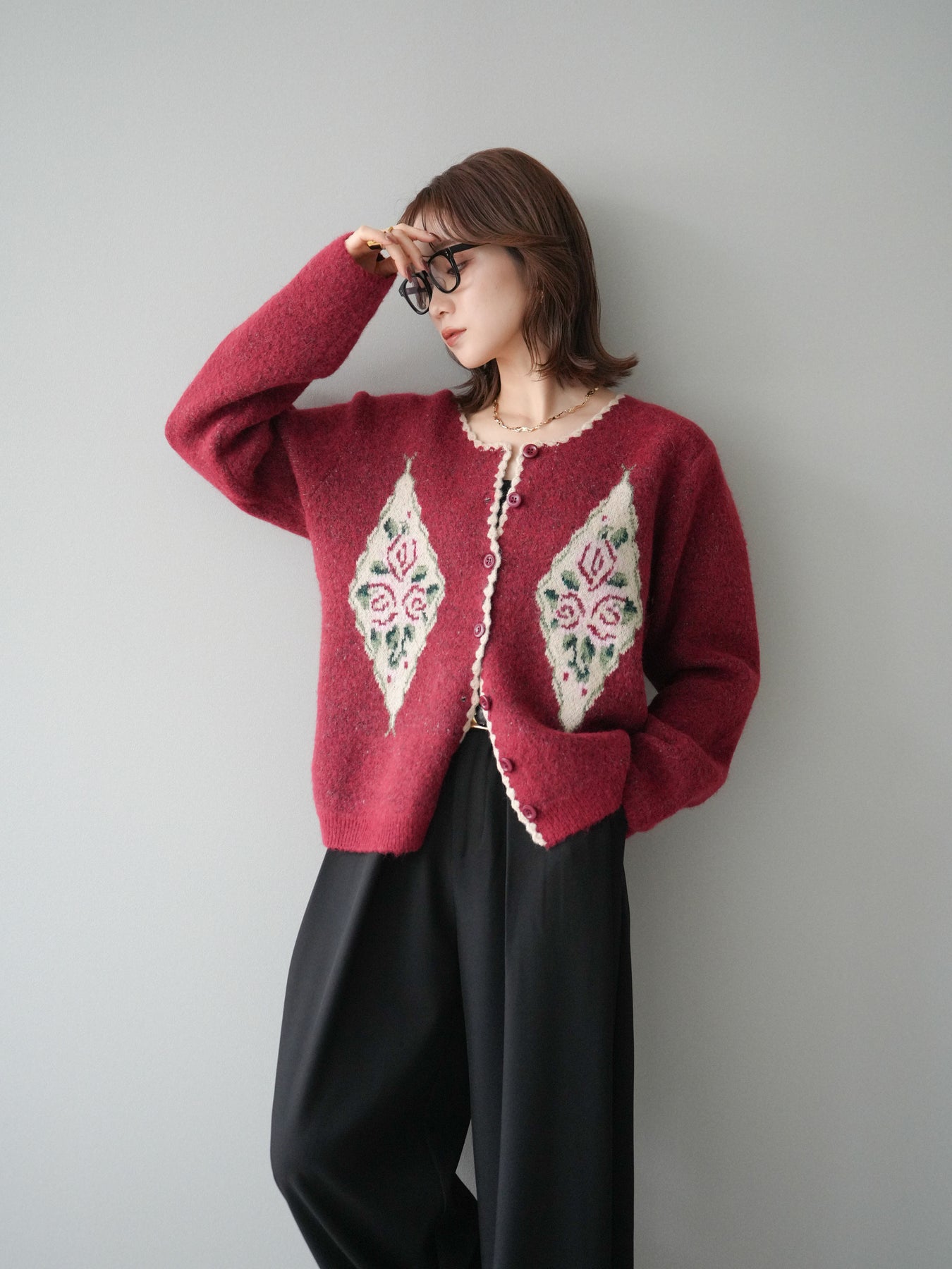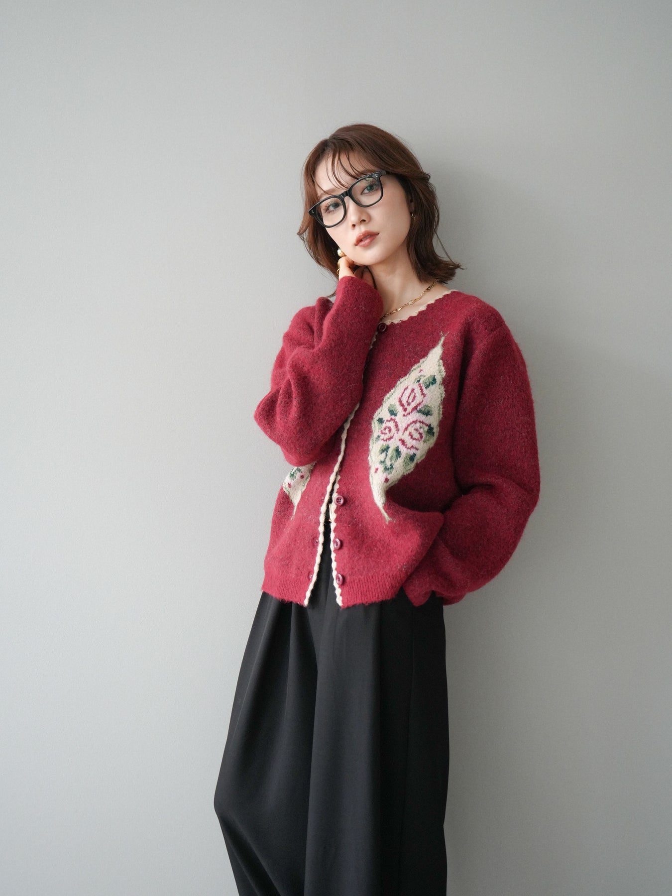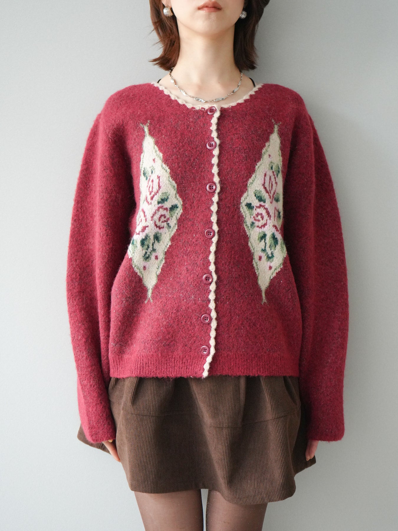 [予約]アンティークフラワージャガードニットカーディガン/red