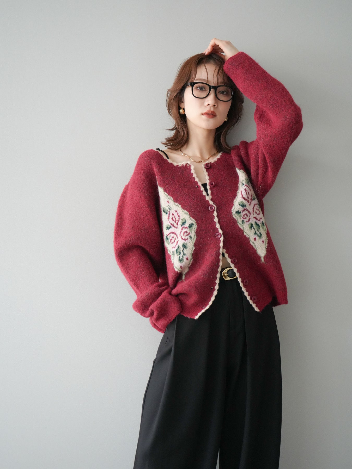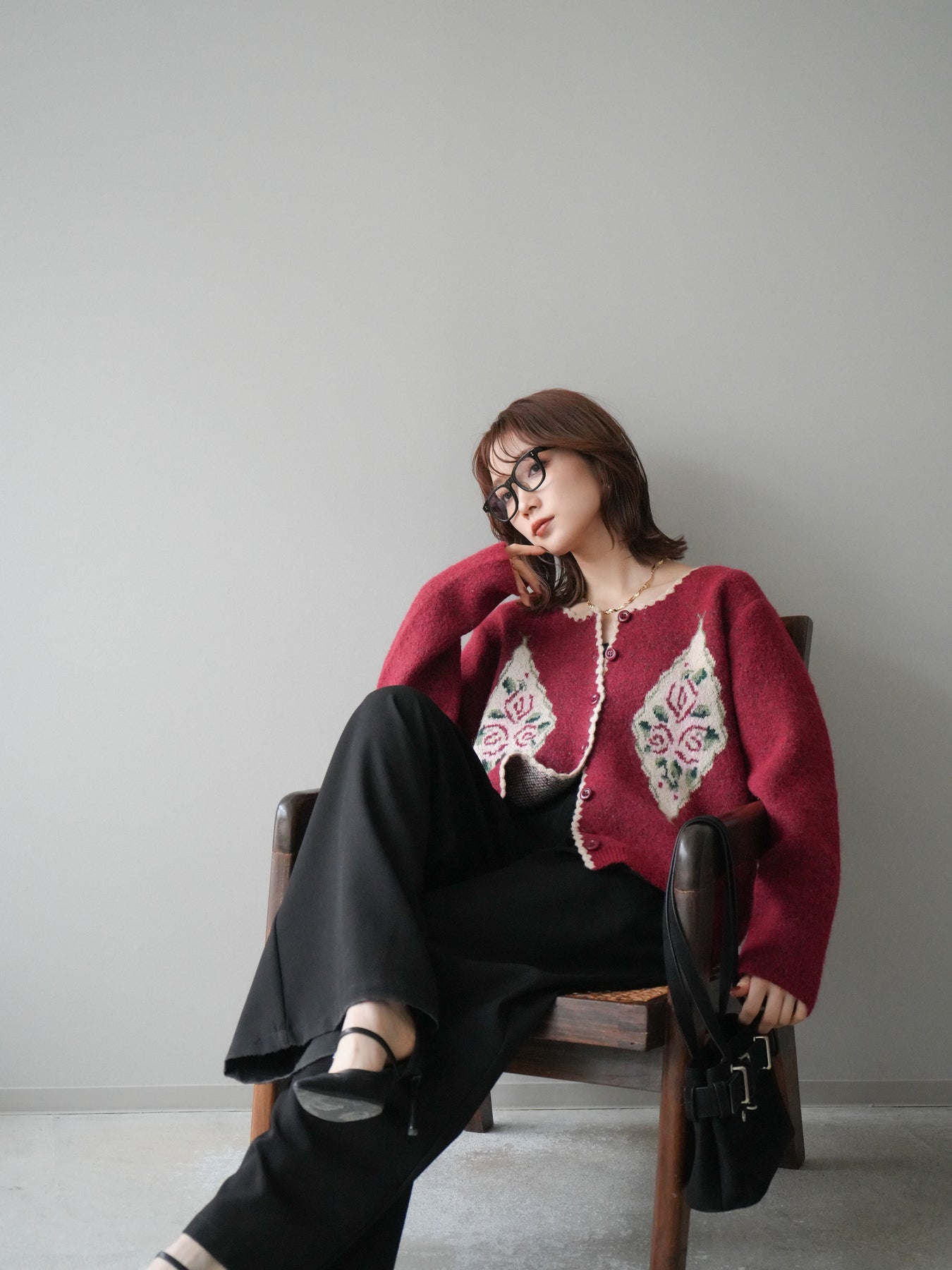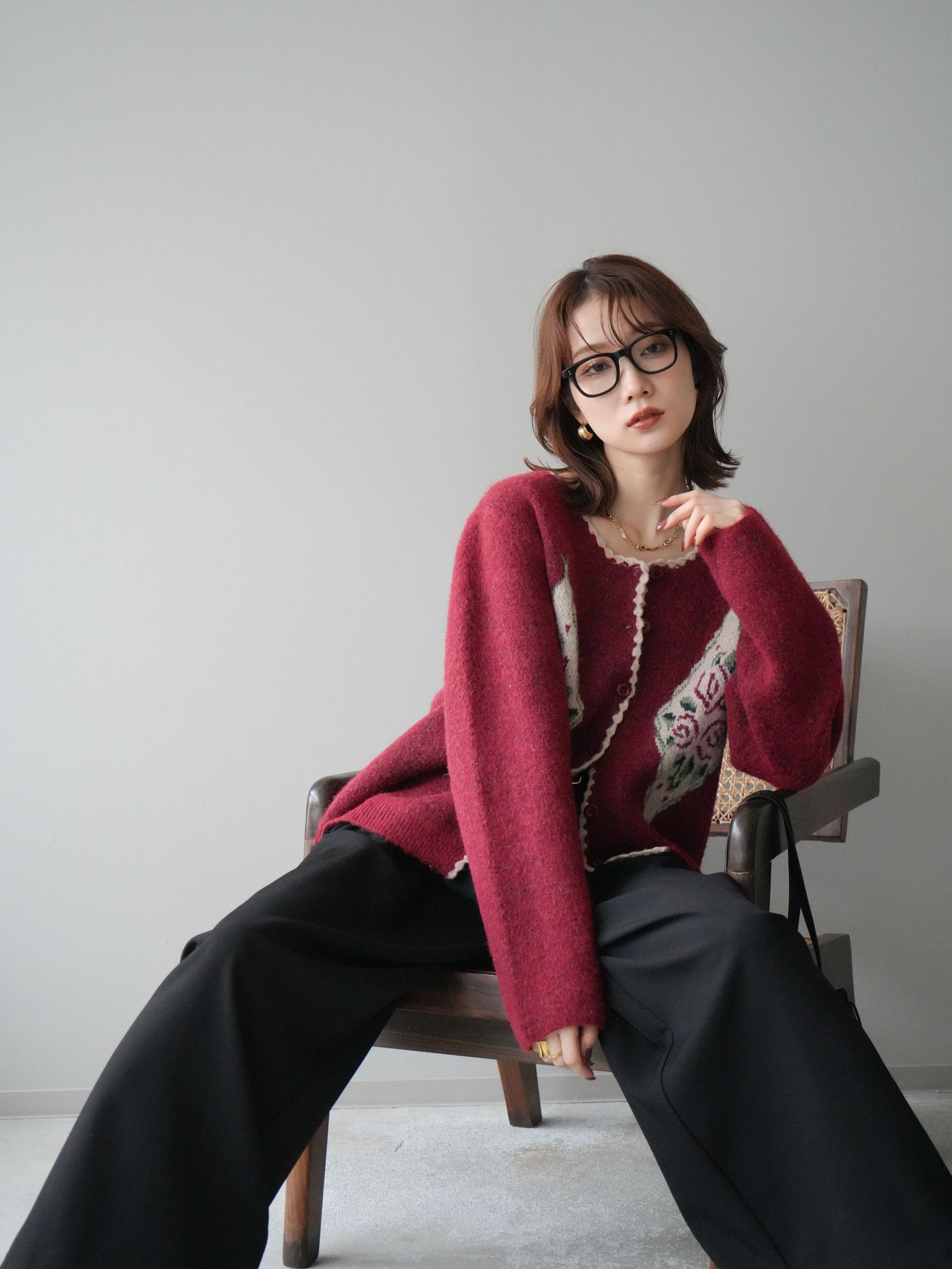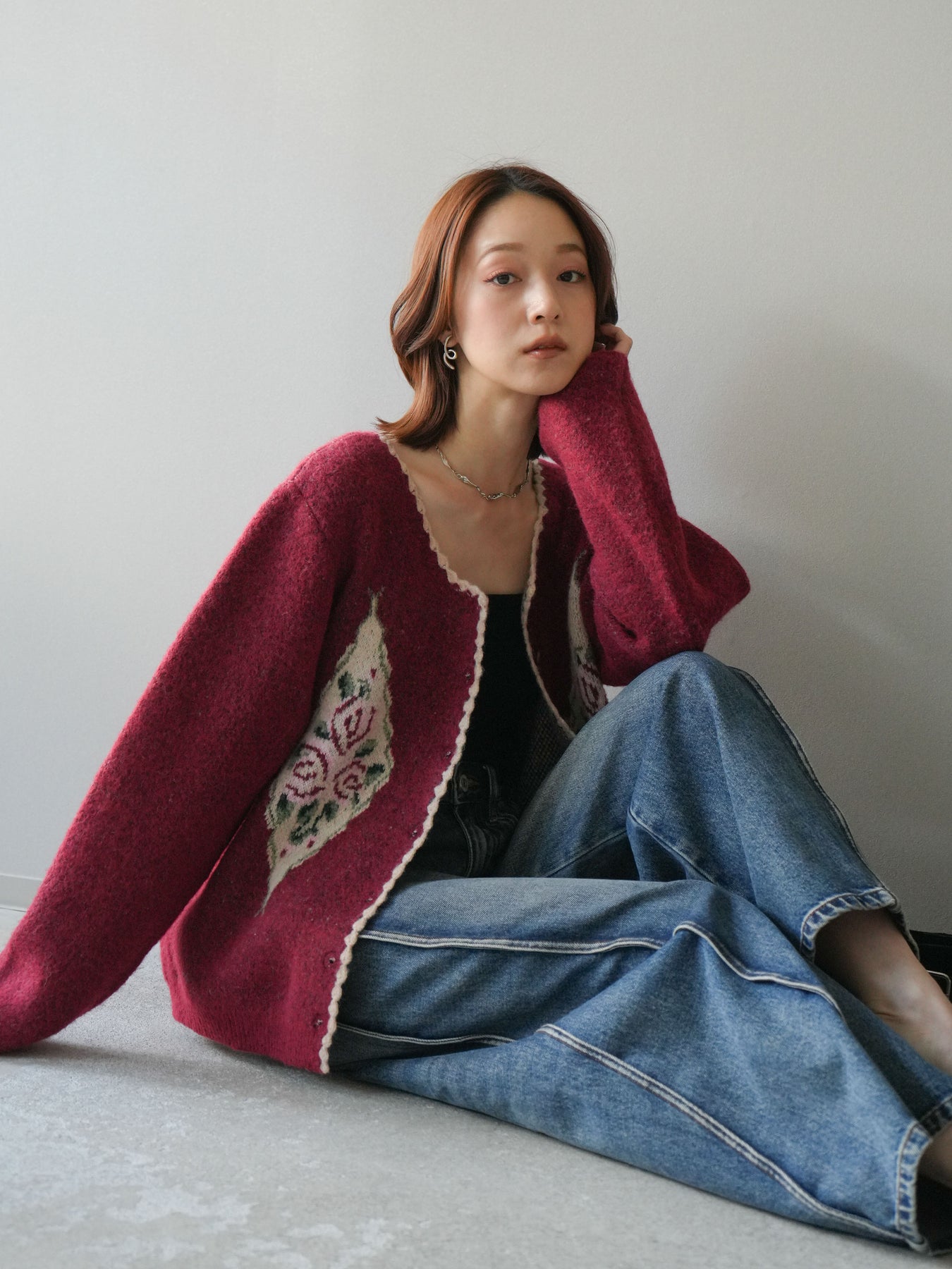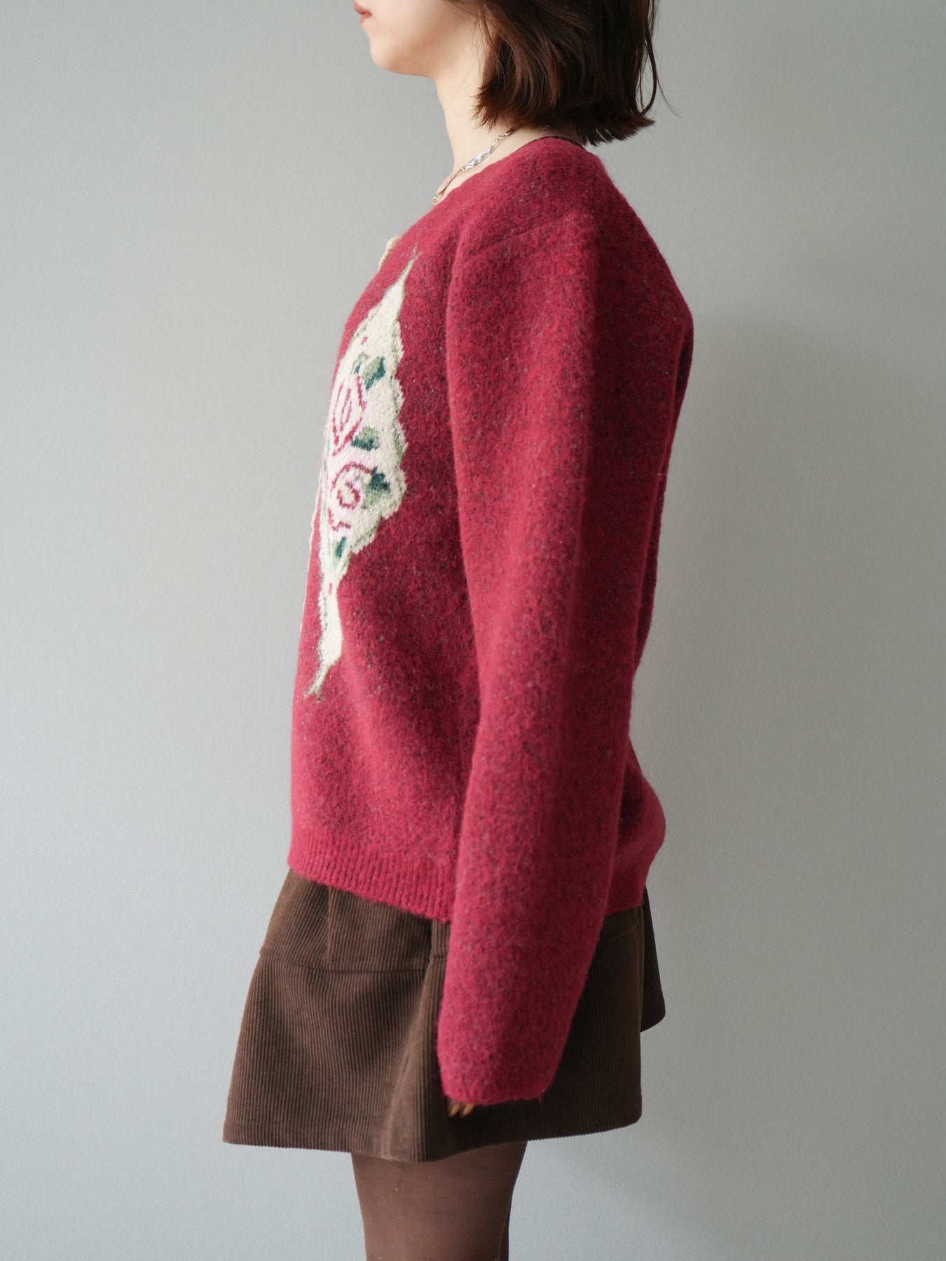 [予約]アンティークフラワージャガードニットカーディガン/red