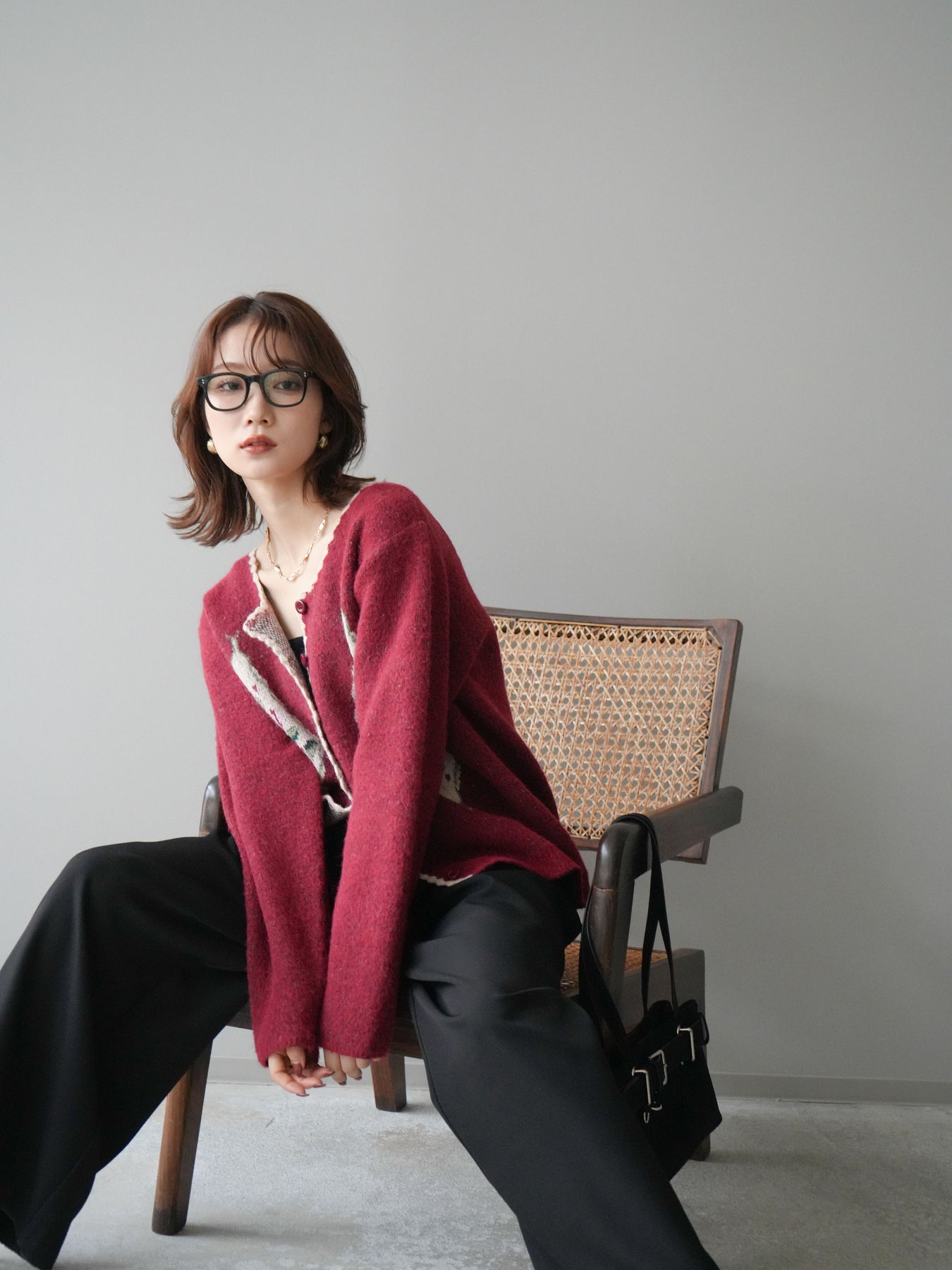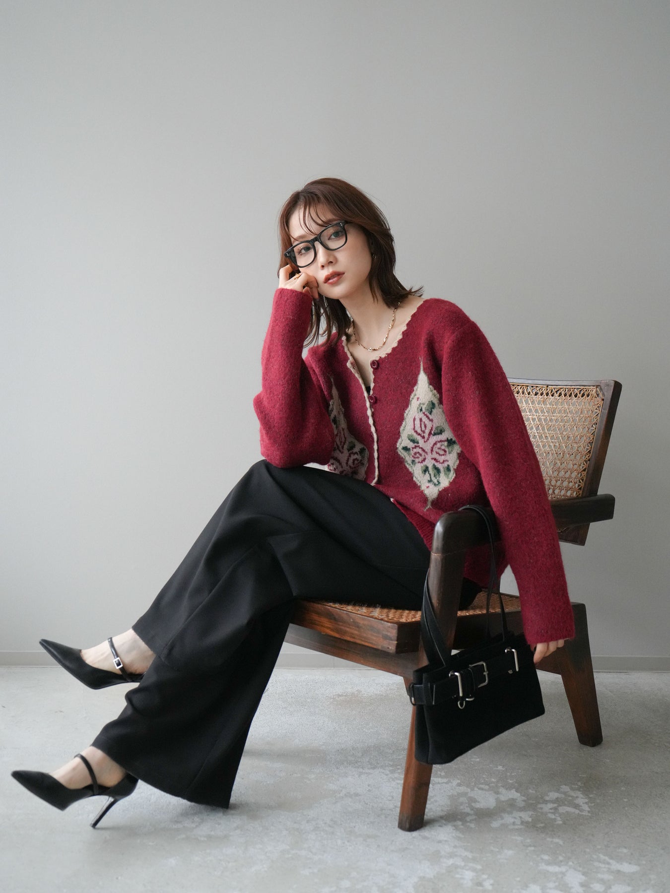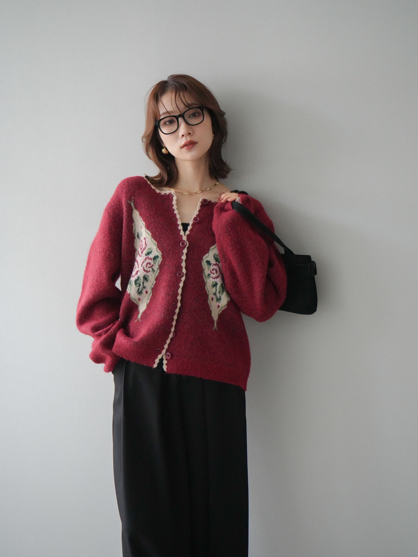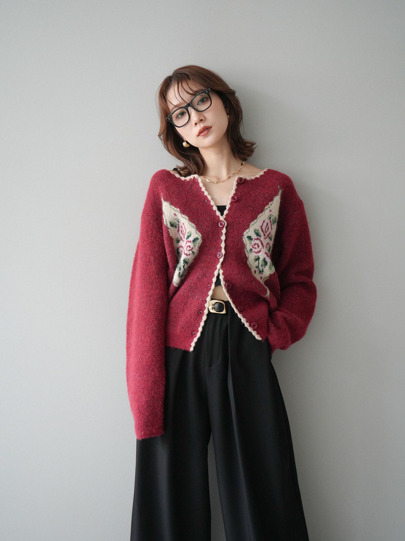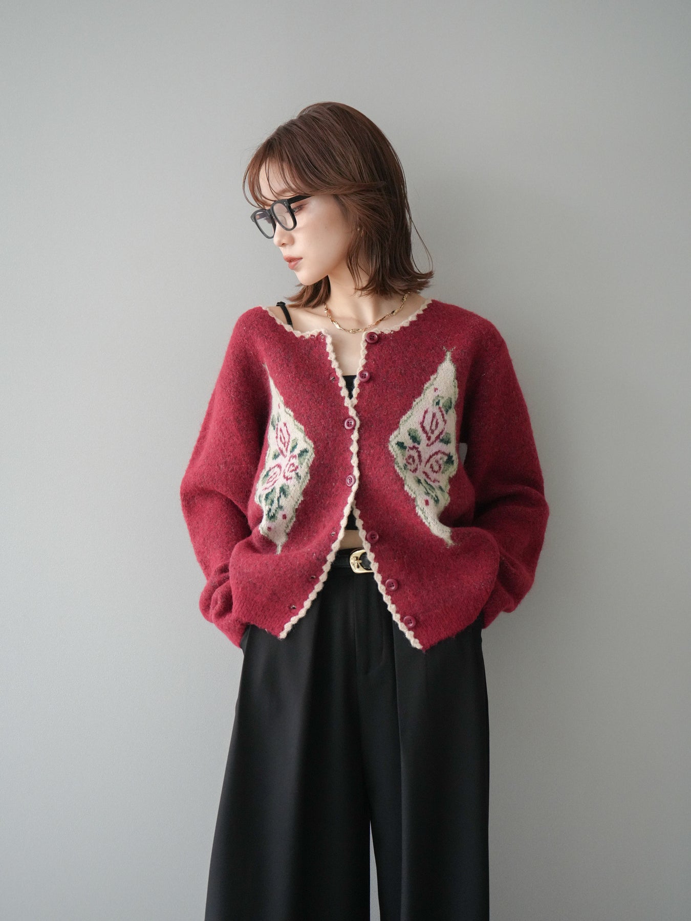 [予約]アンティークフラワージャガードニットカーディガン/red
