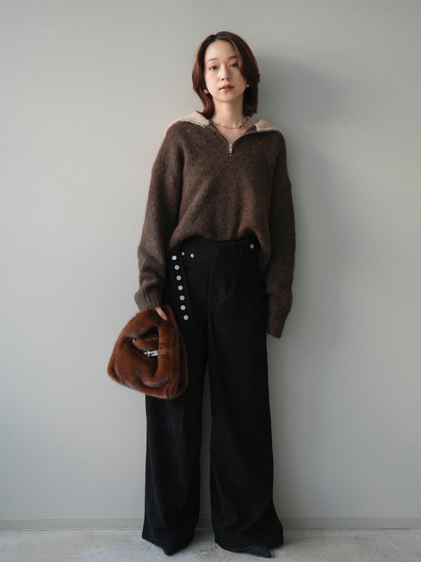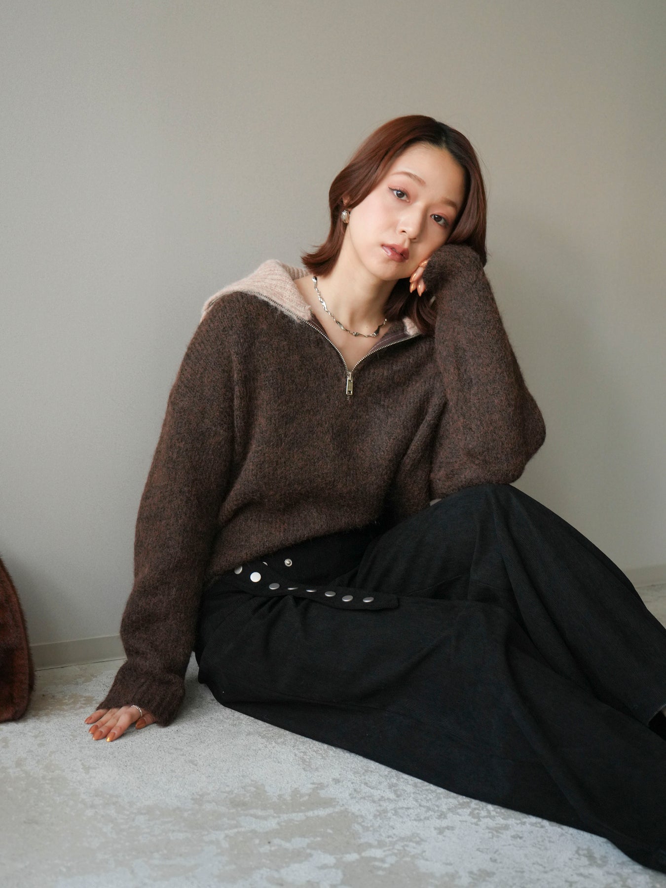 ふんわりとした風合いのニットに、バイカラーの襟元デザインが映えるジッププルオーバー。 ジップの開け閉めで首元の印象を変えられ、抜け感のある着こなしも楽しめます。 柔らかく肌触りの良い素材で、軽やかな着心地ながら暖かさも兼ね備えた一枚。 カジュアルにもきれいめにもマッチし、デニムやスカートなど幅広いアイテムと相性抜群です。 程よいボリュームシルエットがシーズンムードを高める、主役級のニットプルオーバーです。 ※ボトムス、キャミソール(インナー)以外の商品は一律でインナーは付属していません。