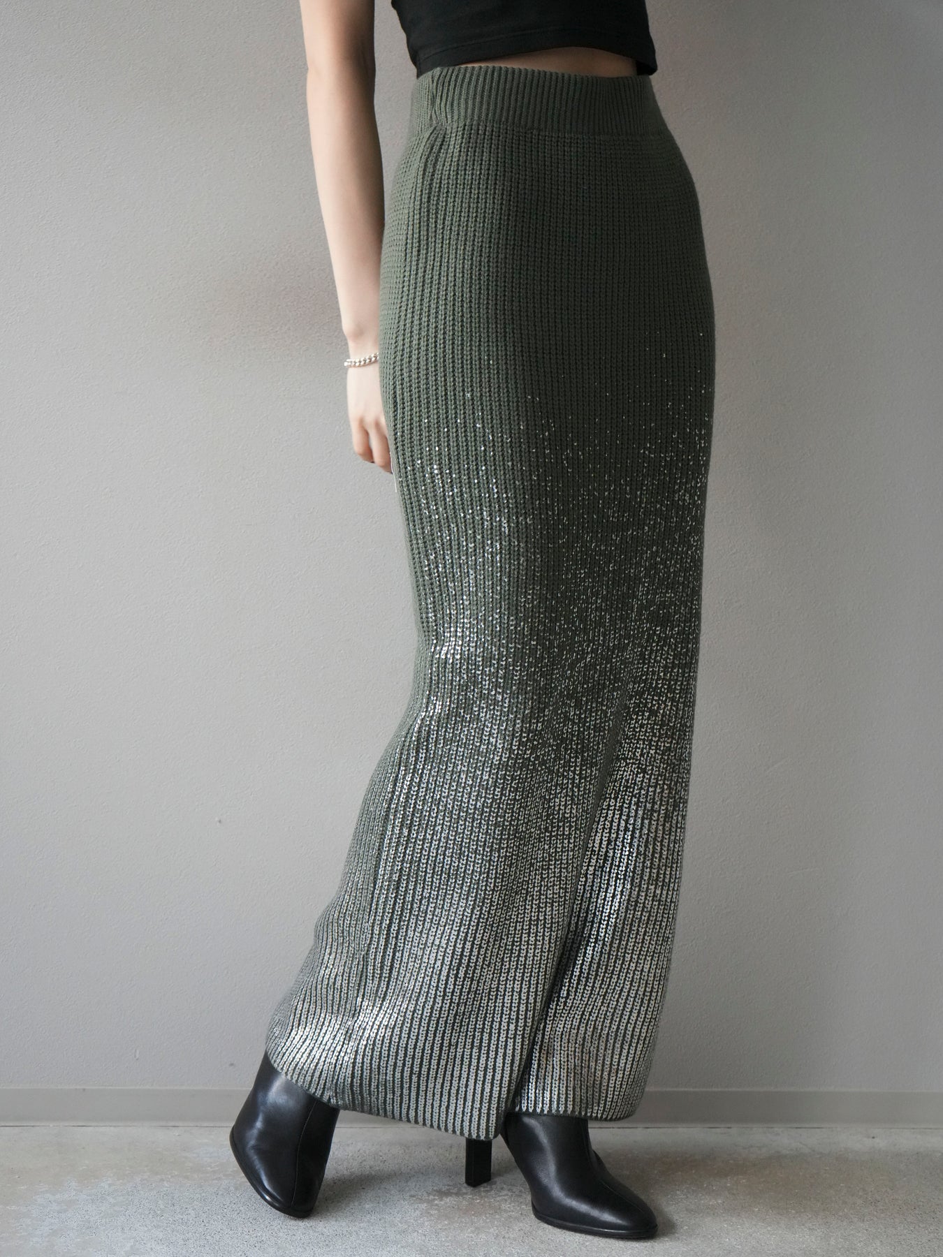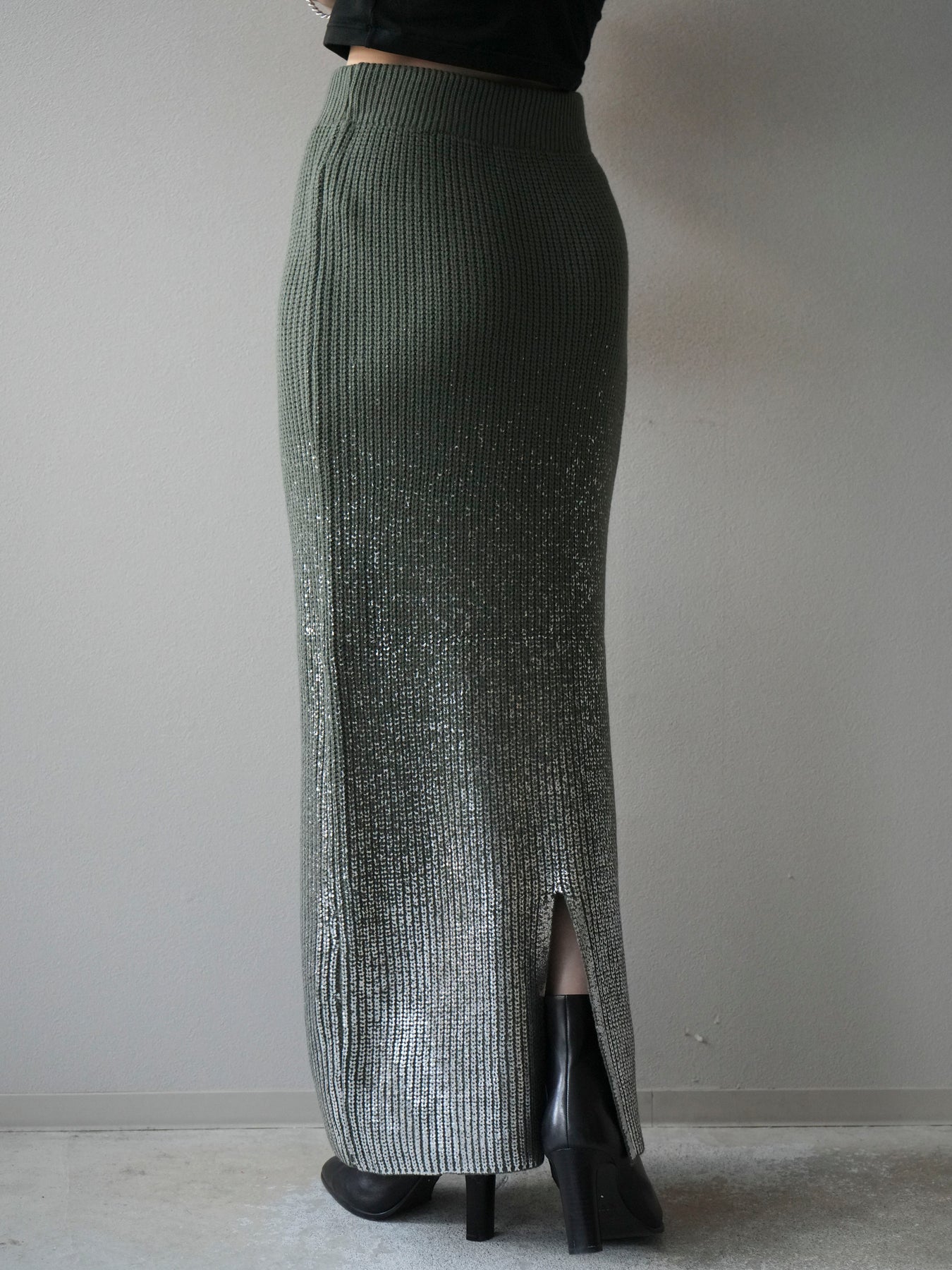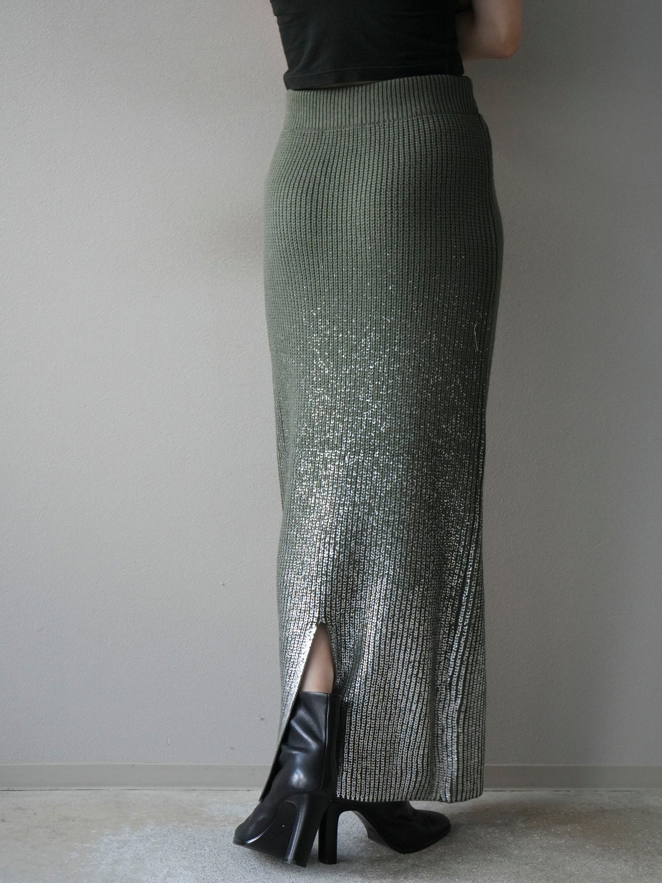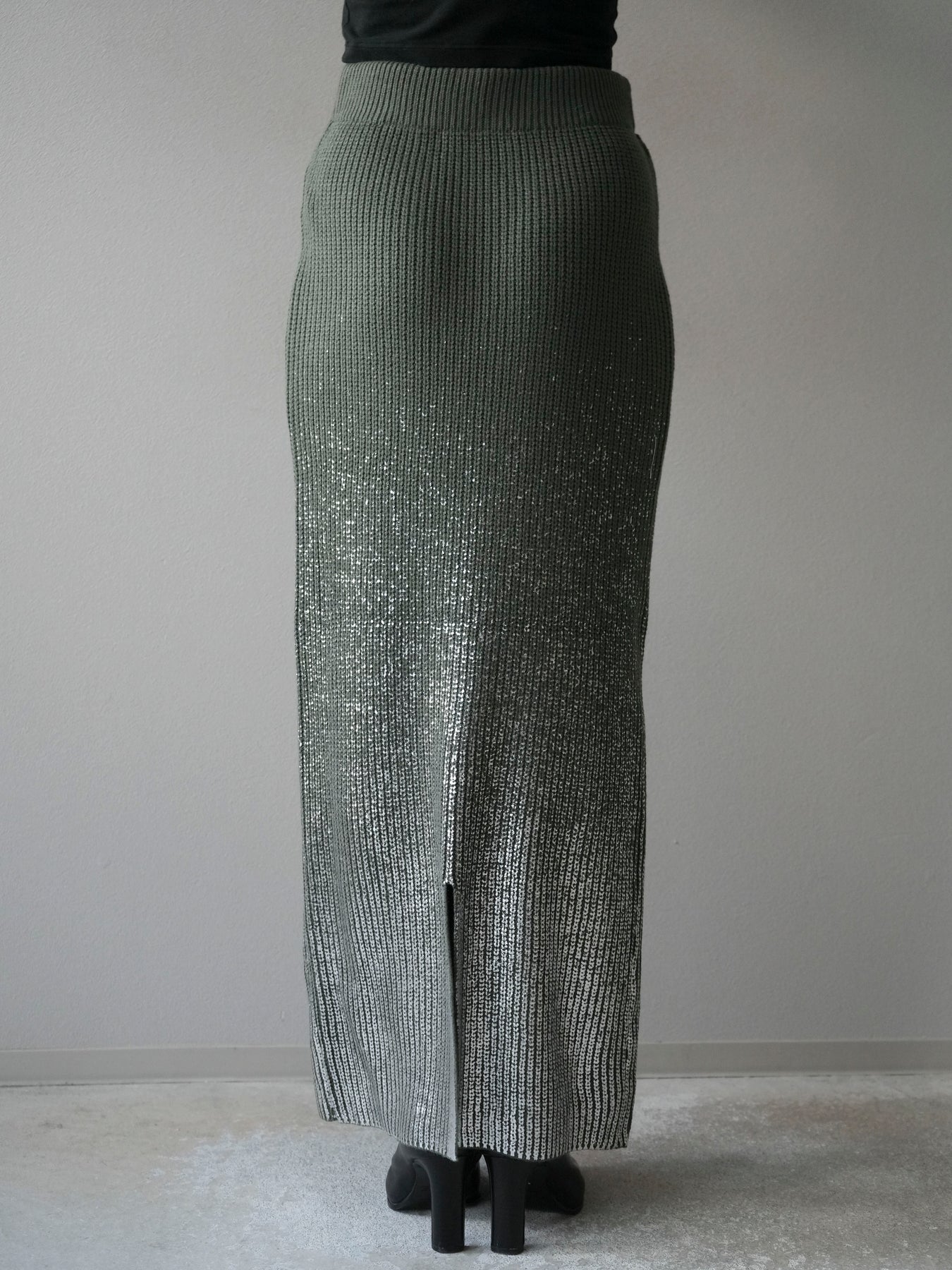 繊細な箔プリントが目を惹く、華やかさとモード感を兼ね備えたニットタイトスカート。 歩くたびにきらめく箔の光沢が女性らしさを引き立て、シンプルなトップスを合わせるだけで洗練された印象に仕上がります。 伸縮性のあるニット素材で穿き心地が良く、体のラインをきれいに見せながらも締め付け感のない快適な着用感。 裾にはスリットを入れ、抜け感と動きやすさをプラスしました。 デイリーから特別なシーンまで活躍する、存在感のある主役級スカートです。