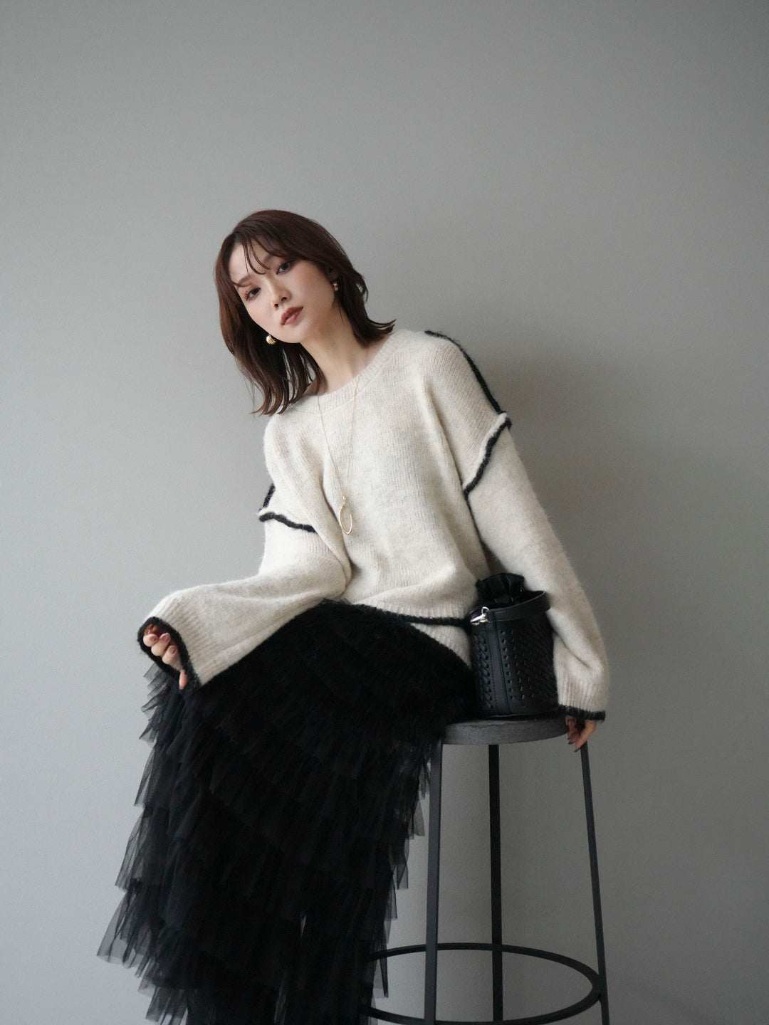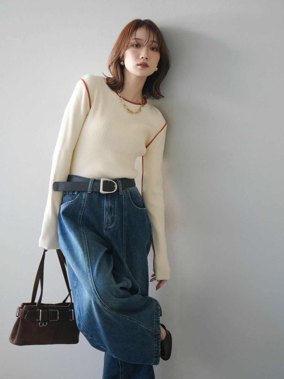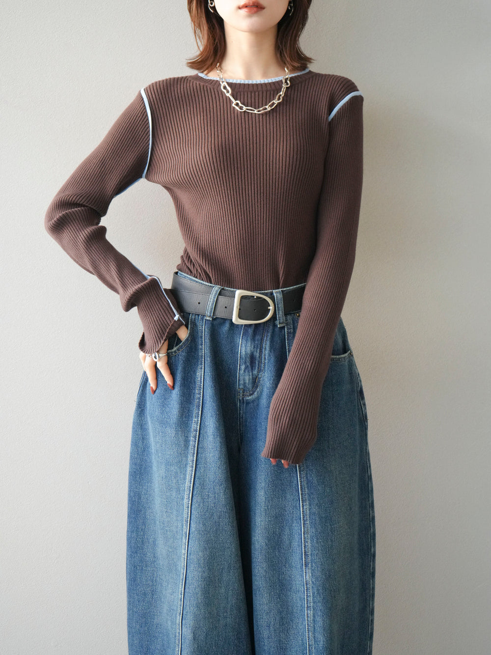 [予約]バイカラークルーネックリブニットトップス/ivory