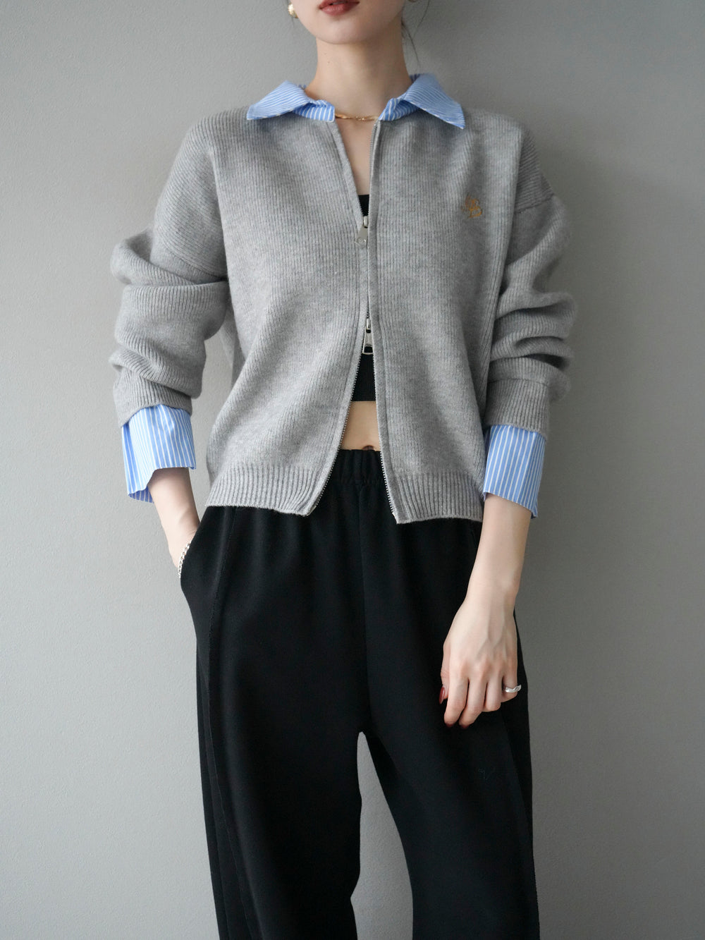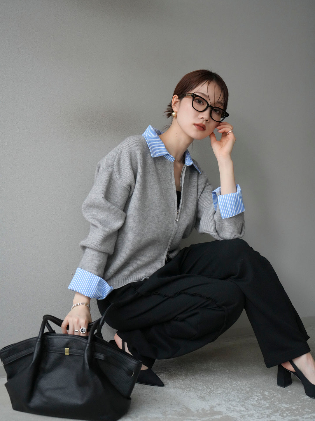 [予約]ストライプシャツレイヤードZIPニットカーディガン/gray