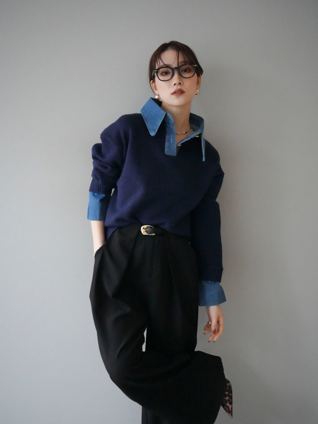 [予約]ストライプシャツレイヤードZIPニットカーディガン/navy