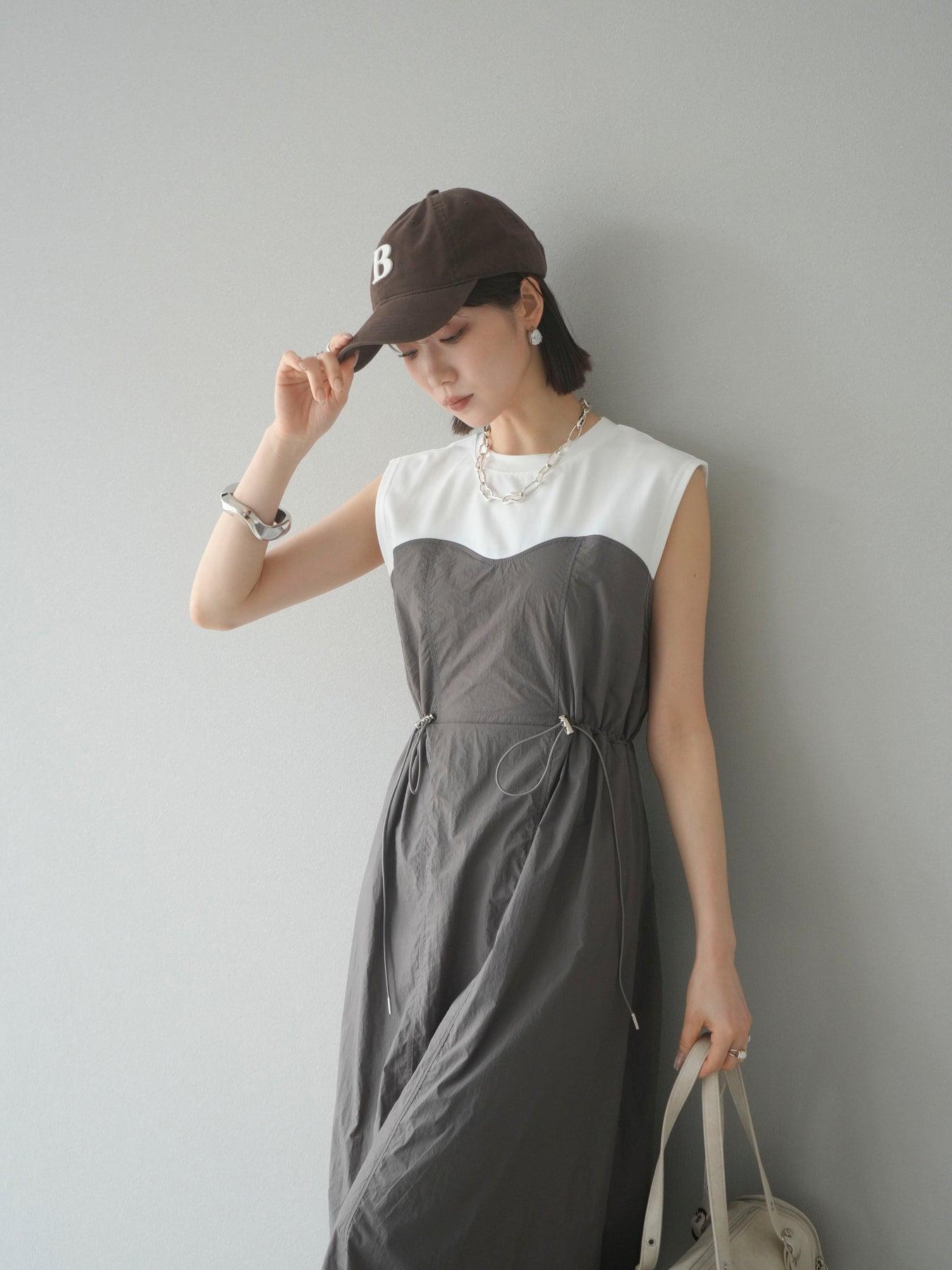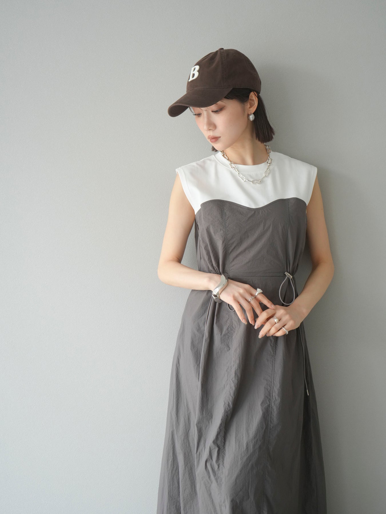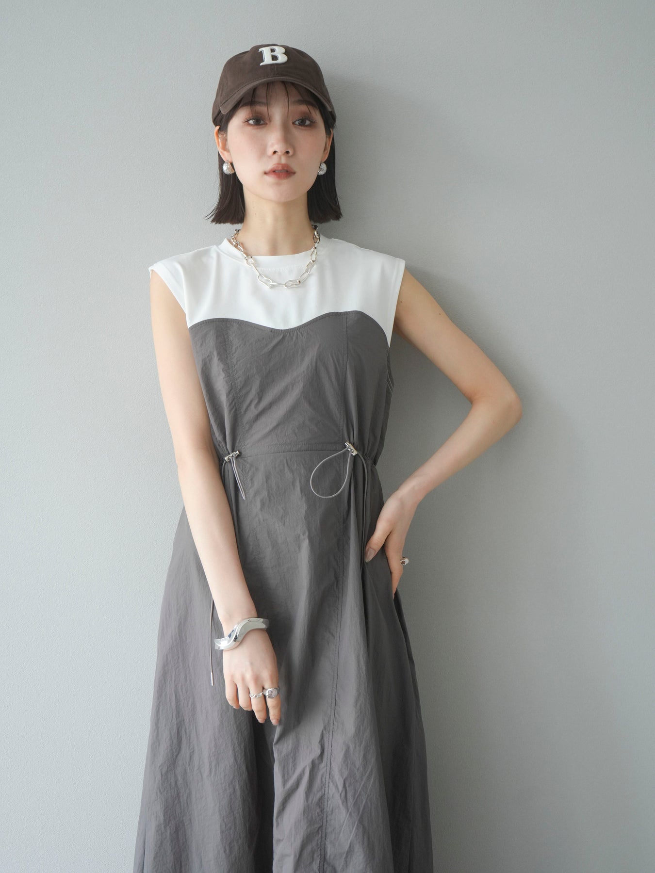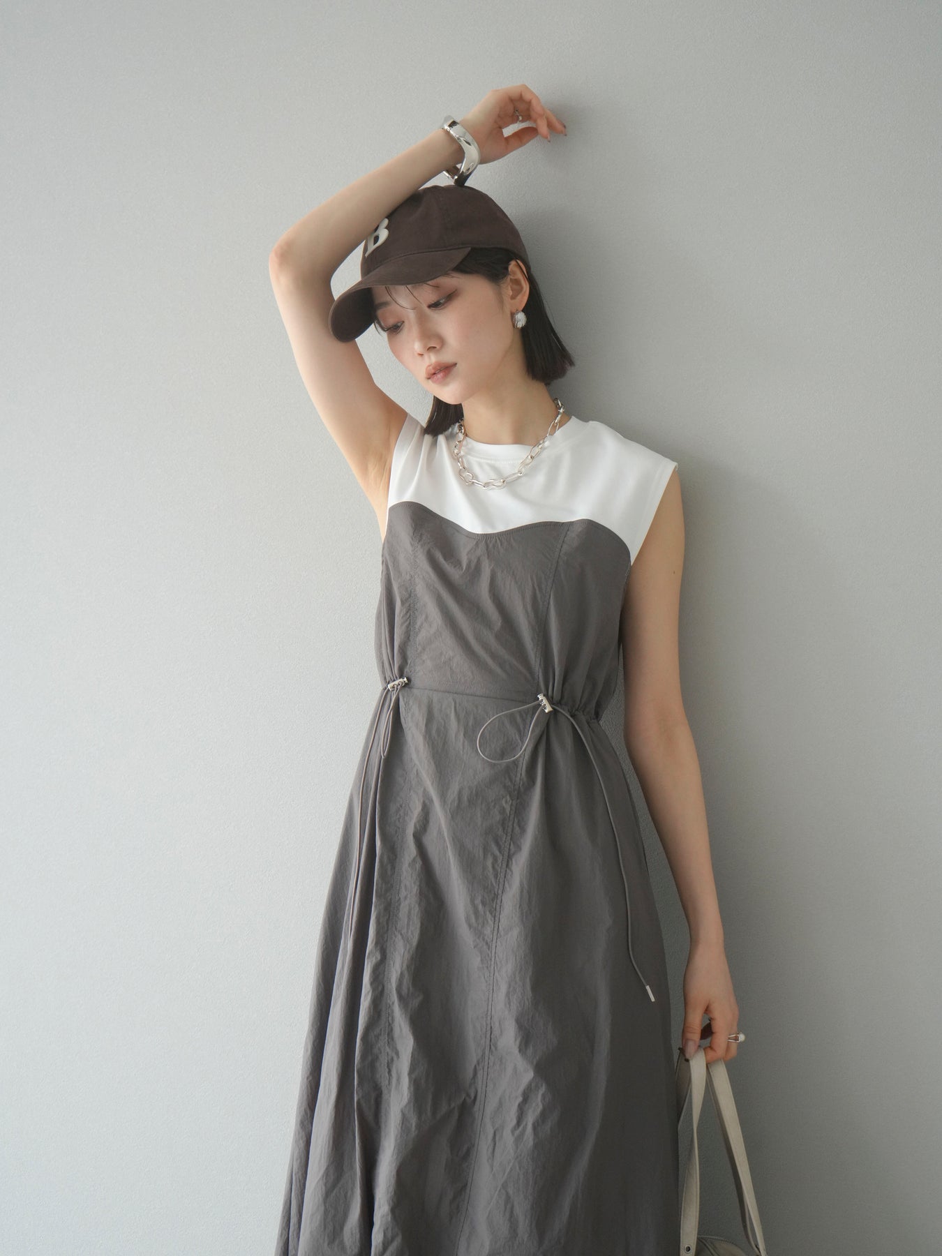 異素材の組み合わせが印象的な、カットドッキングナイロンワンピース。上身頃は肌あたりの良いカットソー素材、スカート部分はハリ感のあるナイロン素材で切り替えられており、スポーティーとフェミニンが融合したバランスの取れたデザインに仕上がっています。ウエストのドロストコードでシルエットの調整が可能で、スタイルアップ効果も◎。1枚でスタイリングが決まる、デイリーにもレジャーにも活躍する万能ワンピースです。 ※ボトムス、キャミソール(インナー)以外の商品は一律でインナーは付属していません。