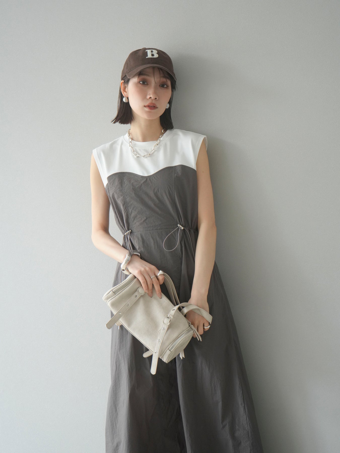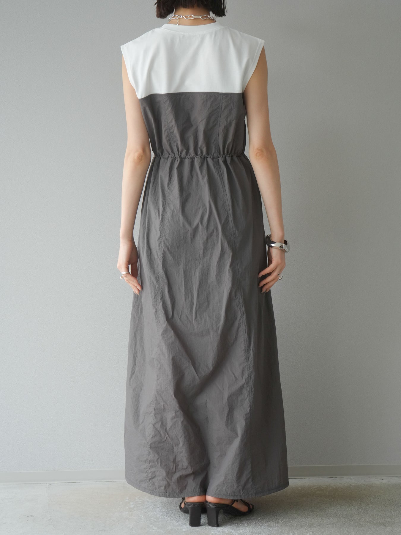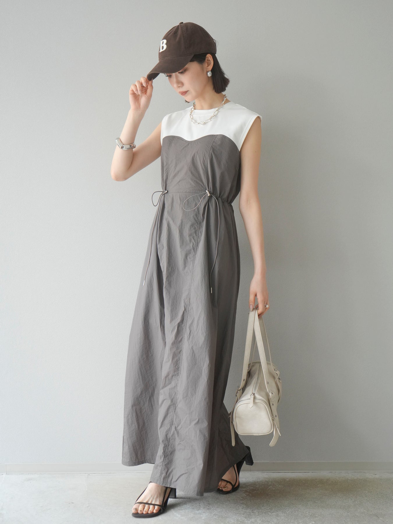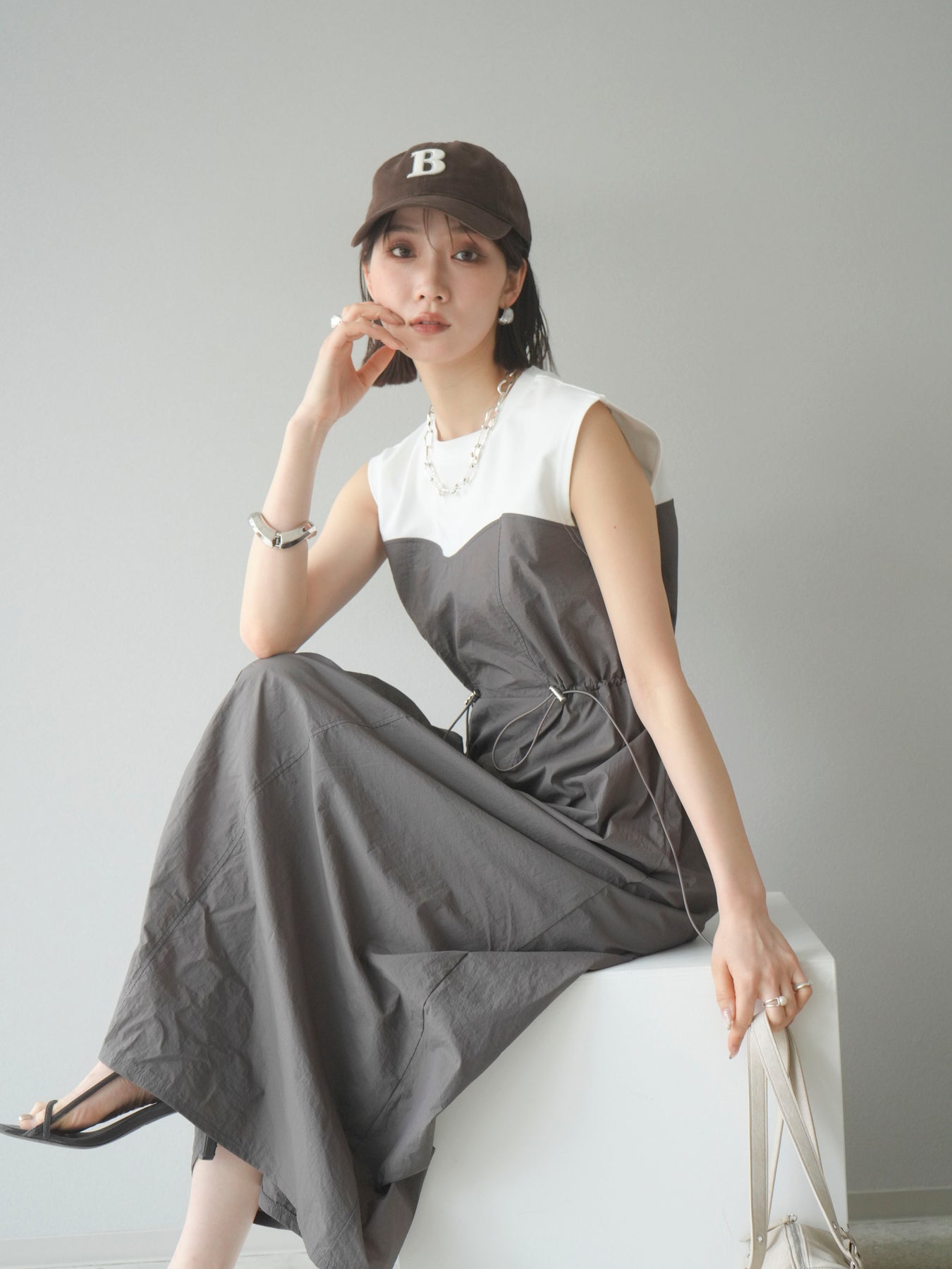 異素材の組み合わせが印象的な、カットドッキングナイロンワンピース。上身頃は肌あたりの良いカットソー素材、スカート部分はハリ感のあるナイロン素材で切り替えられており、スポーティーとフェミニンが融合したバランスの取れたデザインに仕上がっています。ウエストのドロストコードでシルエットの調整が可能で、スタイルアップ効果も◎。1枚でスタイリングが決まる、デイリーにもレジャーにも活躍する万能ワンピースです。 ※ボトムス、キャミソール(インナー)以外の商品は一律でインナーは付属していません。
