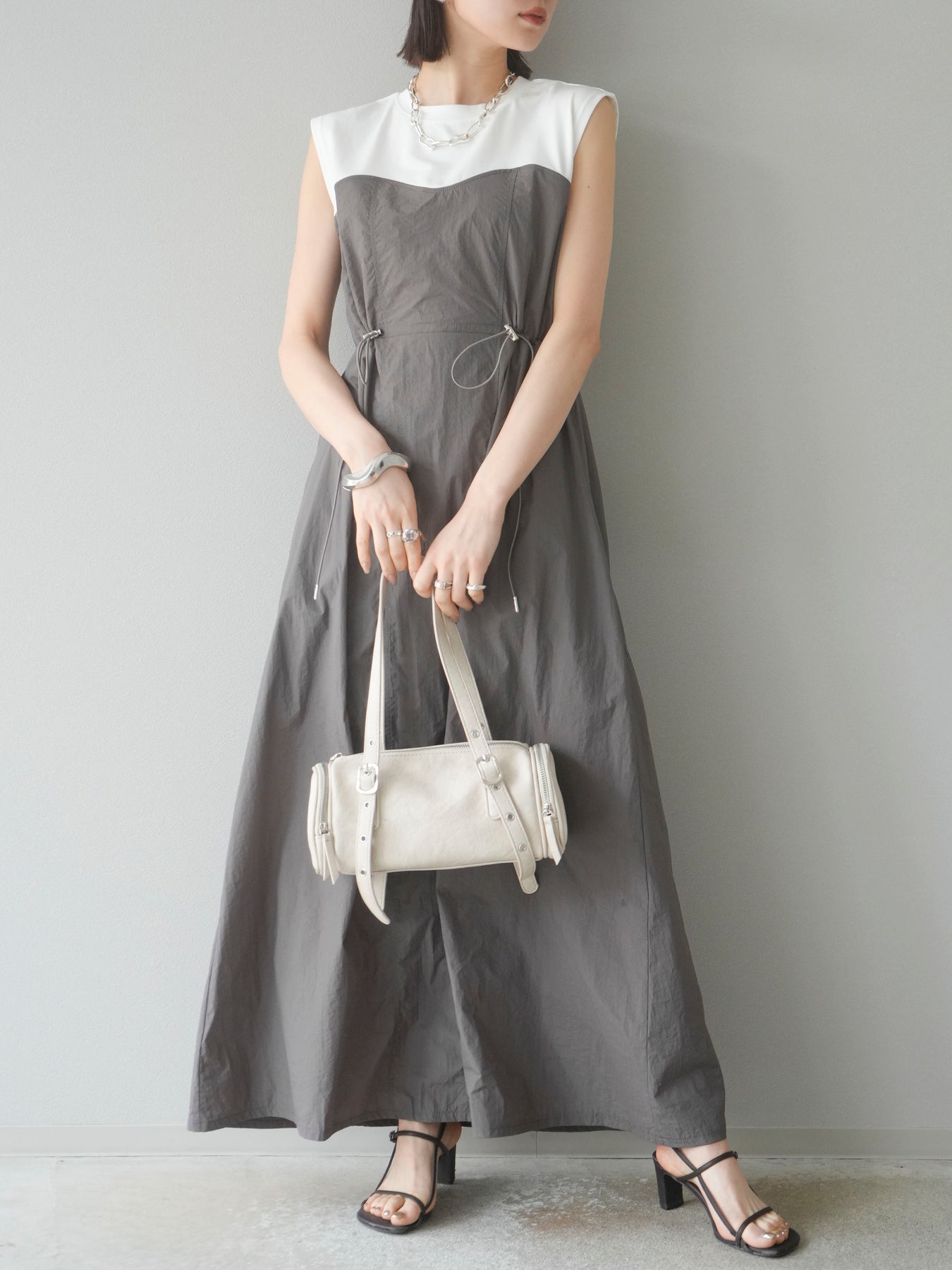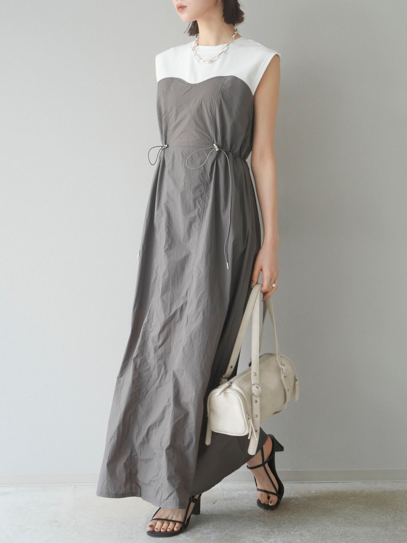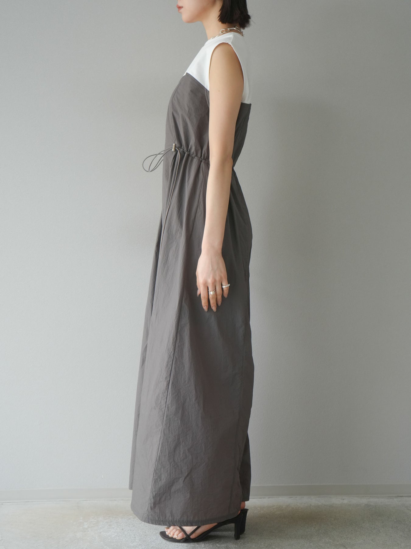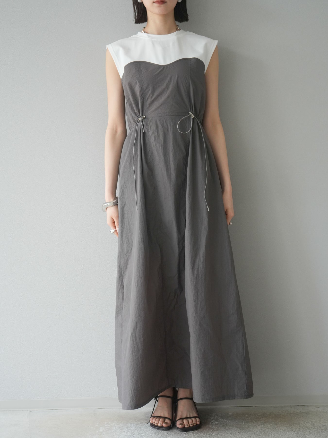 異素材の組み合わせが印象的な、カットドッキングナイロンワンピース。上身頃は肌あたりの良いカットソー素材、スカート部分はハリ感のあるナイロン素材で切り替えられており、スポーティーとフェミニンが融合したバランスの取れたデザインに仕上がっています。ウエストのドロストコードでシルエットの調整が可能で、スタイルアップ効果も◎。1枚でスタイリングが決まる、デイリーにもレジャーにも活躍する万能ワンピースです。 ※ボトムス、キャミソール(インナー)以外の商品は一律でインナーは付属していません。