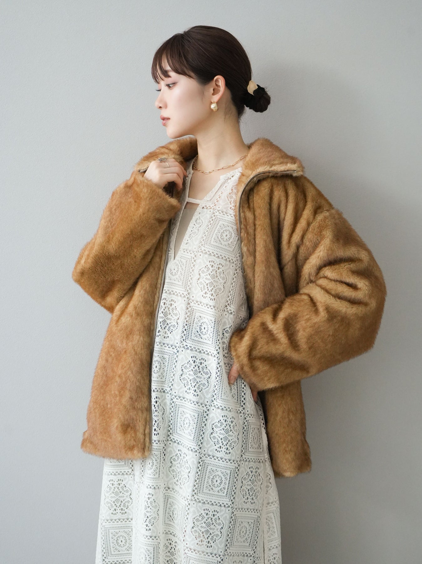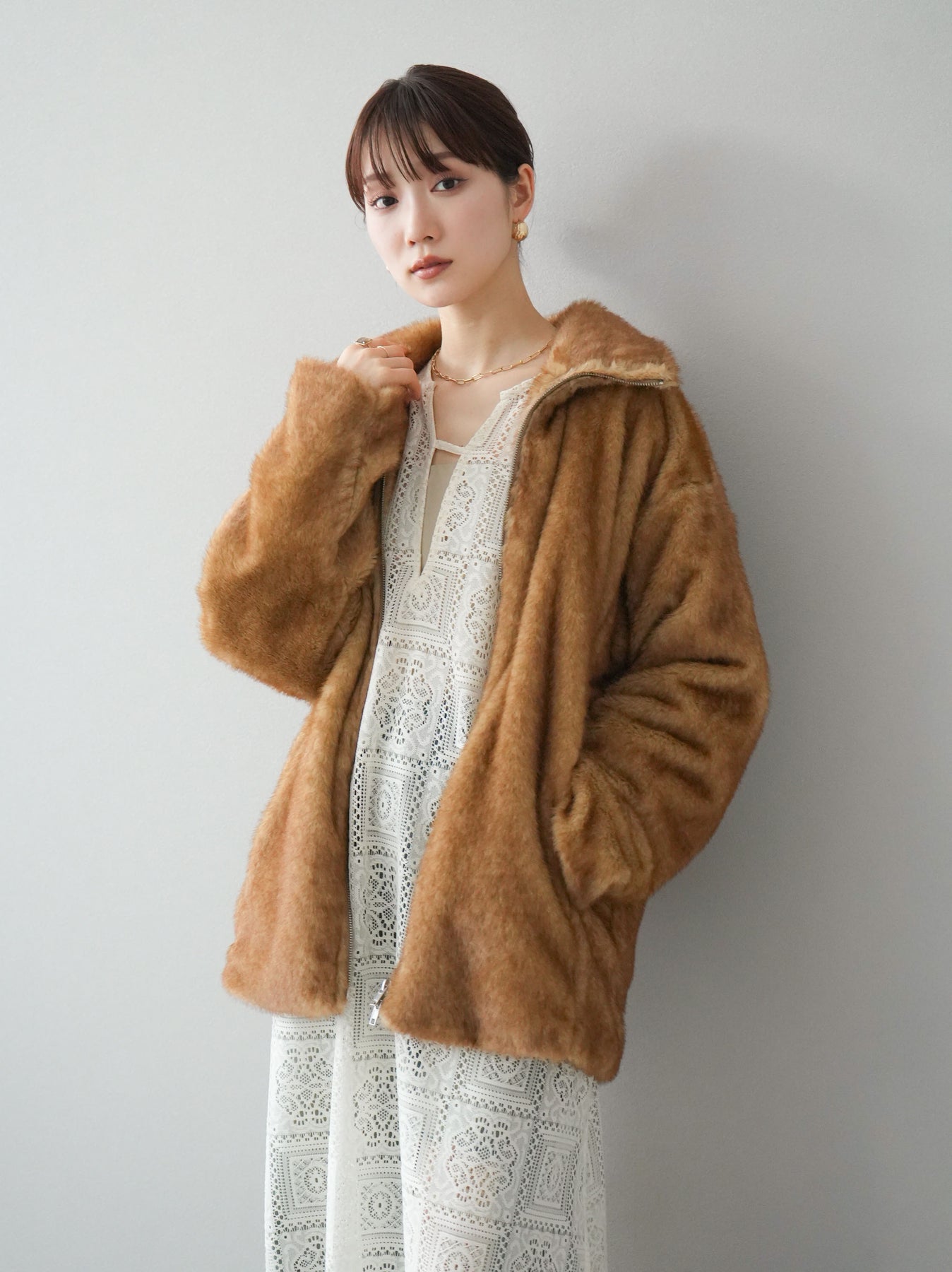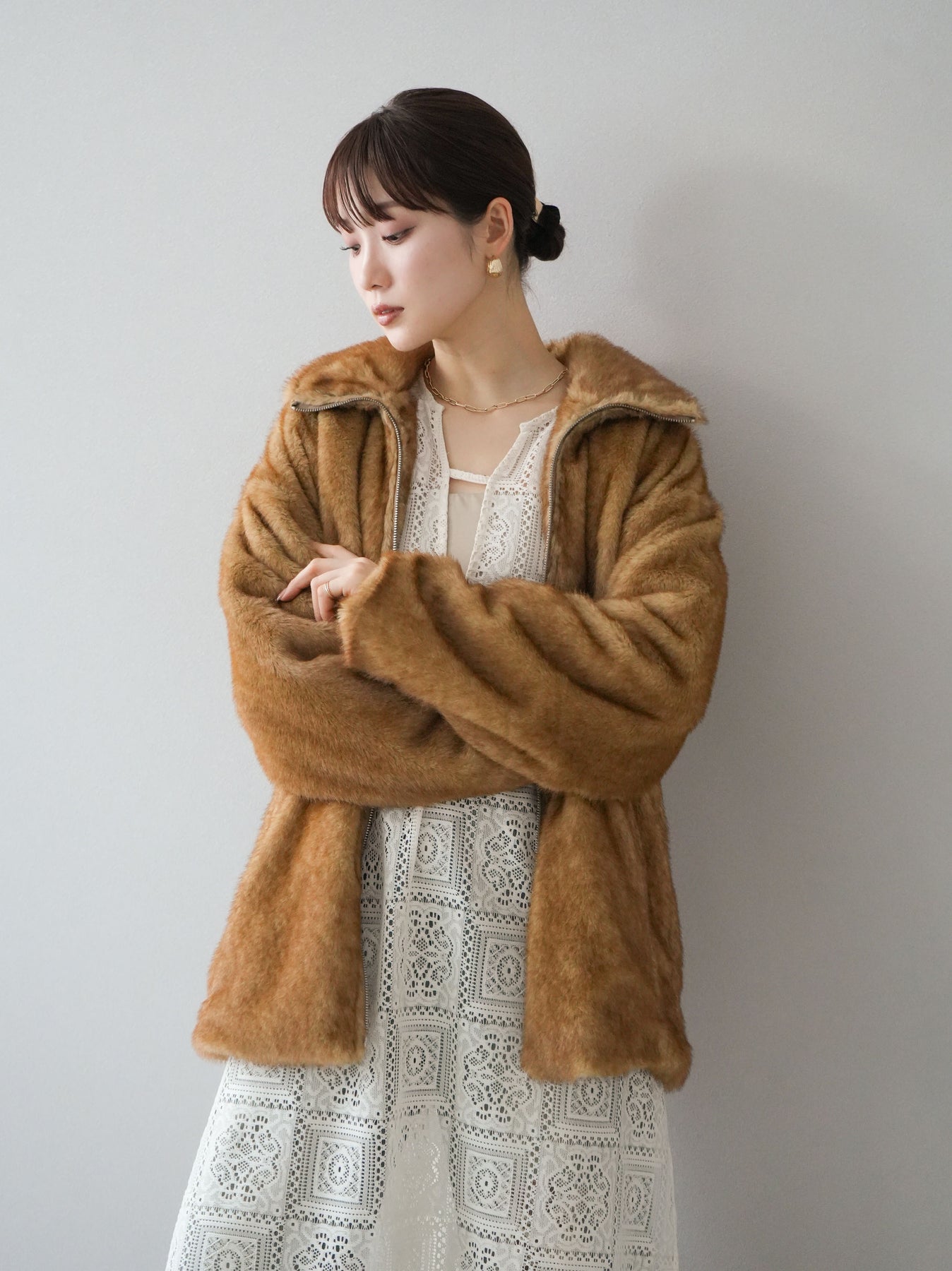 トレンド感溢れるふんわりとしたファー素材が魅力のミドル丈ジップジャケット。ボリュームのあるスタンドカラーが首元を暖かく包み込み、スタイリッシュな印象に。ゆったりとしたシルエットで動きやすく、カジュアルからエレガントまで幅広いコーディネートにマッチします。ファスナー仕様で着脱も簡単。冬のスタイルに洗練されたアクセントを加える一着です。 ※ボトムス、キャミソール(インナー)以外の商品は一律でインナーは付属していません。