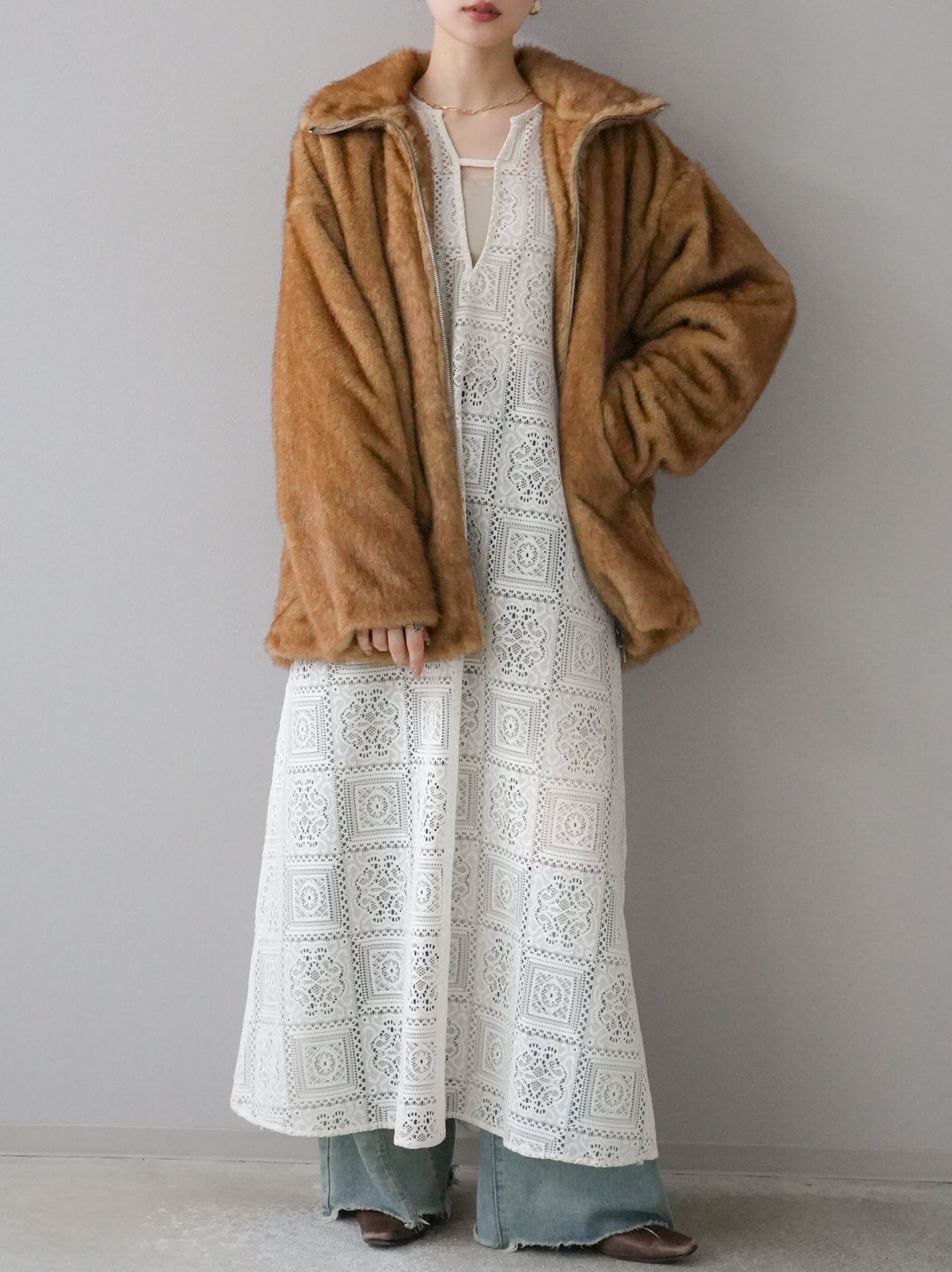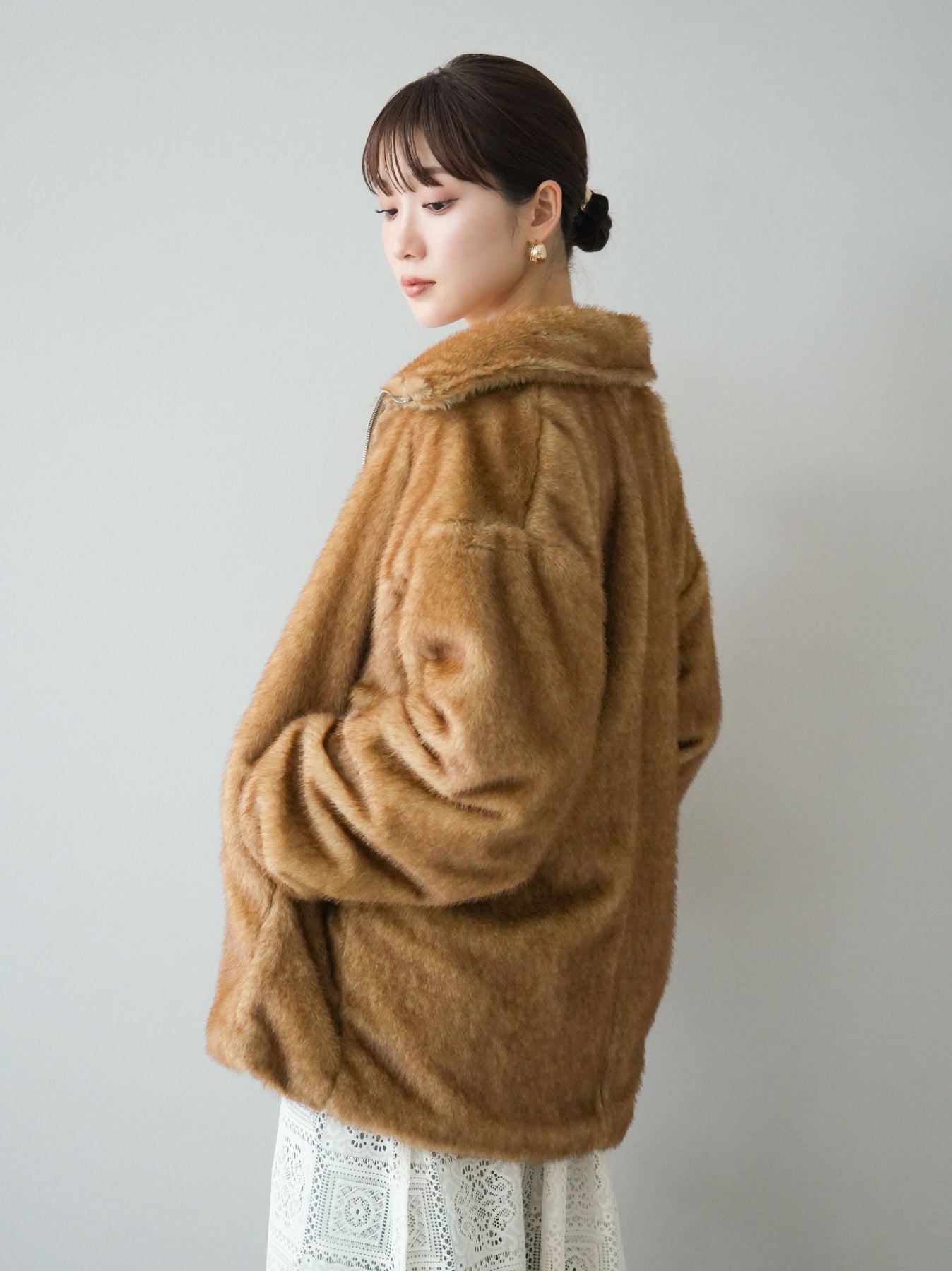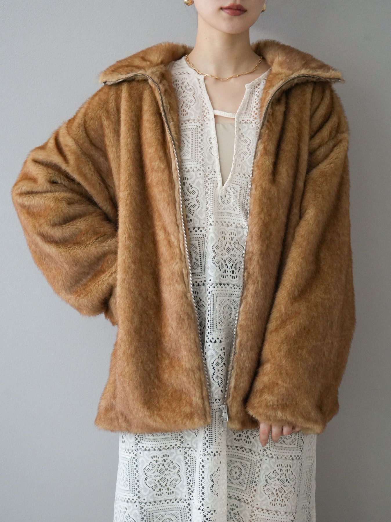 トレンド感溢れるふんわりとしたファー素材が魅力のミドル丈ジップジャケット。ボリュームのあるスタンドカラーが首元を暖かく包み込み、スタイリッシュな印象に。ゆったりとしたシルエットで動きやすく、カジュアルからエレガントまで幅広いコーディネートにマッチします。ファスナー仕様で着脱も簡単。冬のスタイルに洗練されたアクセントを加える一着です。 ※ボトムス、キャミソール(インナー)以外の商品は一律でインナーは付属していません。