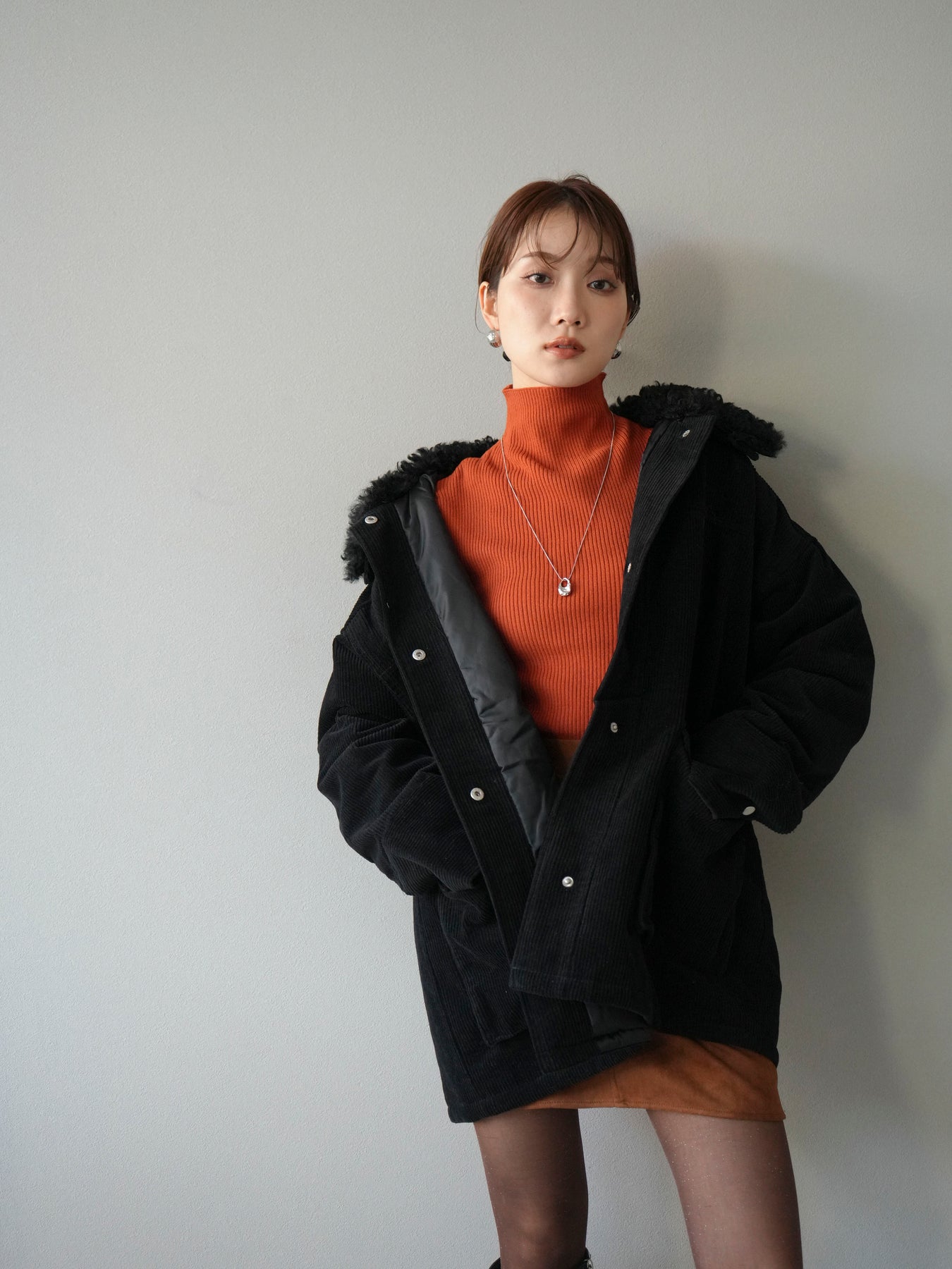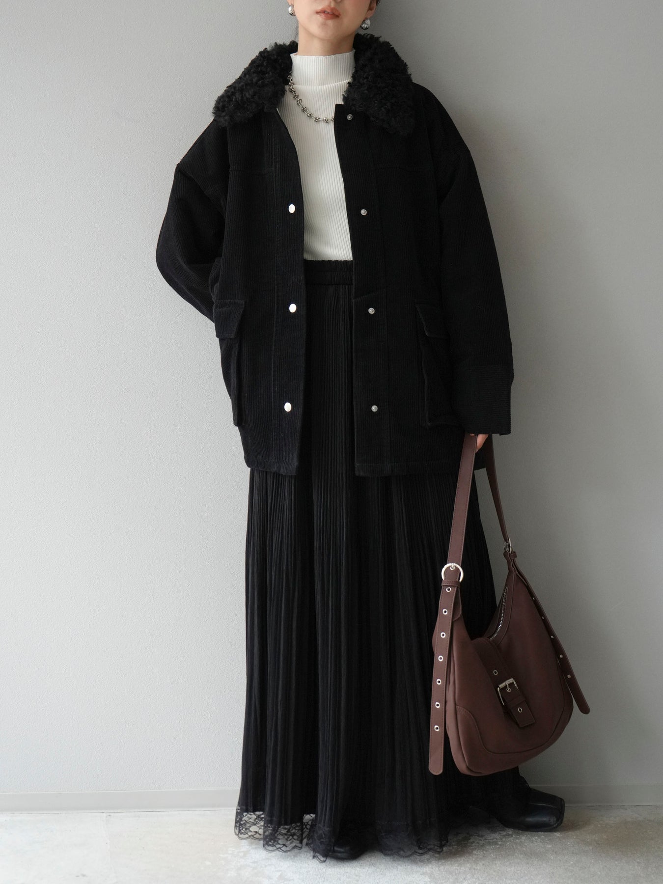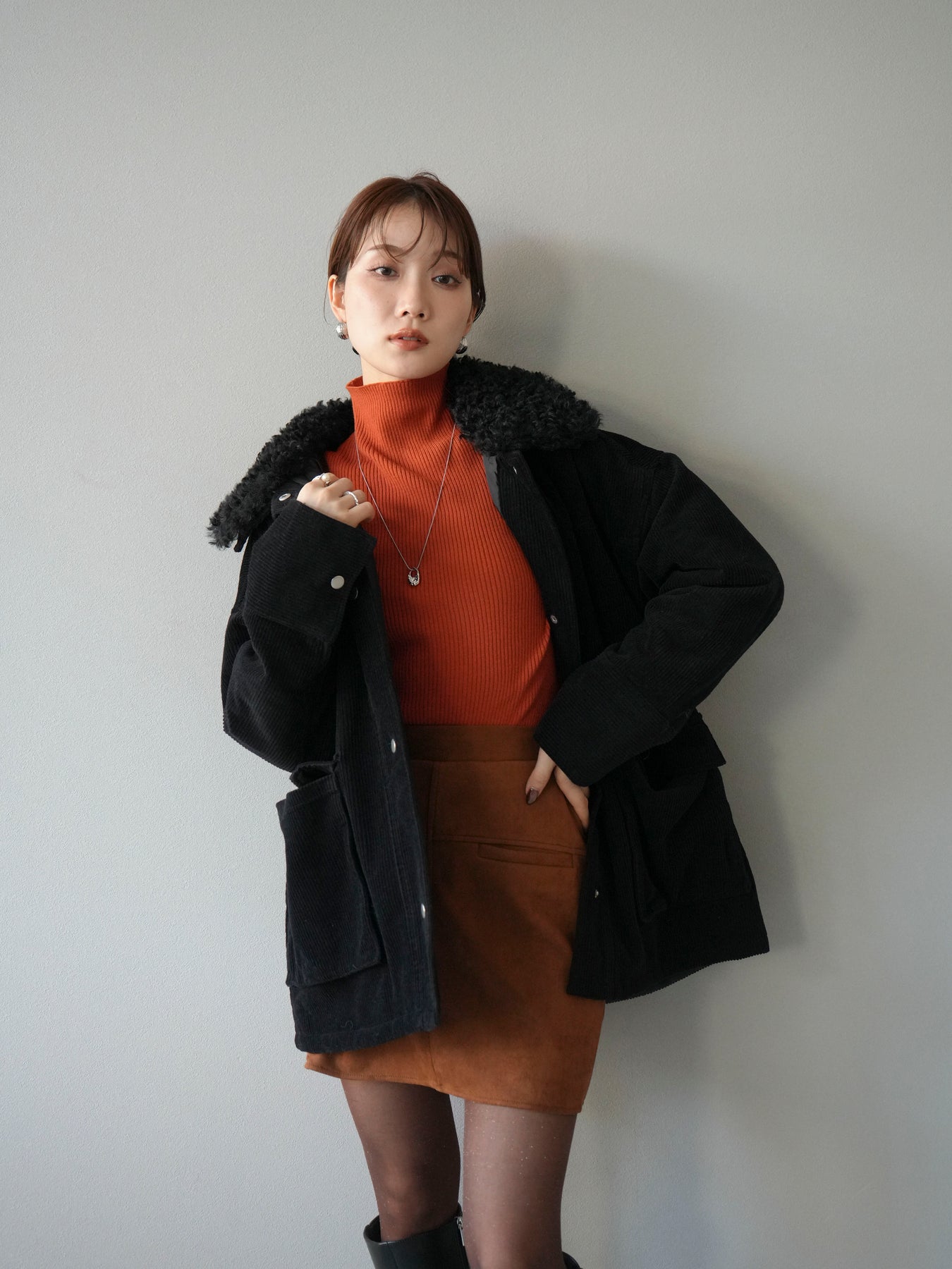 マットな質感のフェイクレザーにコーデュロイ襟を組み合わせたステンカラージャケット。異素材のコントラストがクラシカルな雰囲気を引き立てつつ、シンプルなシルエットでデイリーに取り入れやすい一着です。ヒップまで隠れるミドル丈で防寒性もあり、パンツにもスカートにも好相性。羽織るだけでスタイリングが引き締まり、モード感と大人の余裕を漂わせてくれます。秋冬のアウターとしてワードローブに加えたい万能アイテムです。 ※ボトムス、キャミソール(インナー)以外の商品は一律でインナーは付属していません。