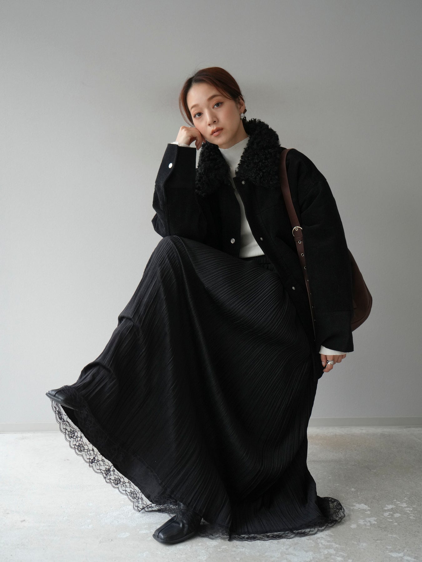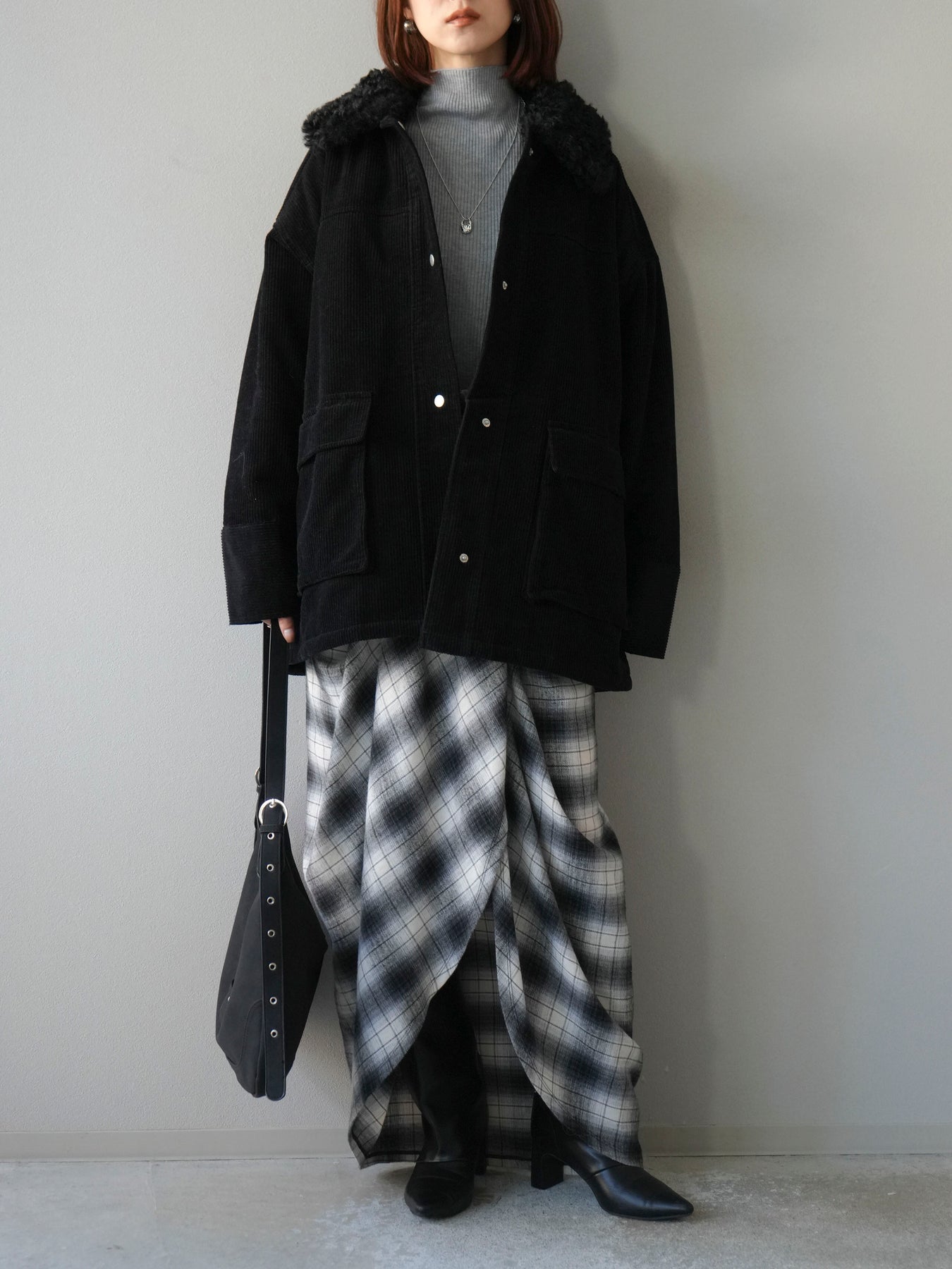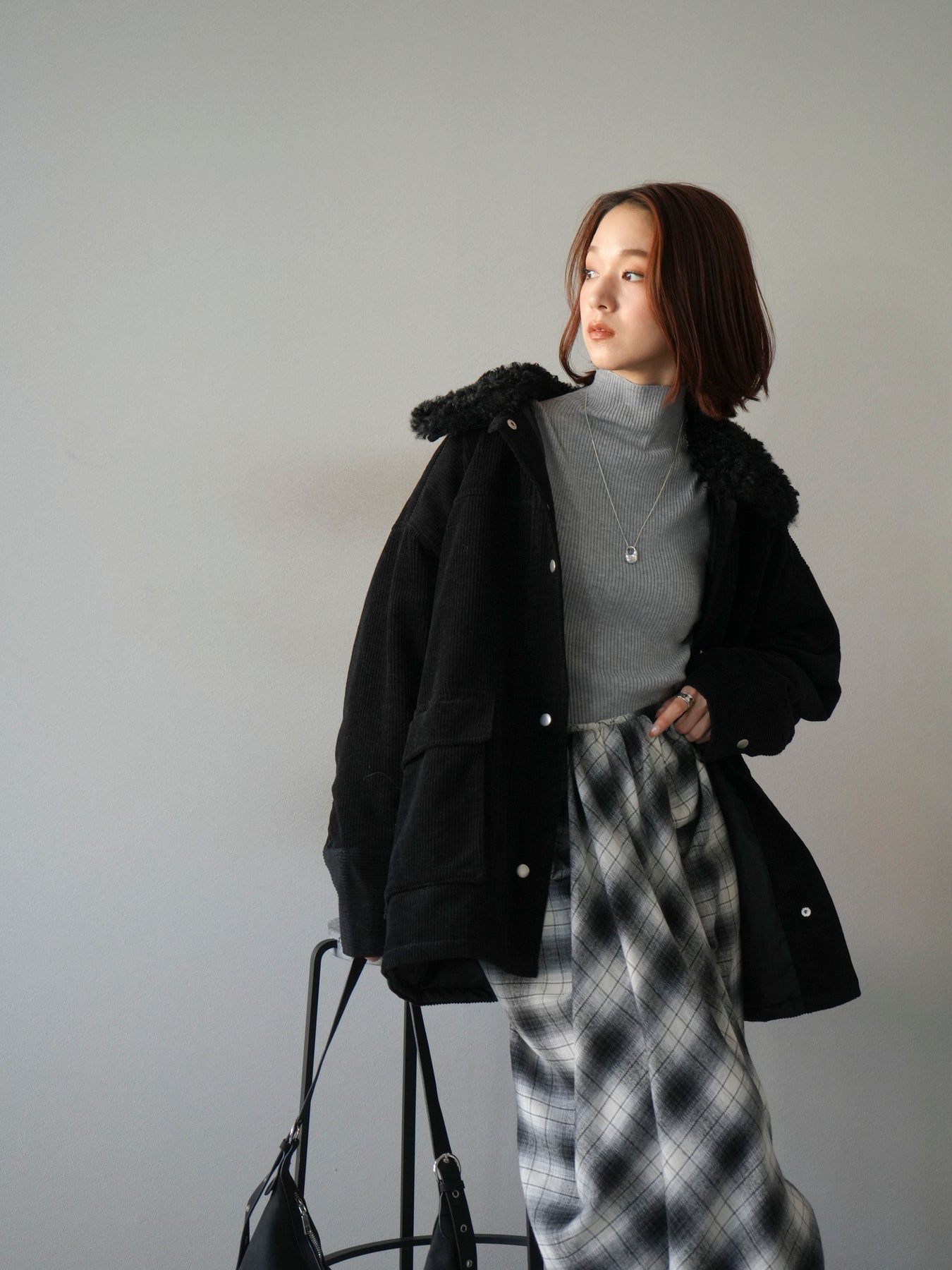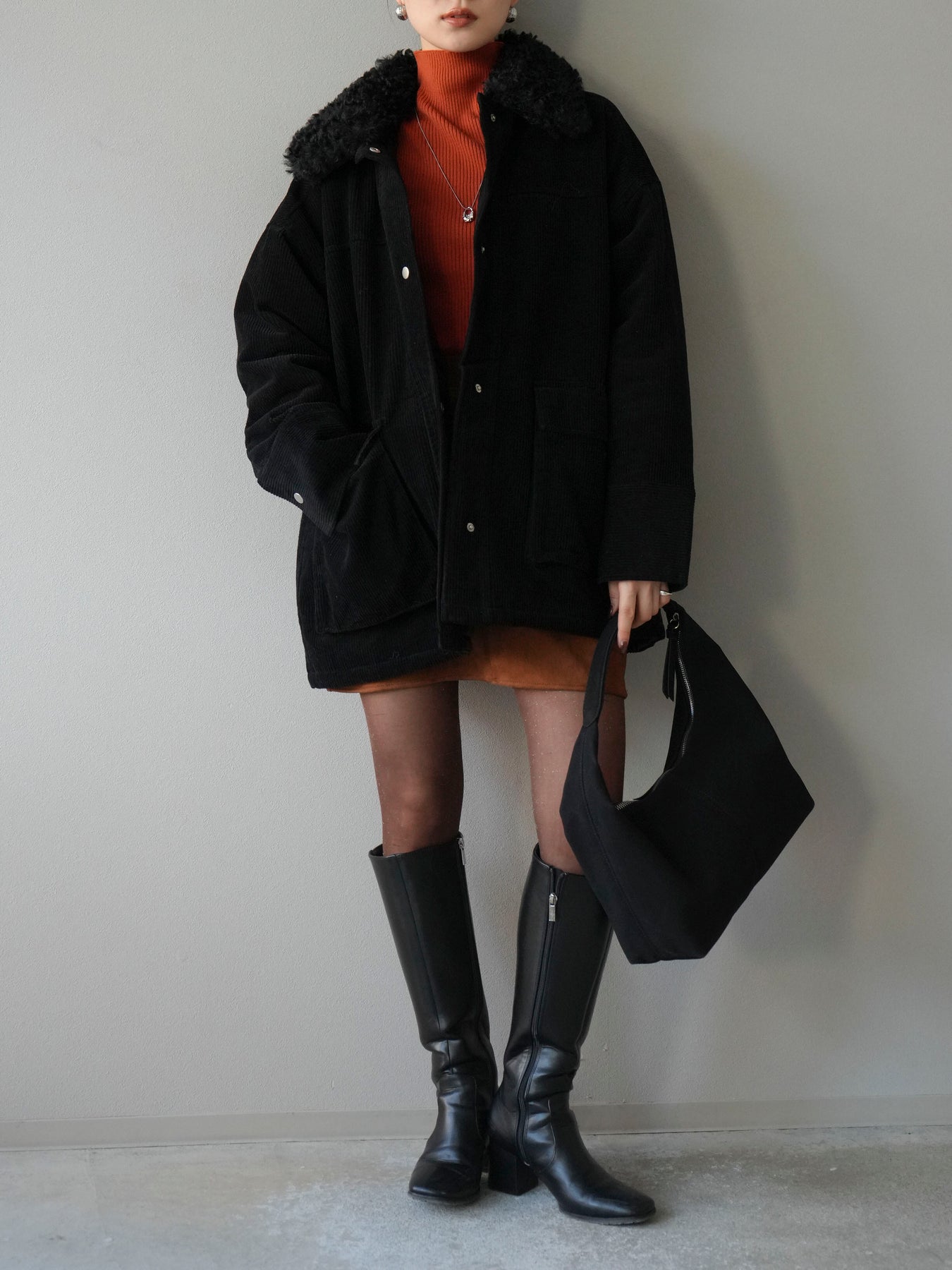 マットな質感のフェイクレザーにコーデュロイ襟を組み合わせたステンカラージャケット。異素材のコントラストがクラシカルな雰囲気を引き立てつつ、シンプルなシルエットでデイリーに取り入れやすい一着です。ヒップまで隠れるミドル丈で防寒性もあり、パンツにもスカートにも好相性。羽織るだけでスタイリングが引き締まり、モード感と大人の余裕を漂わせてくれます。秋冬のアウターとしてワードローブに加えたい万能アイテムです。 ※ボトムス、キャミソール(インナー)以外の商品は一律でインナーは付属していません。