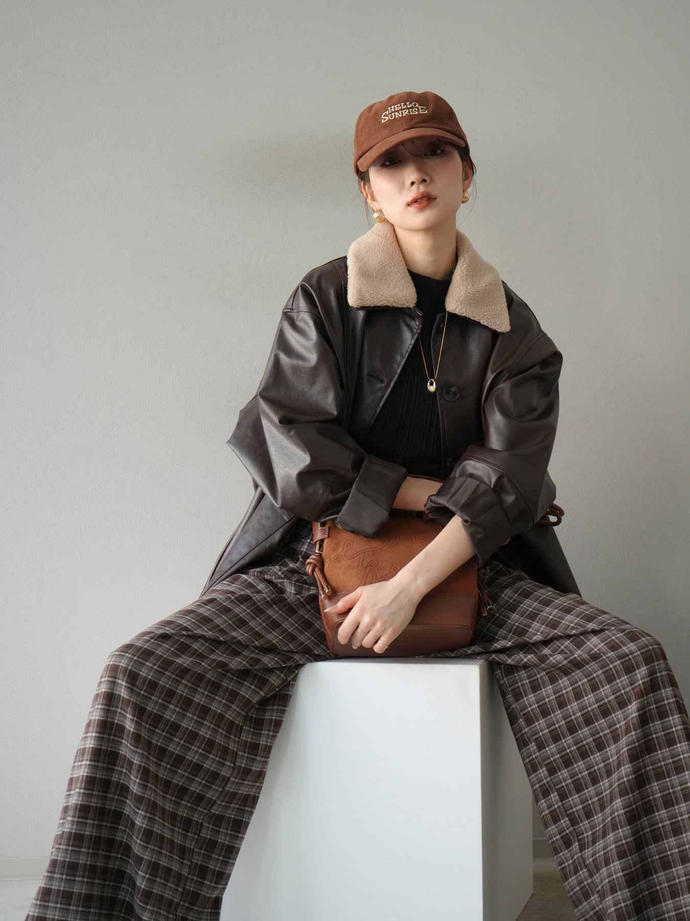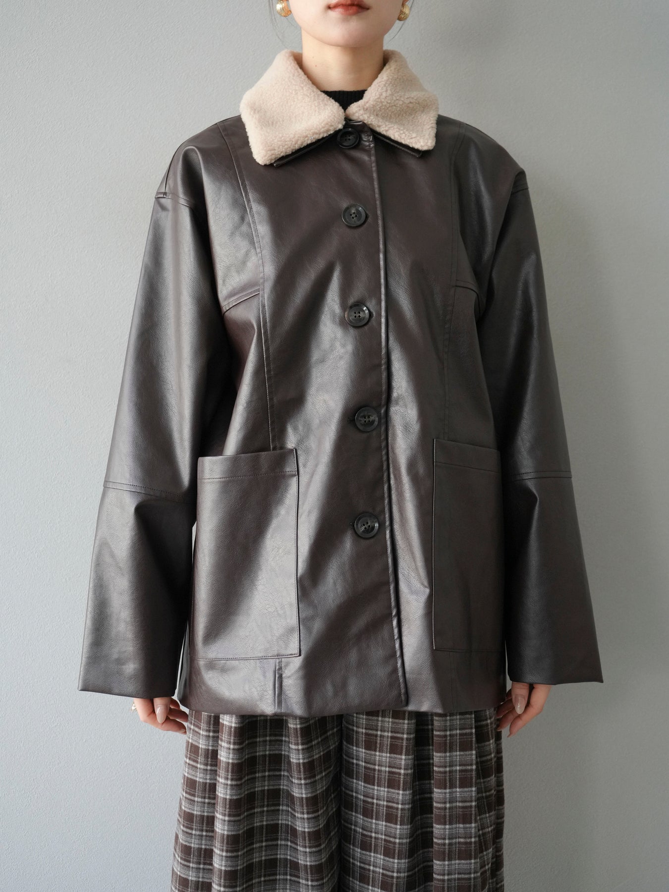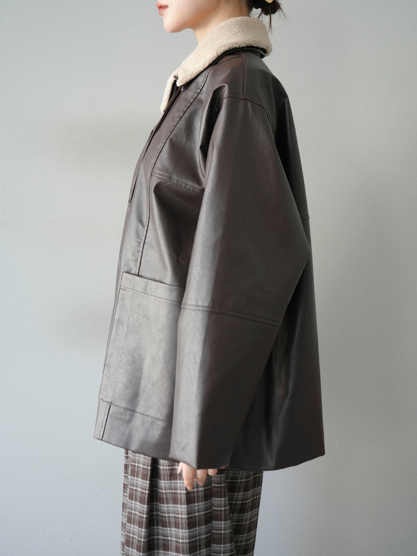 レザーの重厚感にボア襟を組み合わせたブルゾンは、シーズンムードを高める存在感のある一着。程よいオーバーシルエットが抜け感を与えつつ、ボア襟がやわらかな印象をプラスします。フロントのボタンや大きめのポケットがアクセントとなり、デザイン性と実用性を兼備。羽織るだけでスタイリングを引き締め、カジュアルにもきれいめにもマッチする万能アウターです。 ※ボトムス、キャミソール(インナー)以外の商品は一律でインナーは付属していません。