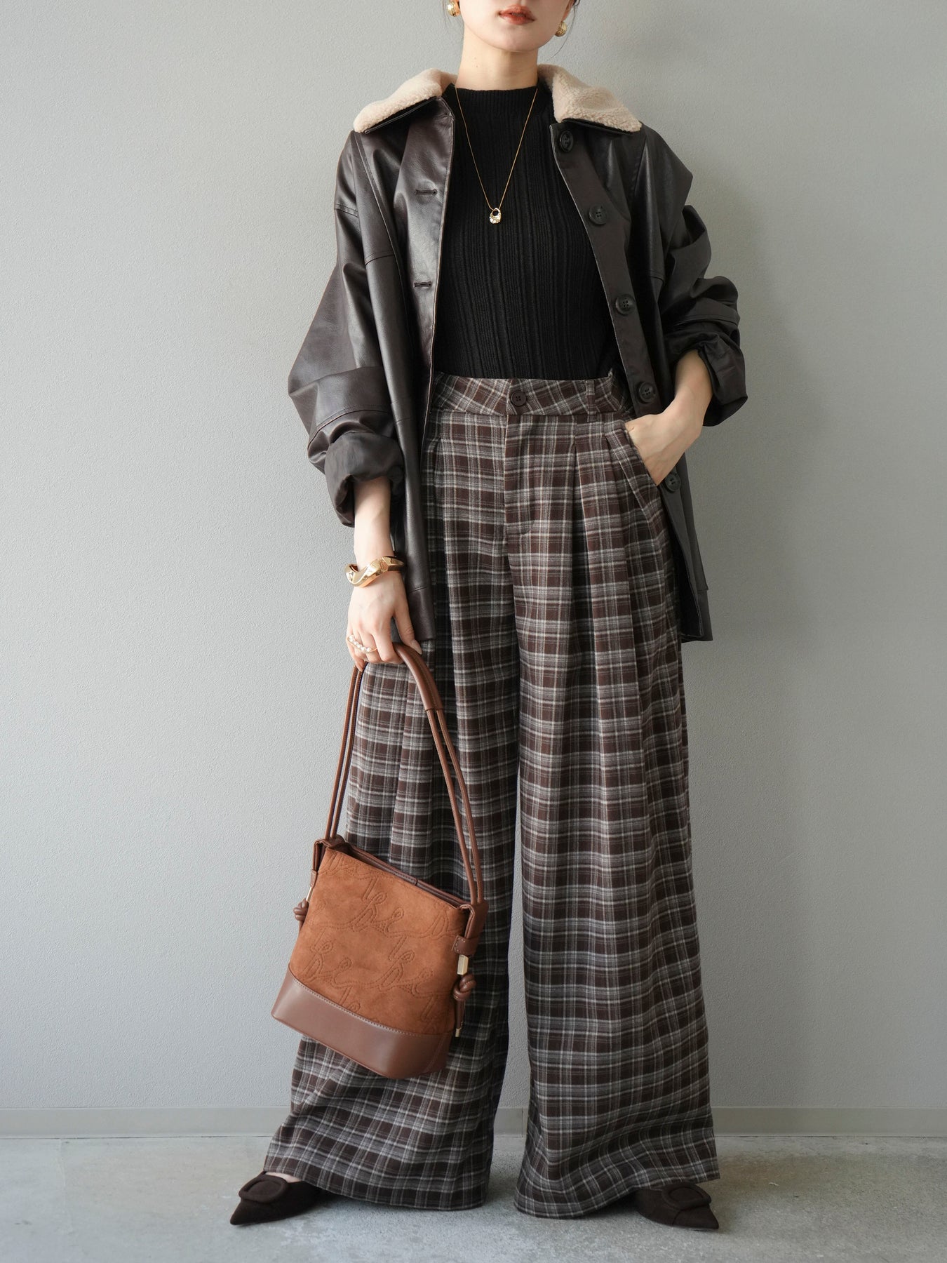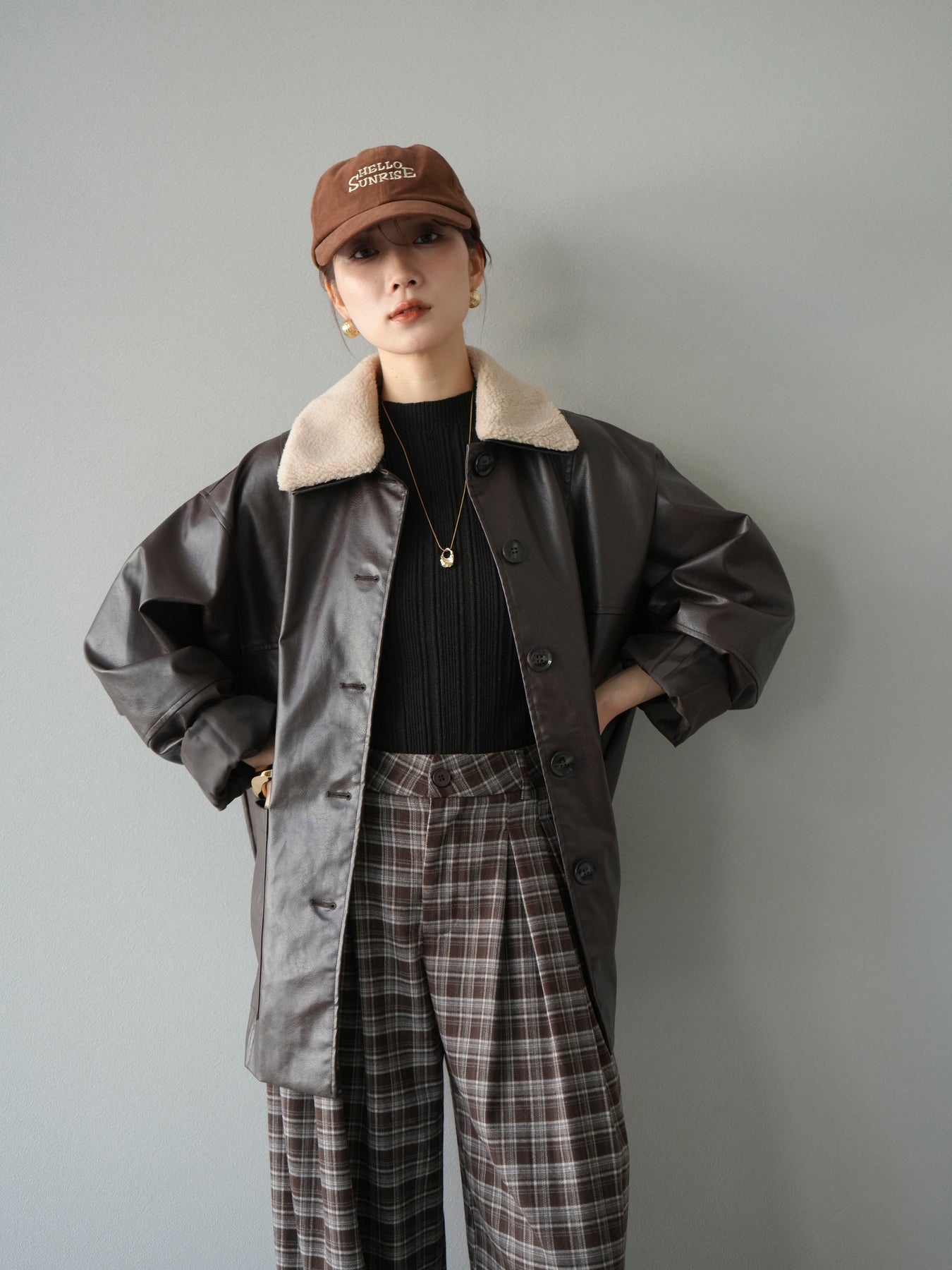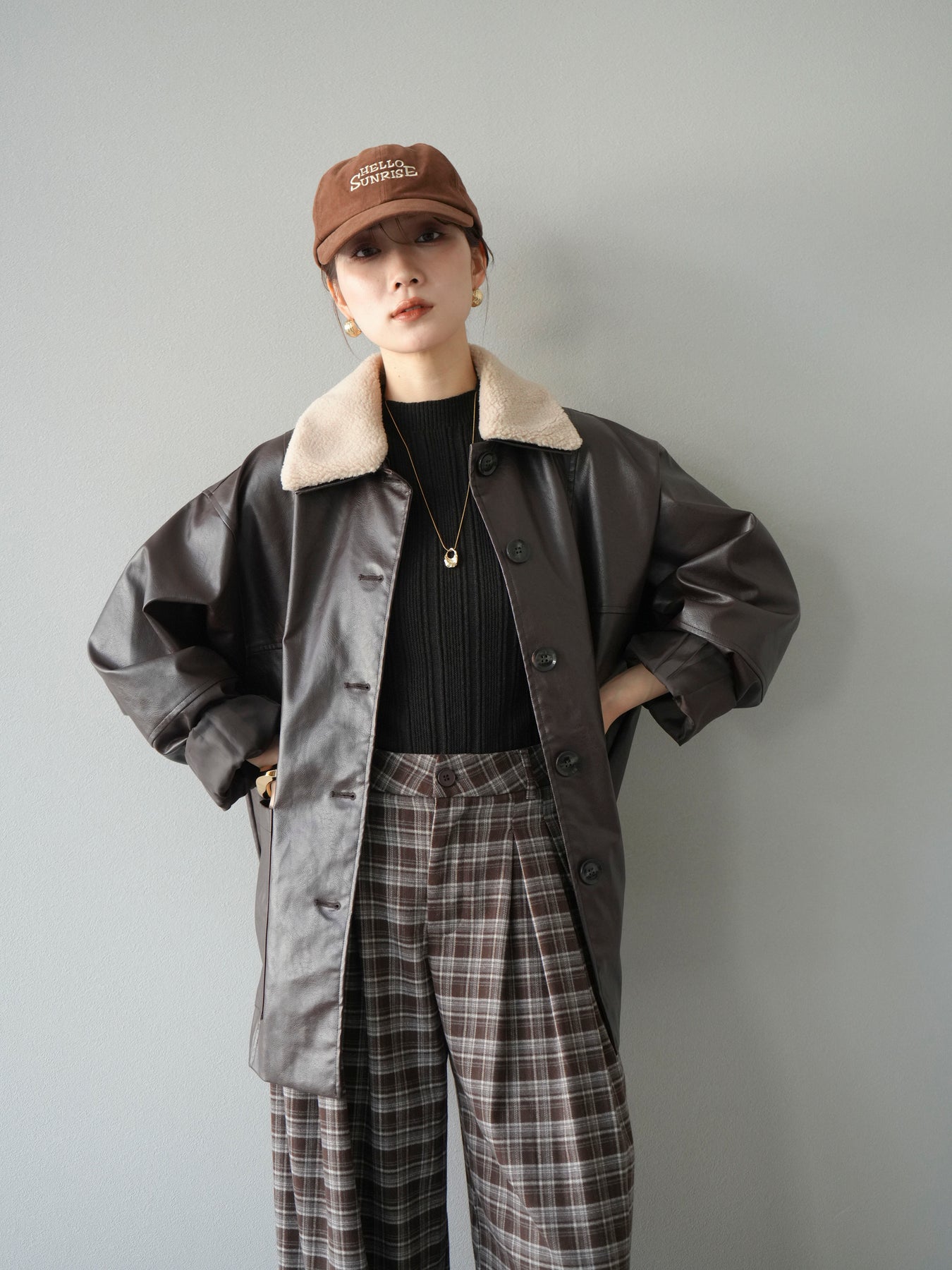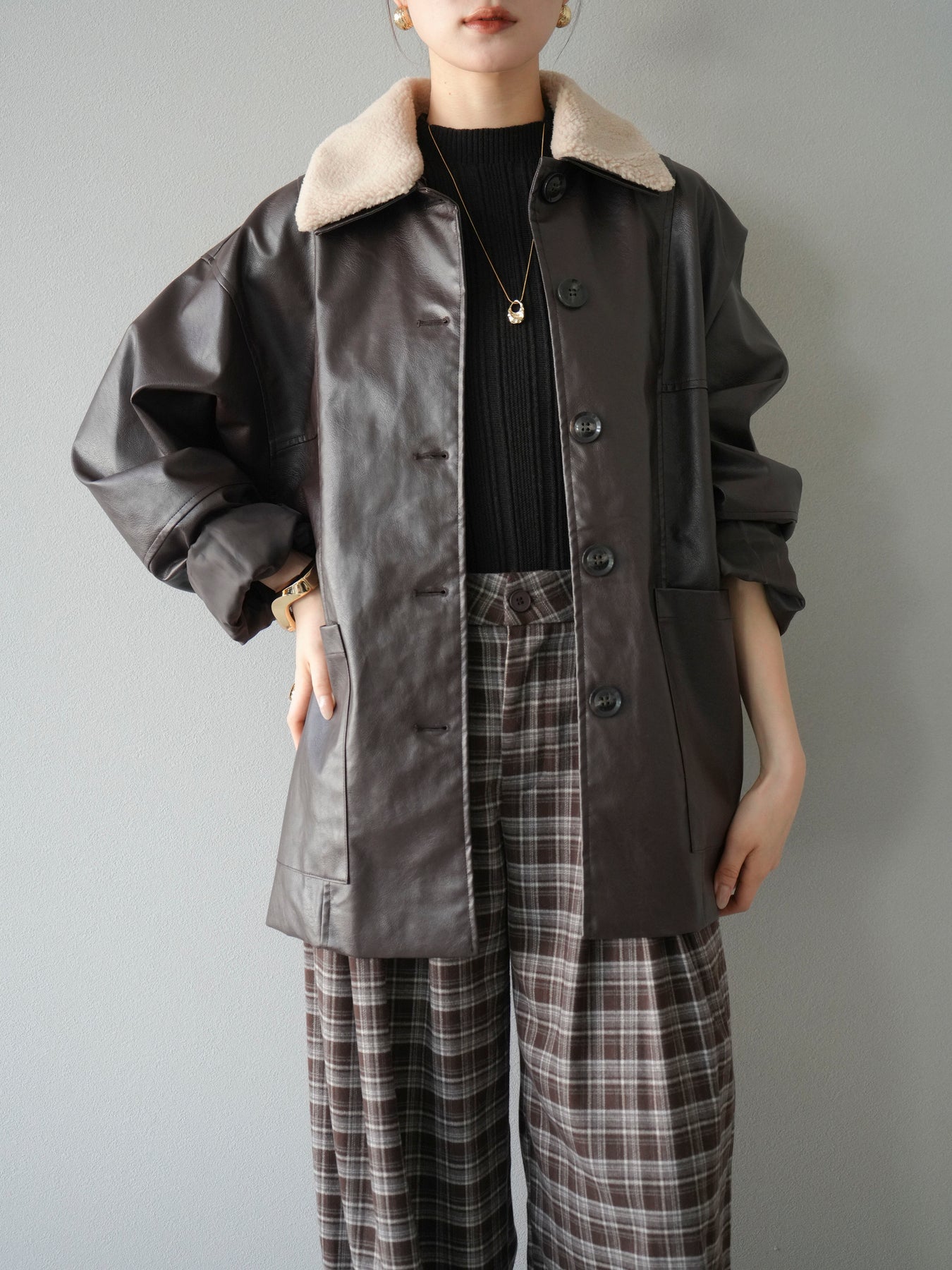 レザーの重厚感にボア襟を組み合わせたブルゾンは、シーズンムードを高める存在感のある一着。程よいオーバーシルエットが抜け感を与えつつ、ボア襟がやわらかな印象をプラスします。フロントのボタンや大きめのポケットがアクセントとなり、デザイン性と実用性を兼備。羽織るだけでスタイリングを引き締め、カジュアルにもきれいめにもマッチする万能アウターです。 ※ボトムス、キャミソール(インナー)以外の商品は一律でインナーは付属していません。