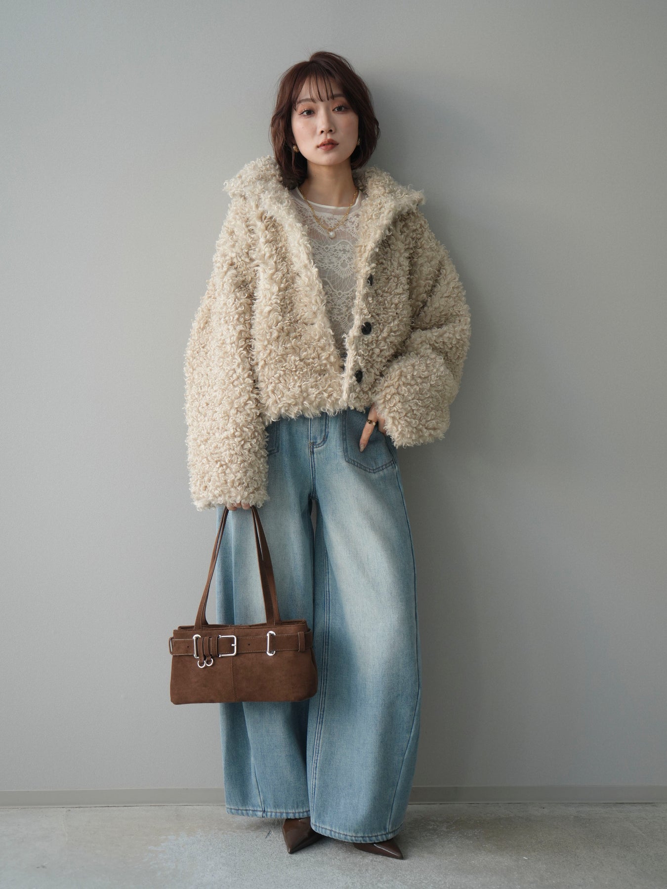 プードルファーの立体的な素材感が印象的なミドル丈ブルゾン。スタンドカラー仕様で首元まで包み込み、程よいボリューム感がコーディネートに存在感をプラスします。パンツにもスカートにも合わせやすく、季節感のある着こなしが完成する一着です。