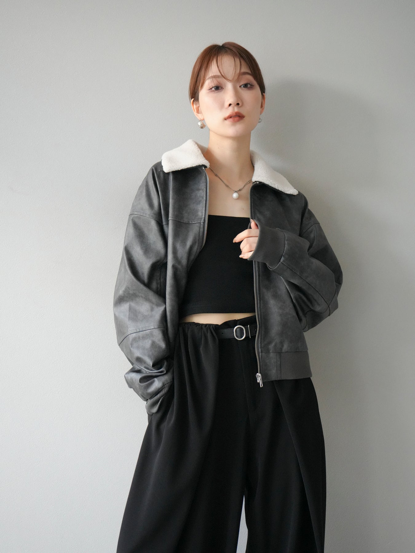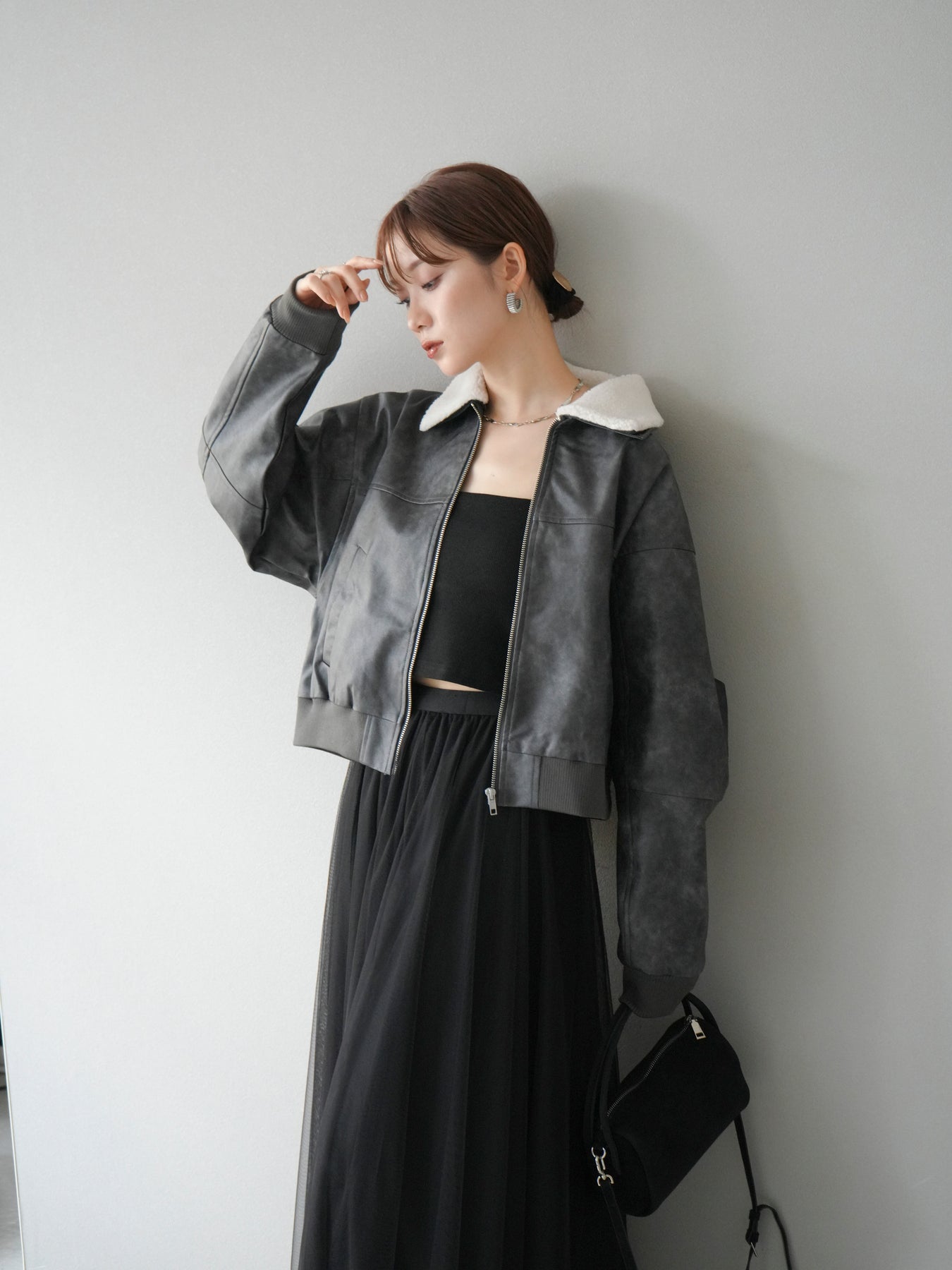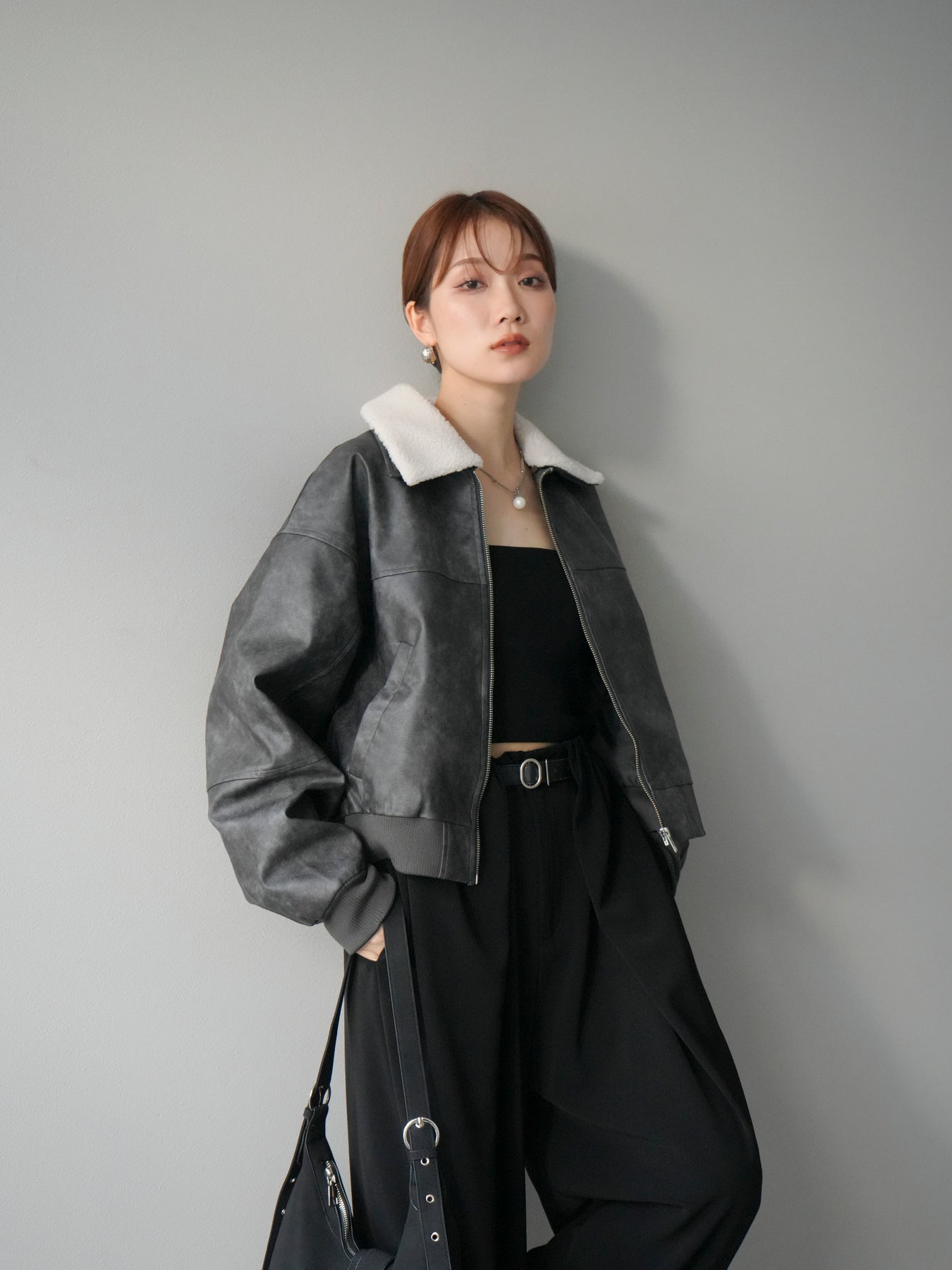 ヴィンテージ感のあるレザー調素材にボア襟をあしらった、存在感抜群のブルゾン。衿元のボアが暖かみと柔らかさをプラスし、シーズンムードを高めてくれます。程よいオーバーシルエットで、インナーにニットやスウェットを重ねてもバランス良く着こなせるのも魅力。ジップ仕様で着脱も簡単、羽織るだけでコーディネートを引き締めてくれる一着です。カジュアルスタイルにはもちろん、スカートやワンピースに合わせてミックス感を楽しむのもおすすめ。 ※ボトムス、キャミソール(インナー)以外の商品は一律でインナーは付属していません。