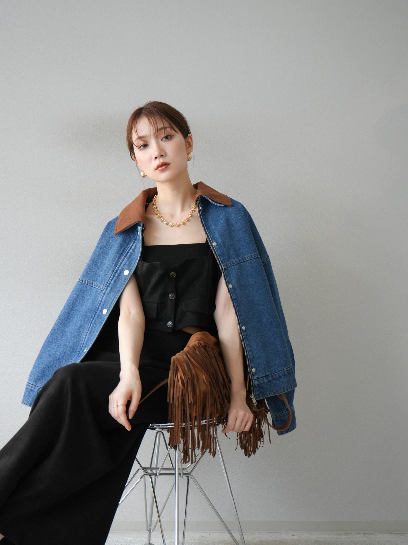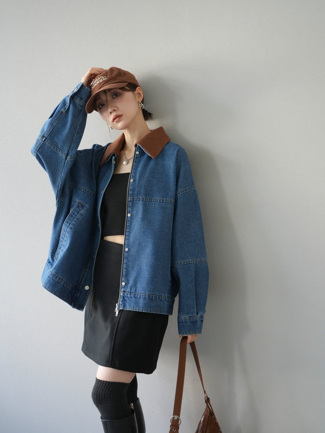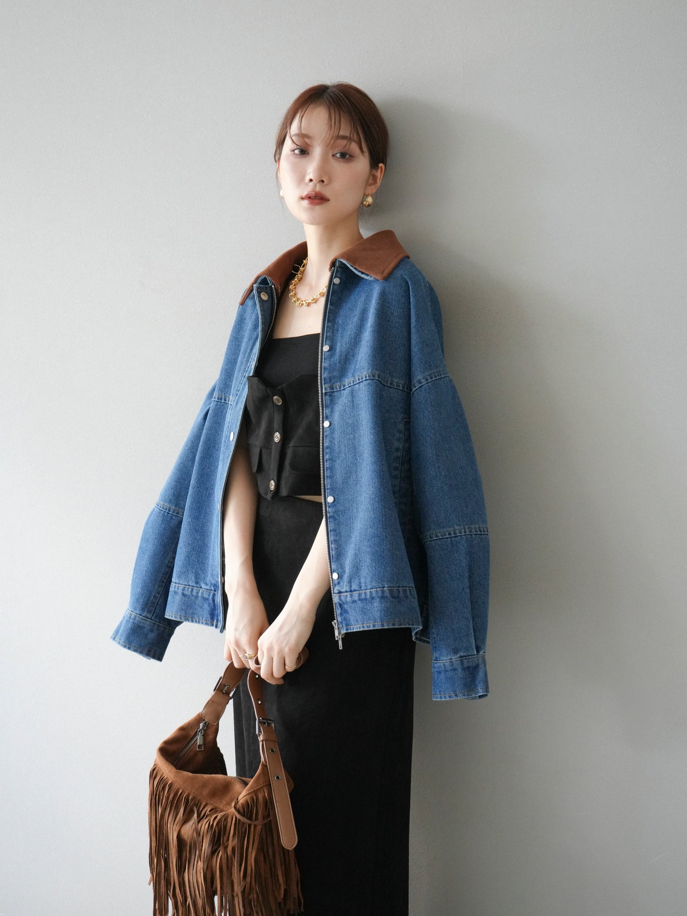 デニム素材にスウェード調の襟を組み合わせた、表情豊かなデザインブルゾン。カジュアルな印象のデニムに異素材をミックスすることで、ワンランク上のスタイリングを楽しめる一着です。ゆとりのあるシルエットでインナーを選ばず、季節の変わり目に活躍。ジップ仕様で着脱も簡単、羽織るだけでコーディネートの主役になります。パンツにもスカートにも合わせやすく、デイリーから休日のお出かけまで幅広く対応できる万能アイテムです。 ※ボトムス、キャミソール(インナー)以外の商品は一律でインナーは付属していません。