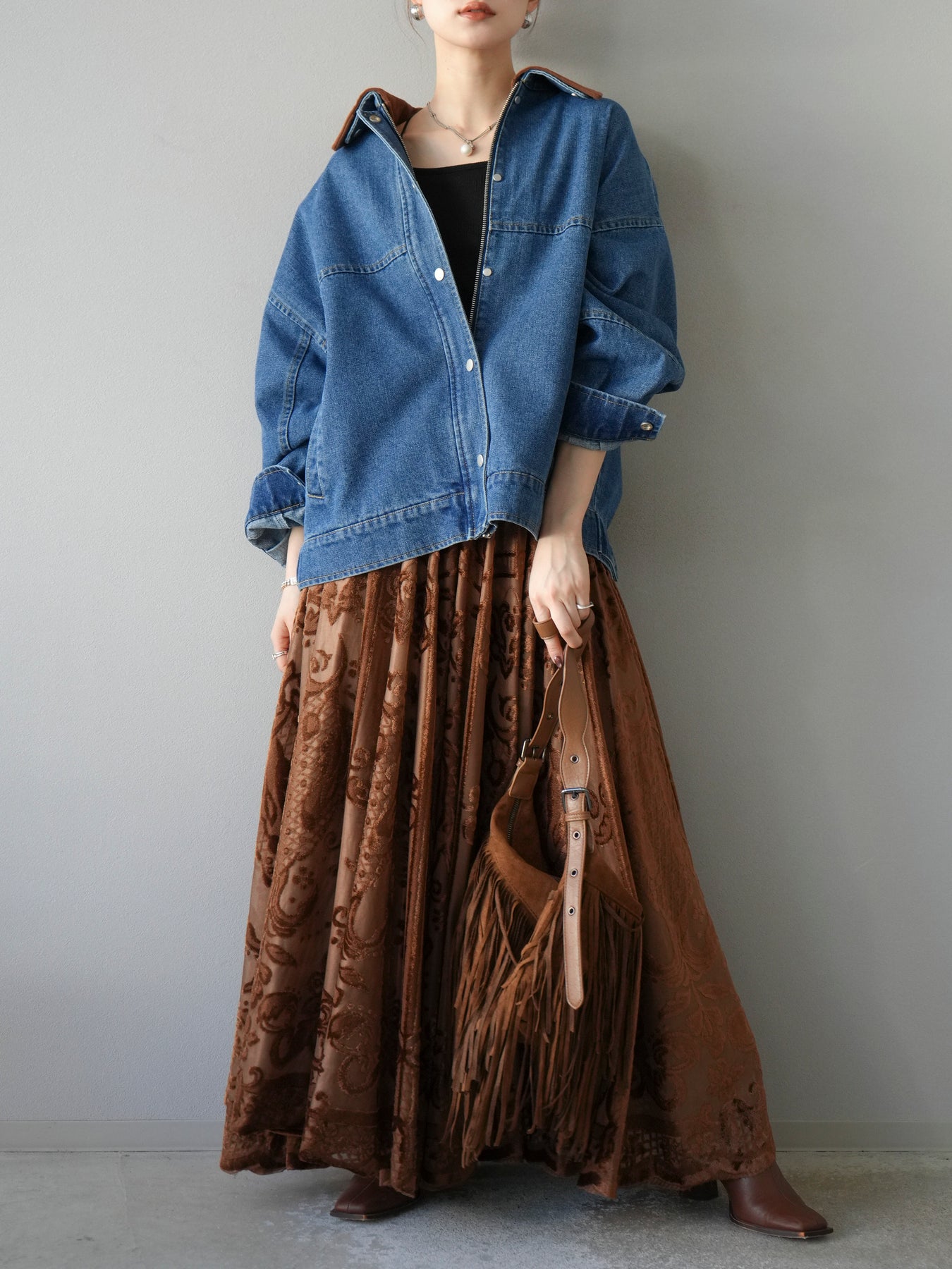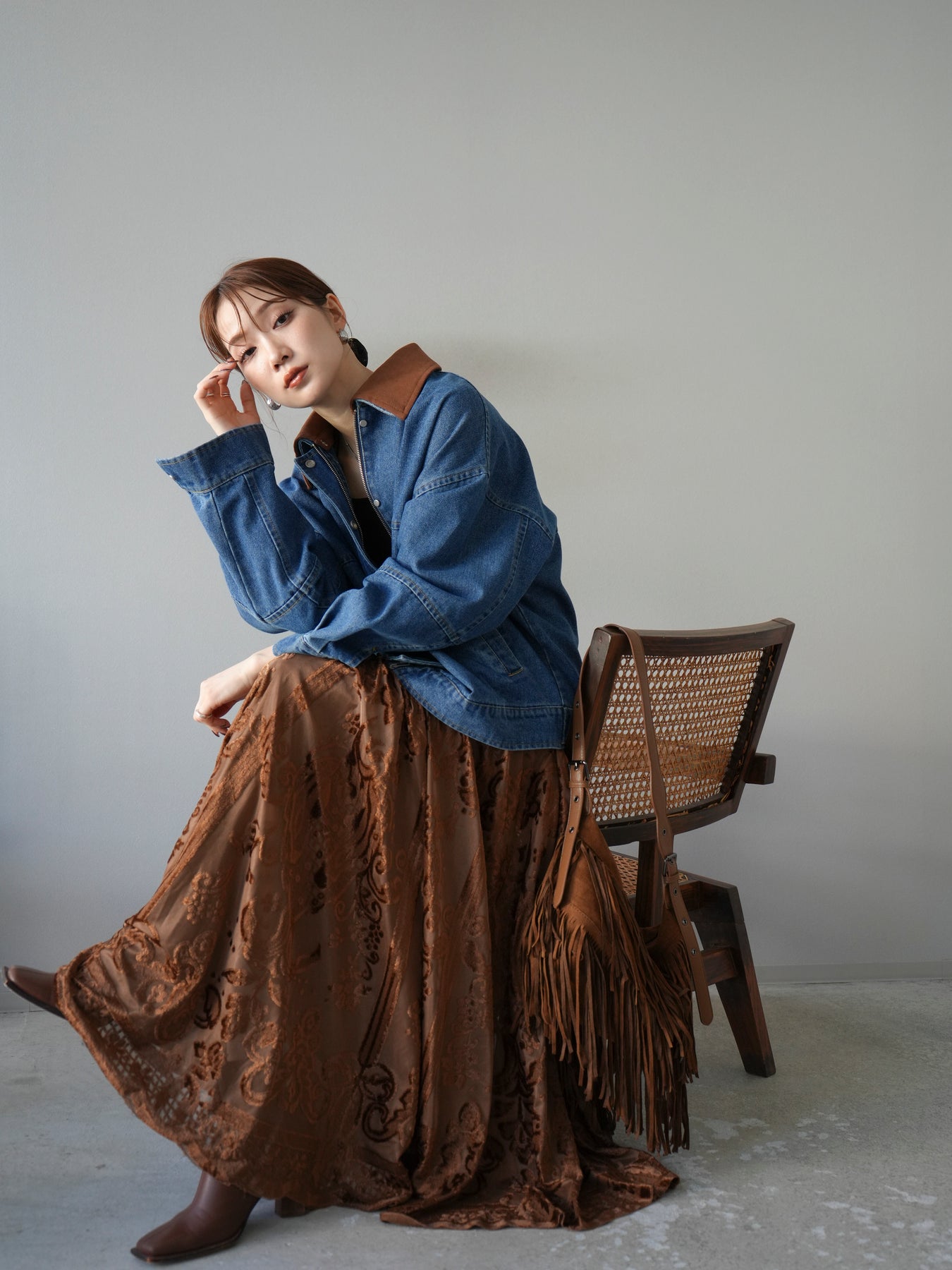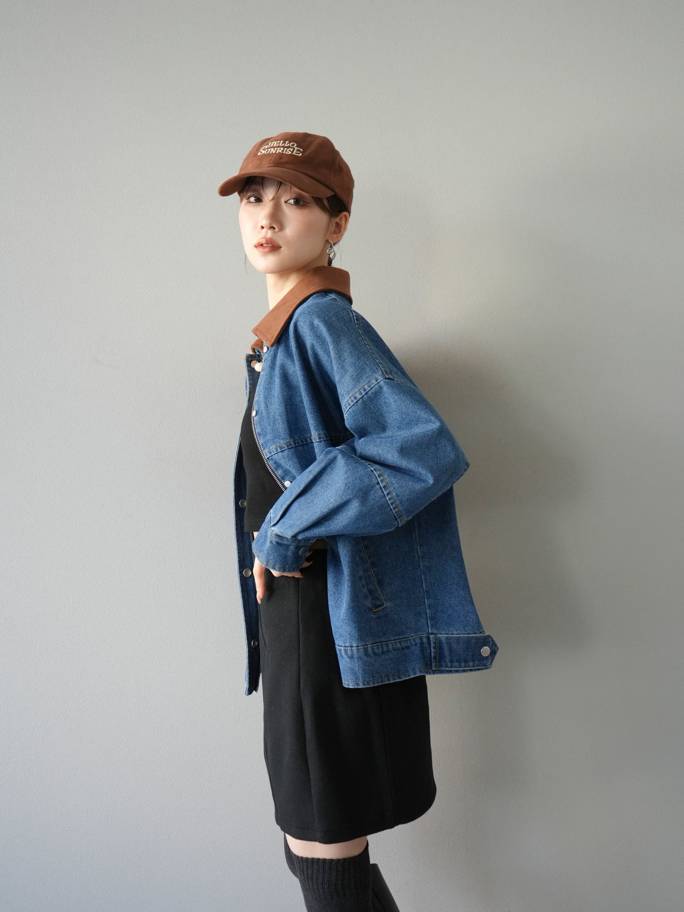 デニム素材にスウェード調の襟を組み合わせた、表情豊かなデザインブルゾン。カジュアルな印象のデニムに異素材をミックスすることで、ワンランク上のスタイリングを楽しめる一着です。ゆとりのあるシルエットでインナーを選ばず、季節の変わり目に活躍。ジップ仕様で着脱も簡単、羽織るだけでコーディネートの主役になります。パンツにもスカートにも合わせやすく、デイリーから休日のお出かけまで幅広く対応できる万能アイテムです。 ※ボトムス、キャミソール(インナー)以外の商品は一律でインナーは付属していません。