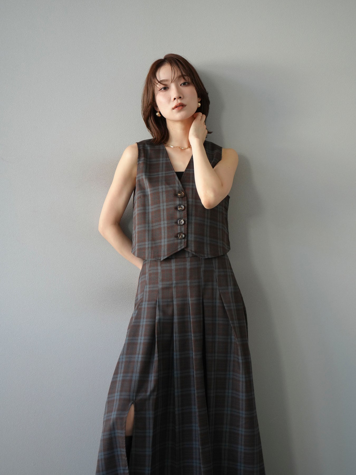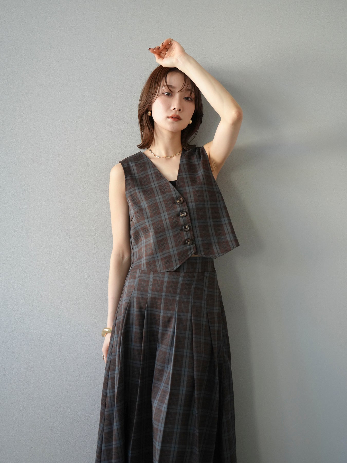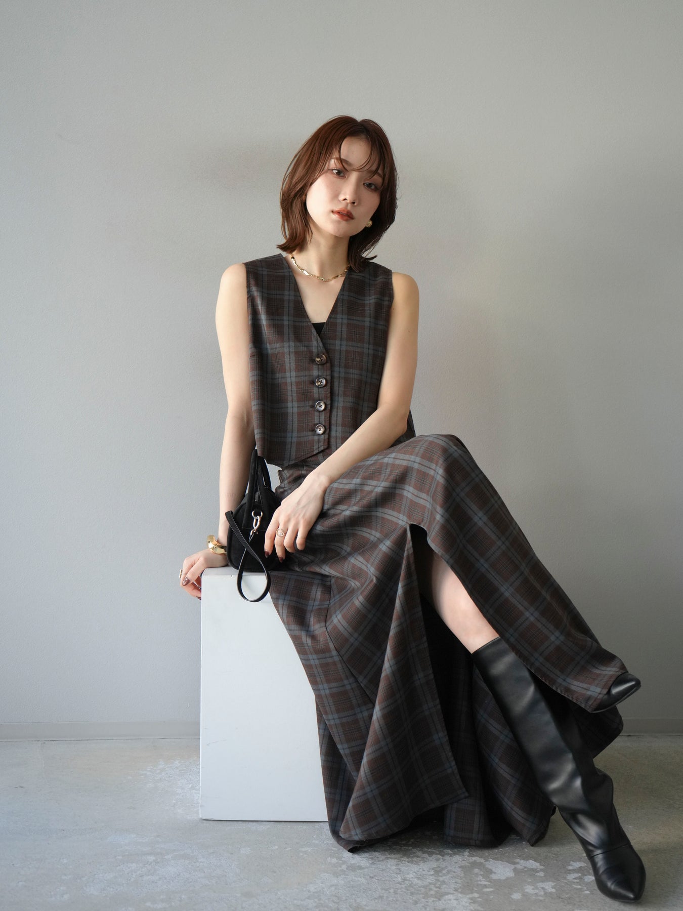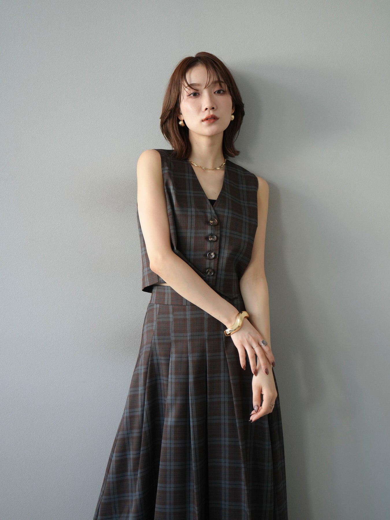 クラシカルなチェック柄で仕上げたベスト。深めのVネックとフロントボタンがシャープな印象を与え、すっきりとしたシルエットでスタイリングを引き締めます。シャツやブラウスにレイヤードすればトラッド感のある着こなしに、Tシャツやカットソーと合わせればカジュアルダウンも可能。同柄のジャケットやパンツと組み合わせて、セットアップ風にコーディネートするのもおすすめです。シーズンを問わず幅広く活躍する万能アイテム。 ※ボトムス、キャミソール(インナー)以外の商品は一律でインナーは付属していません。